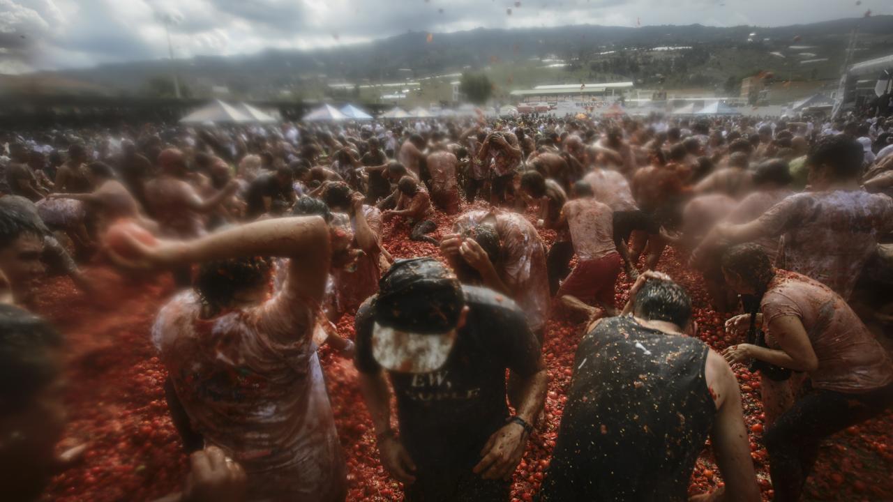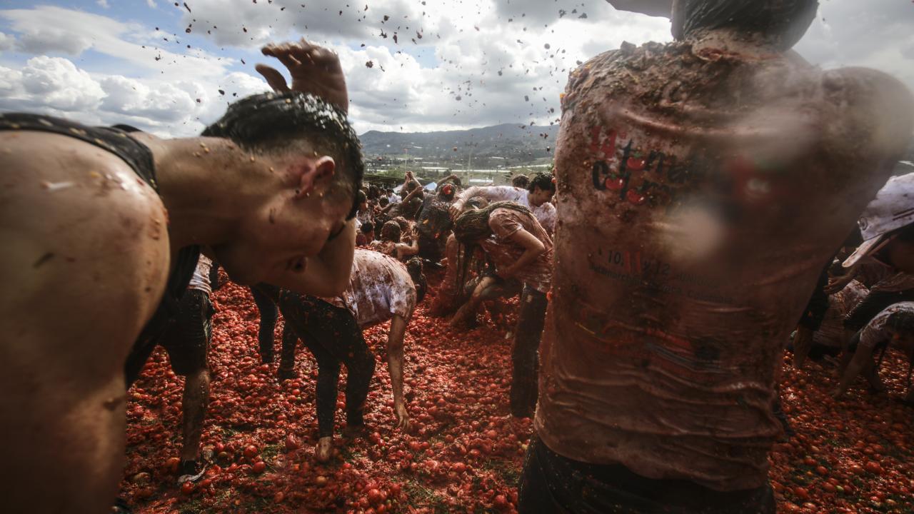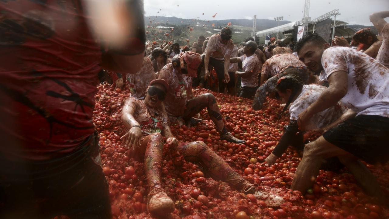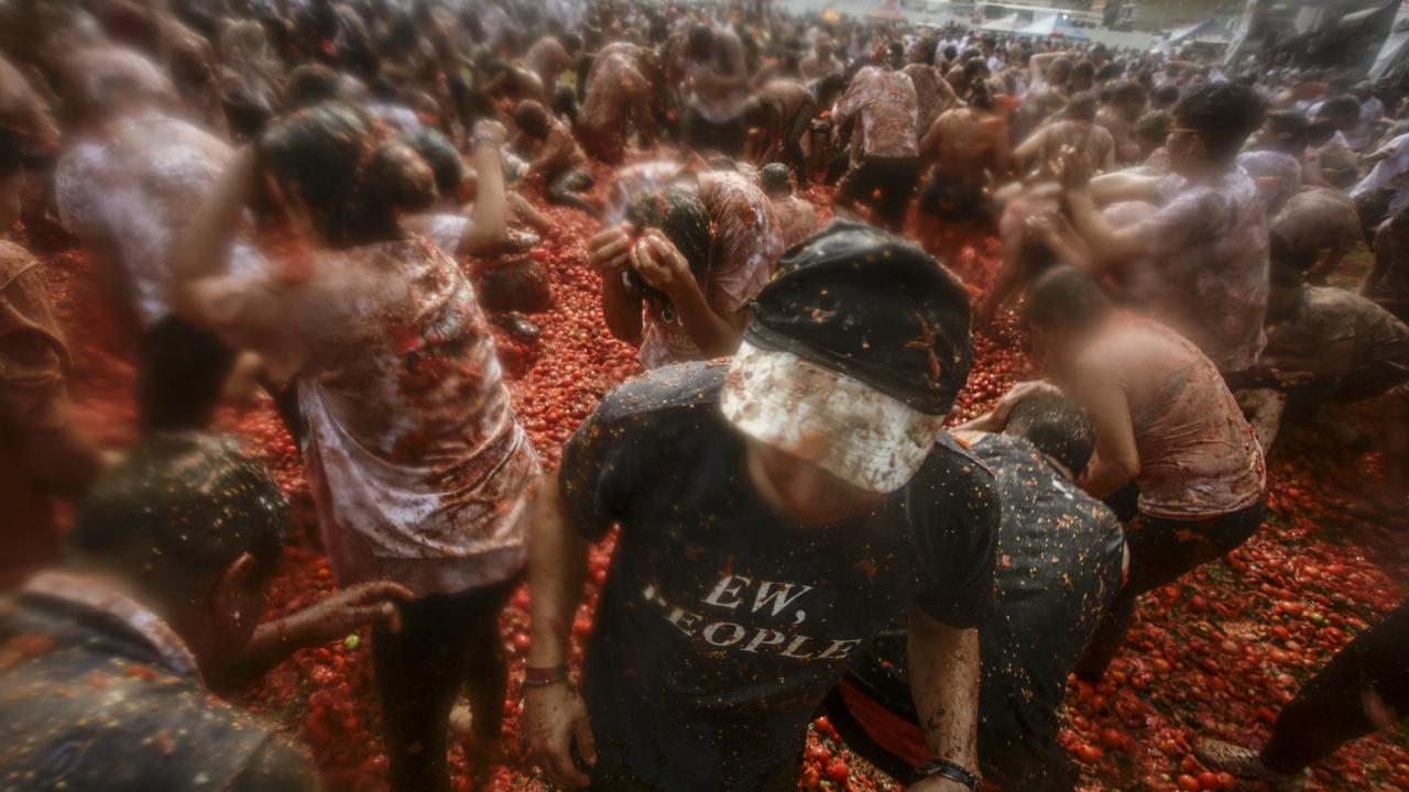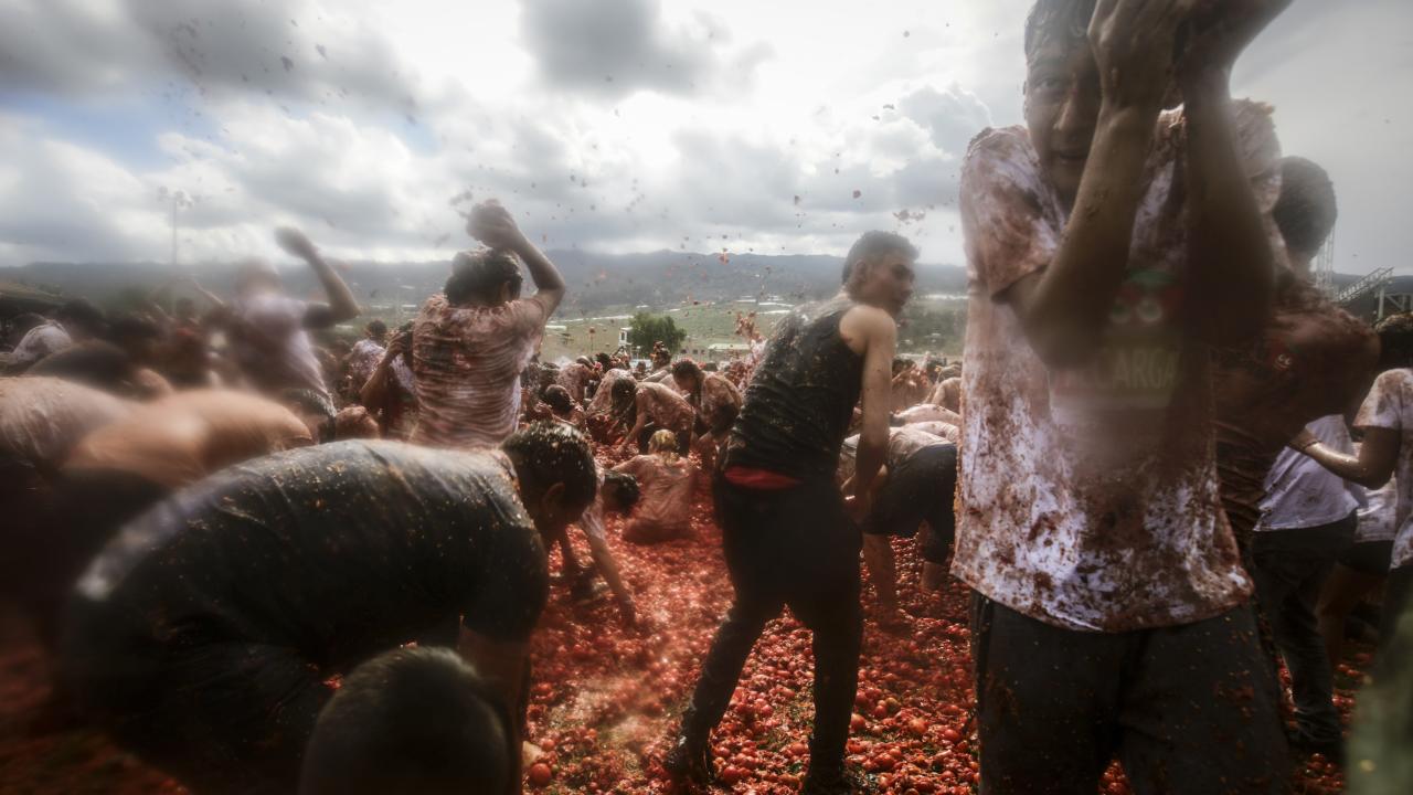 Bölgedeki çiftçilerce bağışlanan ve kamyonlarla festival alanına getirilen tonlarca domates, katılımcıları kırmızıya boyadı.