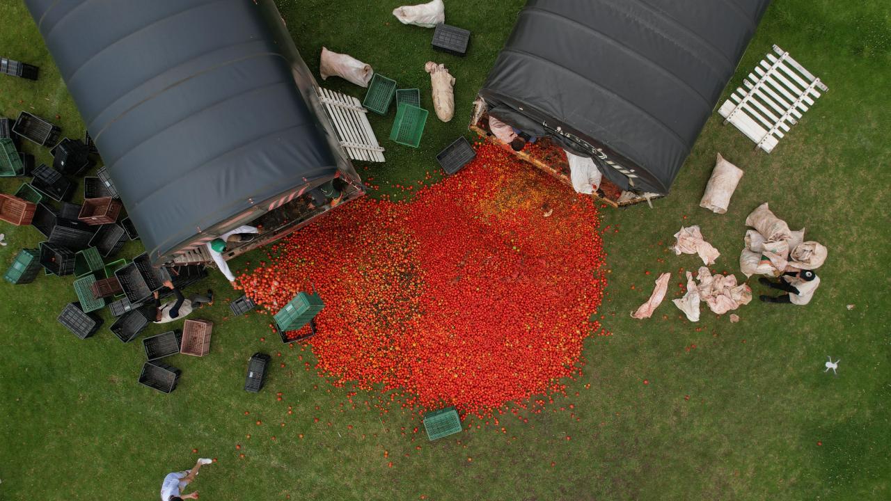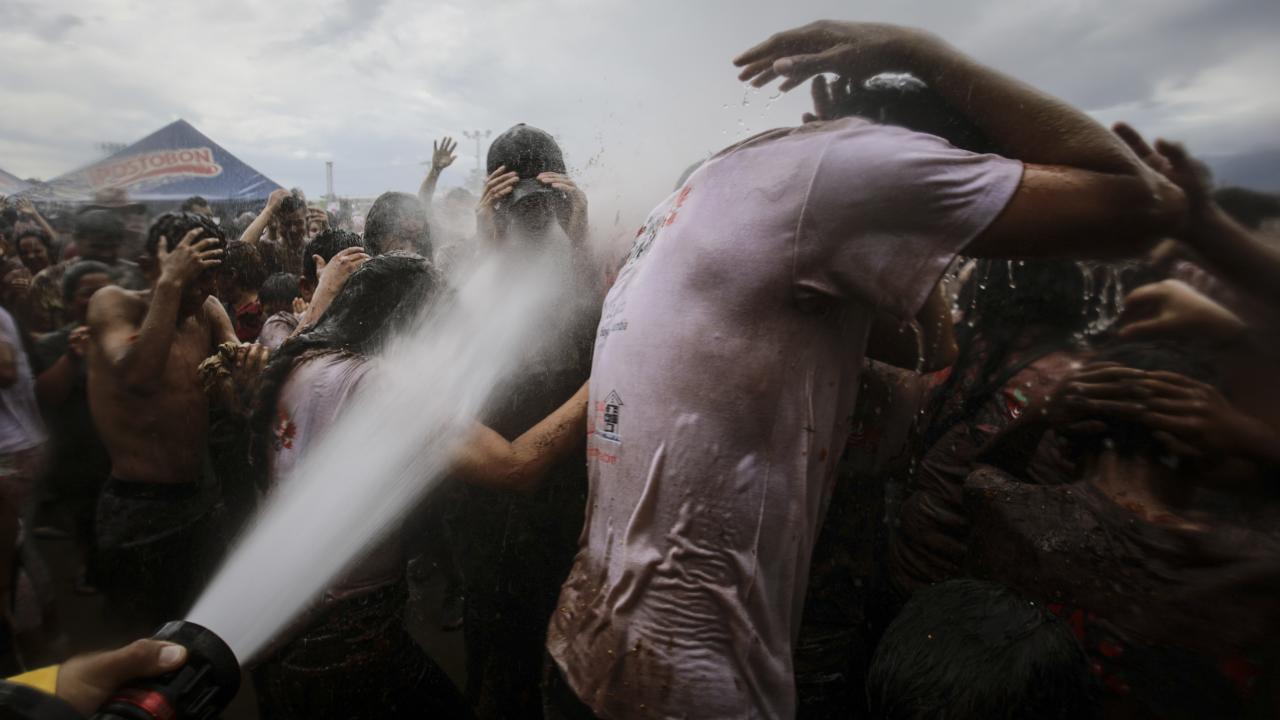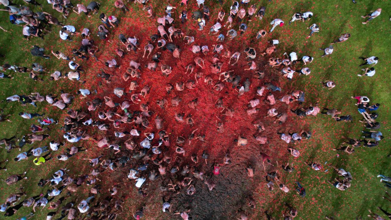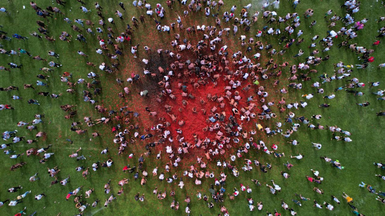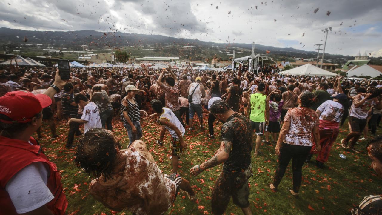 Bölgedeki çiftçilerce bağışlanan ve kamyonlarla festival alanına getirilen tonlarca domates, katılımcıları kırmızıya boyadı.