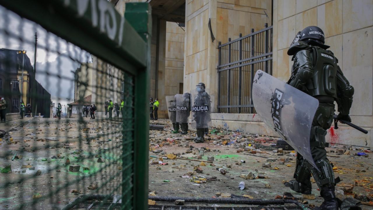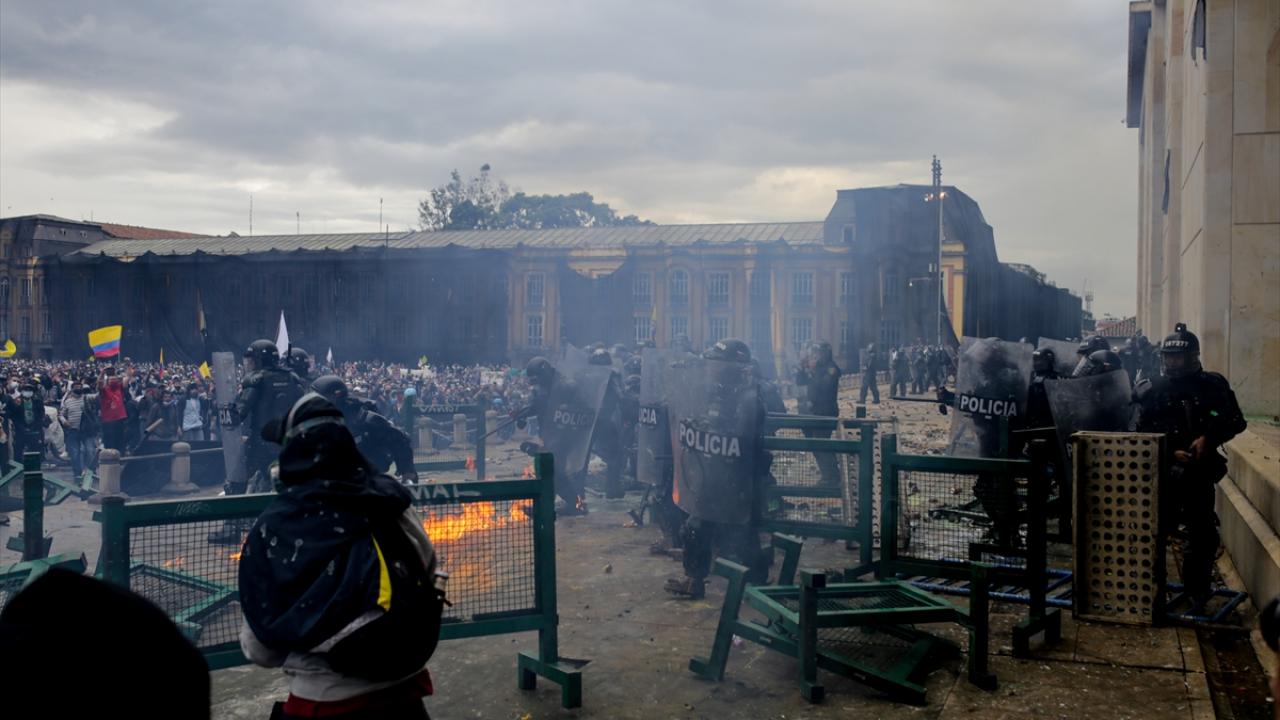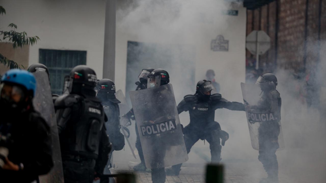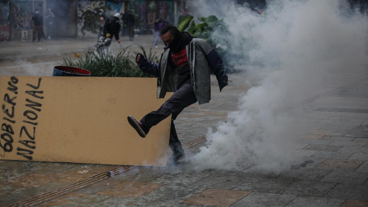 Kolombiya toplumsal olaylara müdahale birimi ESMAD mensubu polisler, yolda ateş yakan, çevredeki iş yerlerine ve araçlara zarar veren bazı protestoculara göz yaşartıcı gazla müdahalede bulundu.