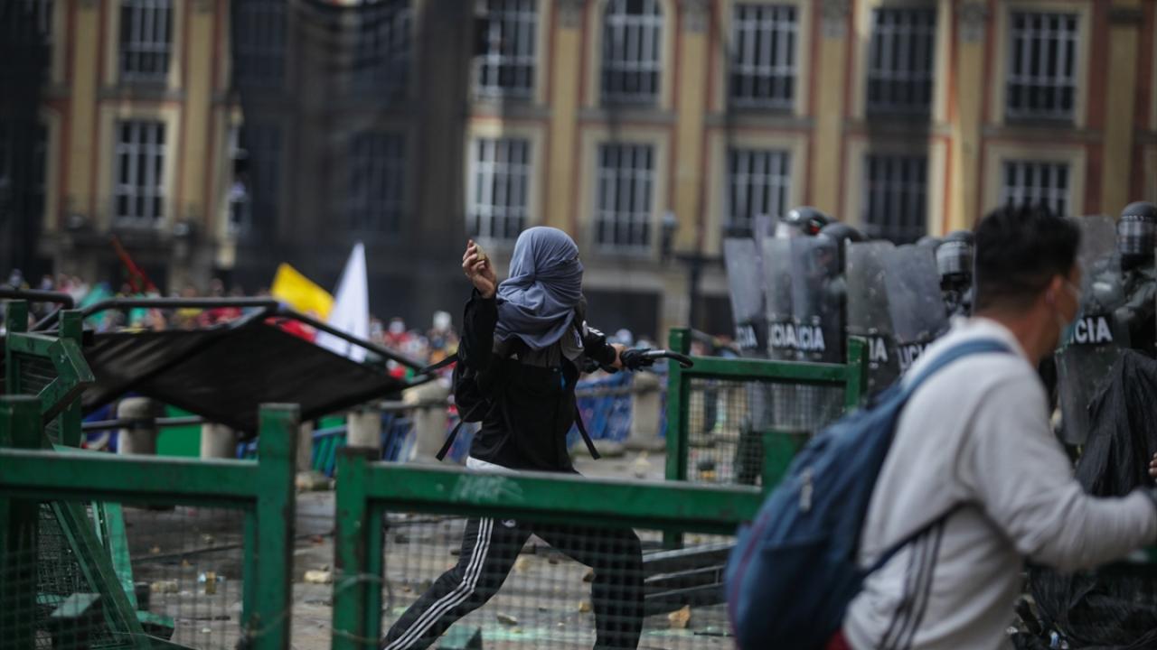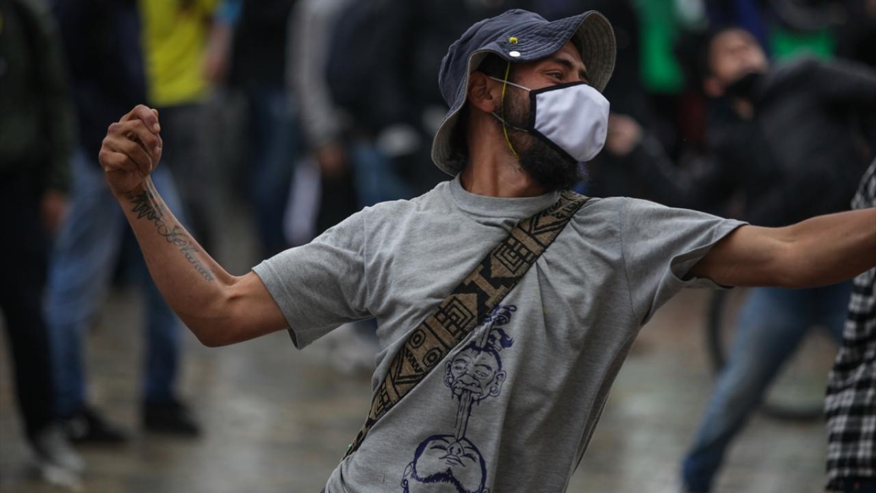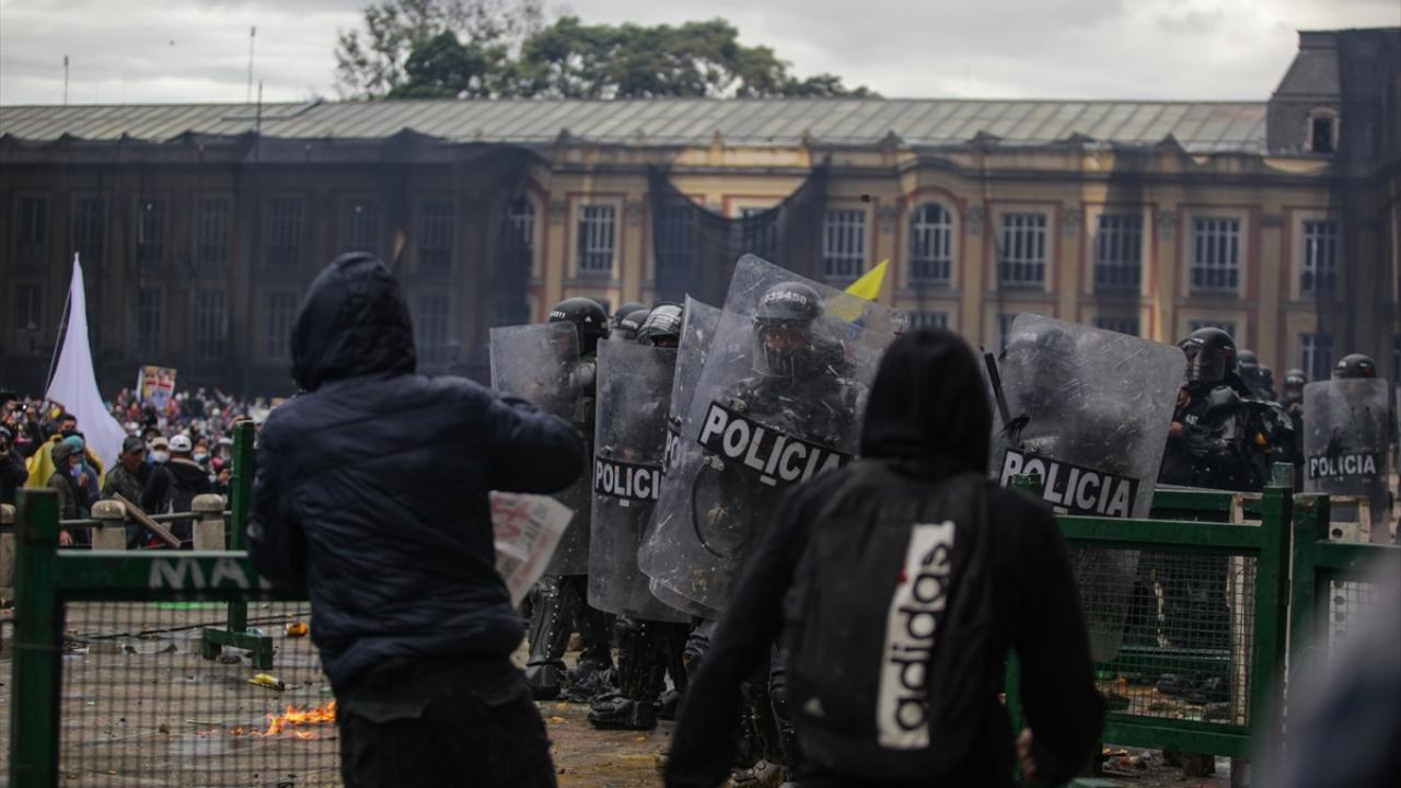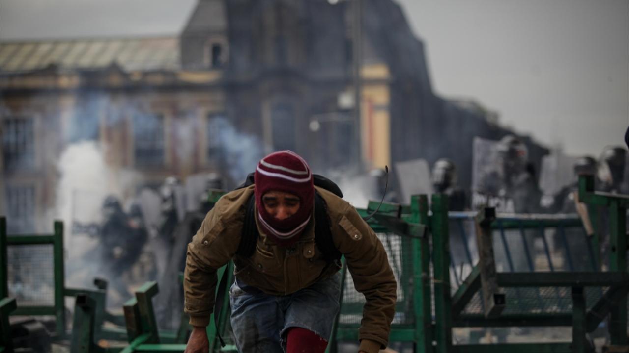 Kolombiya toplumsal olaylara müdahale birimi ESMAD mensubu polisler, yolda ateş yakan, çevredeki iş yerlerine ve araçlara zarar veren bazı protestoculara göz yaşartıcı gazla müdahalede bulundu.
