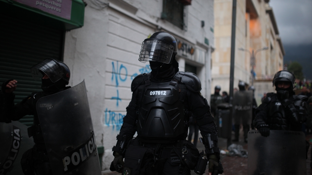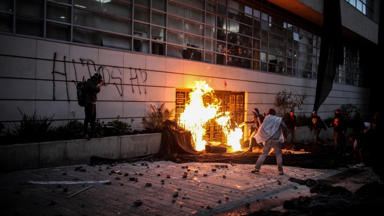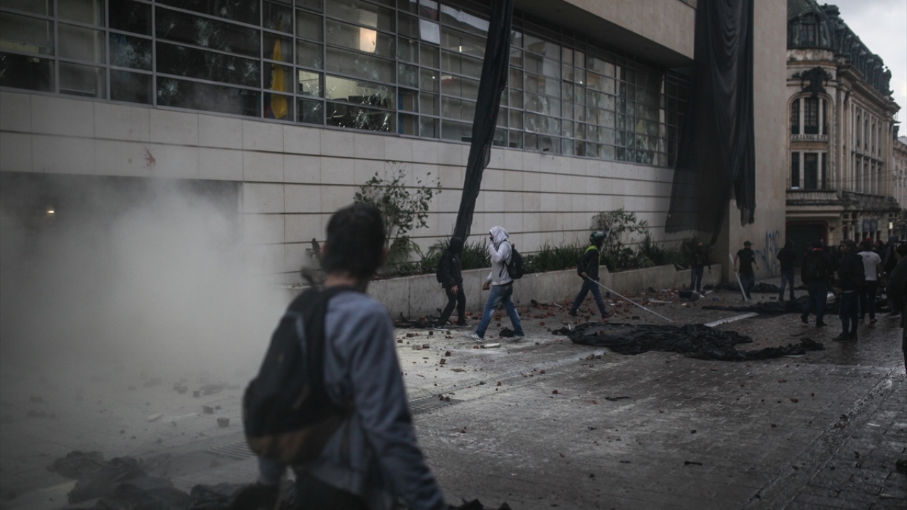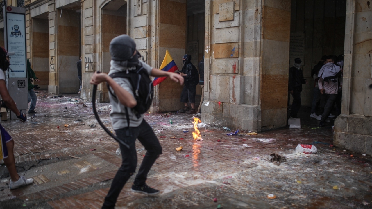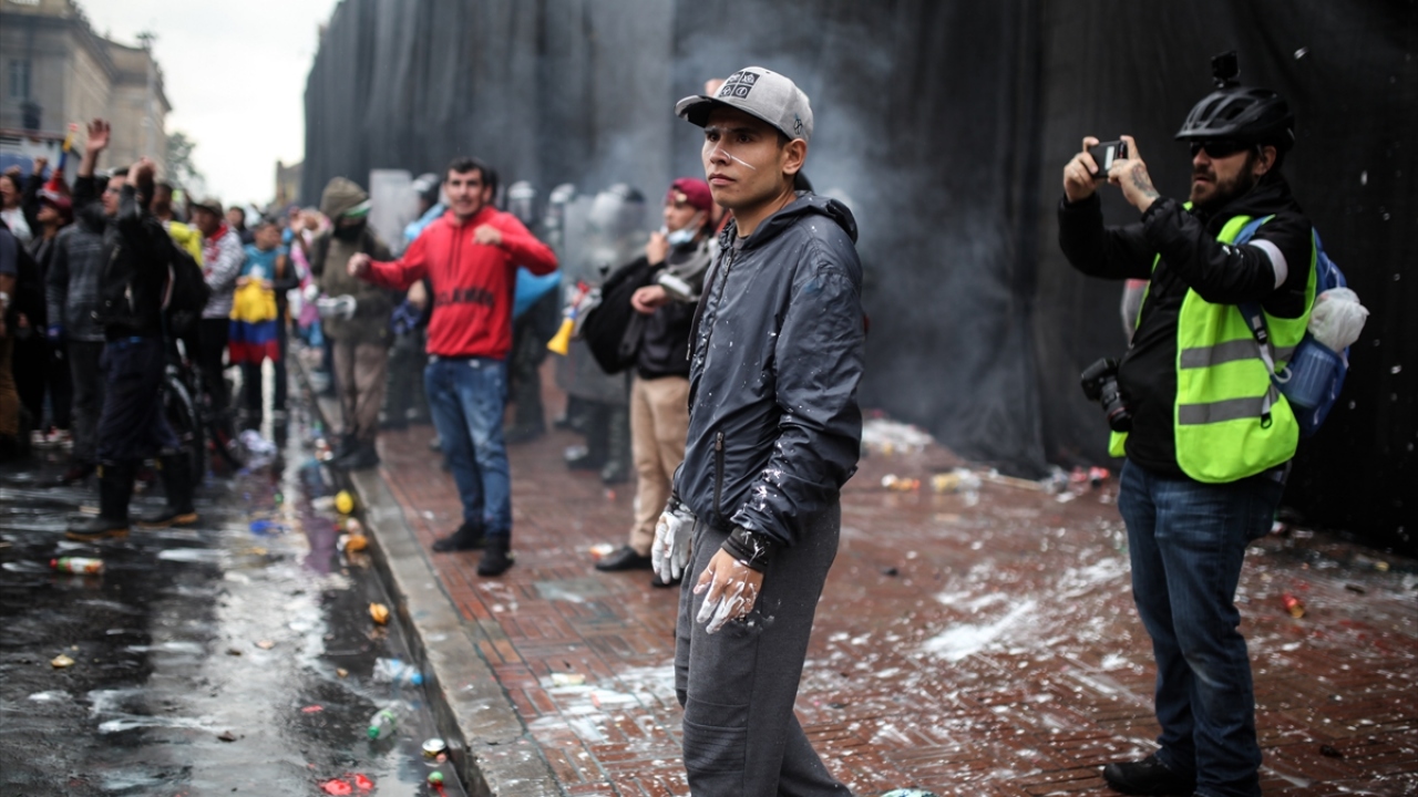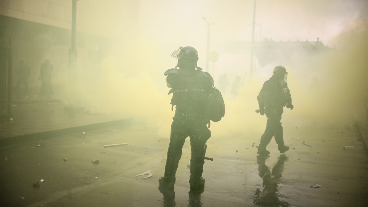 Taş ve molotofkokteyli atan göstericilere Kolombiya çevik kuvvet polisi ESMAD da göz yaşartıcı gaz ile müdahale ediyor.
