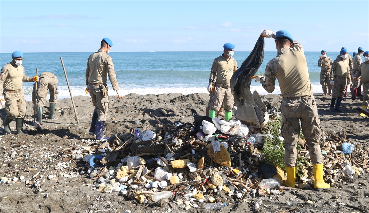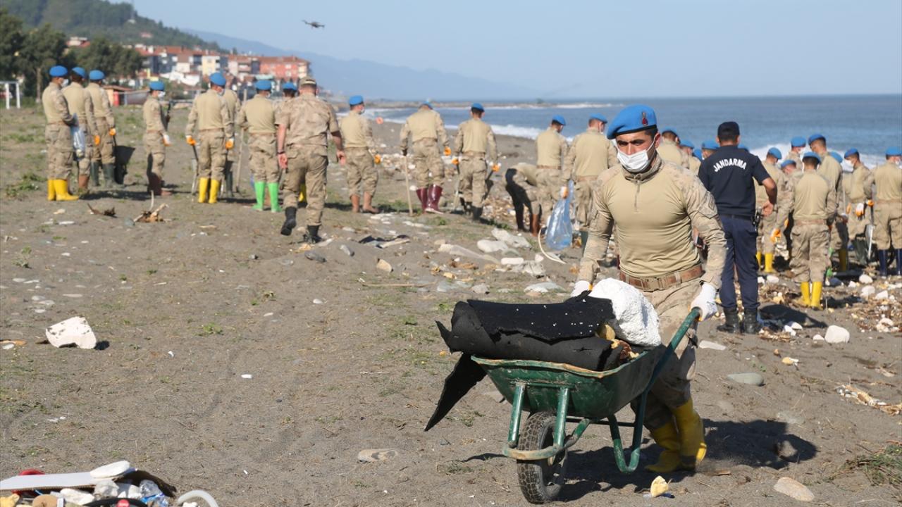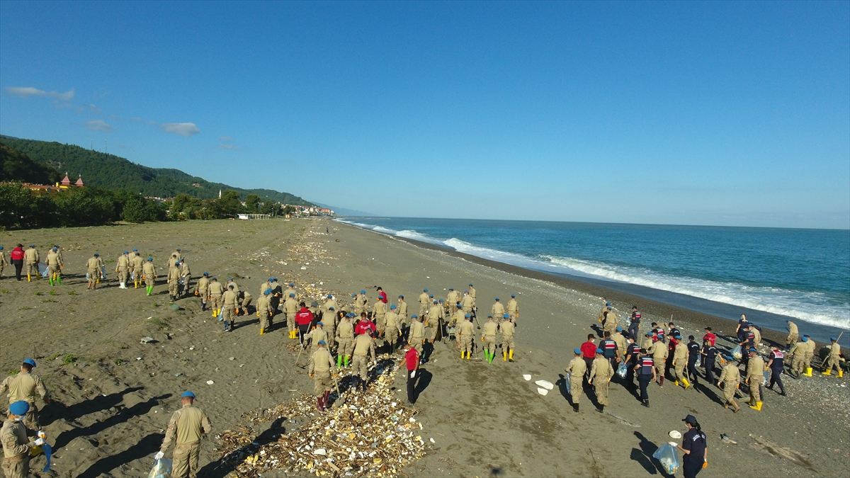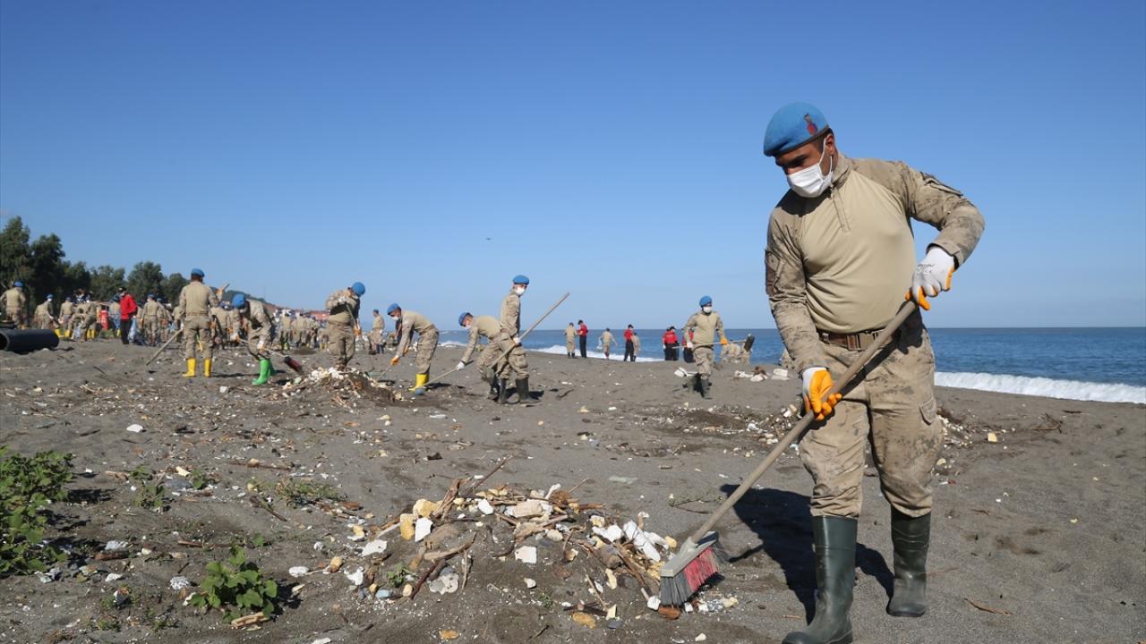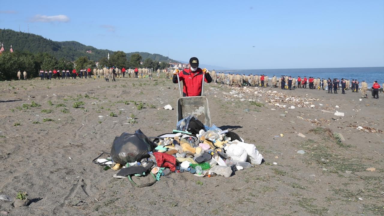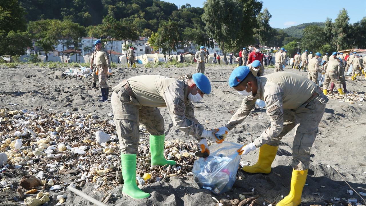 Kastamonu'da 11 Ağustos'ta yaşanan sel felaketi sonrası Ezine Çayı'nın Karadeniz sahilindeki Abana ilçesine taşıdığı çöpler, jandarma tarafından temizlendi.