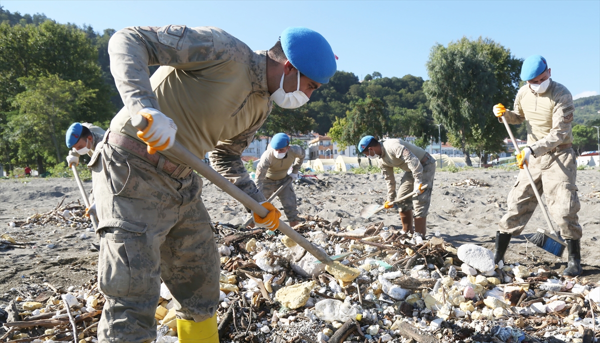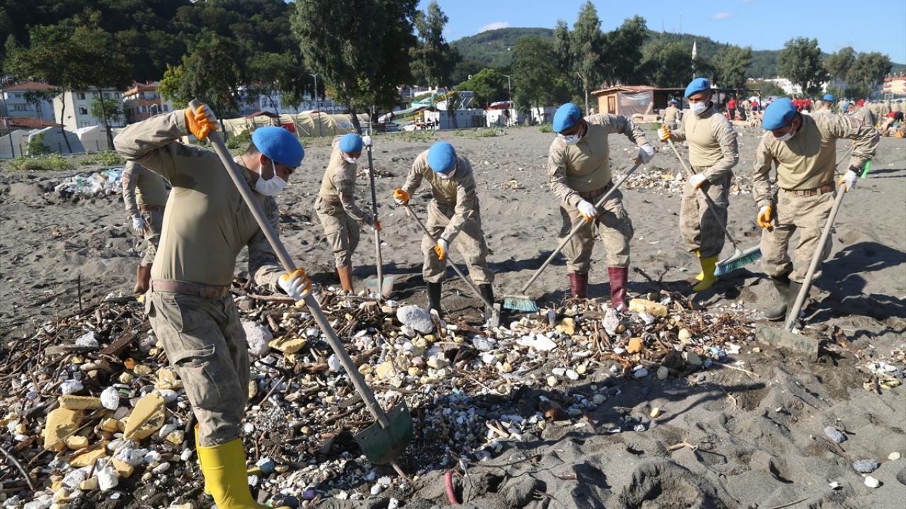 Sahilde geniş bir alana yayılan çöpleri büyük bir titizlikle toplayan jandarma personeli, plajı sel felaketinden önceki görüntüsüne kavuşturdu.