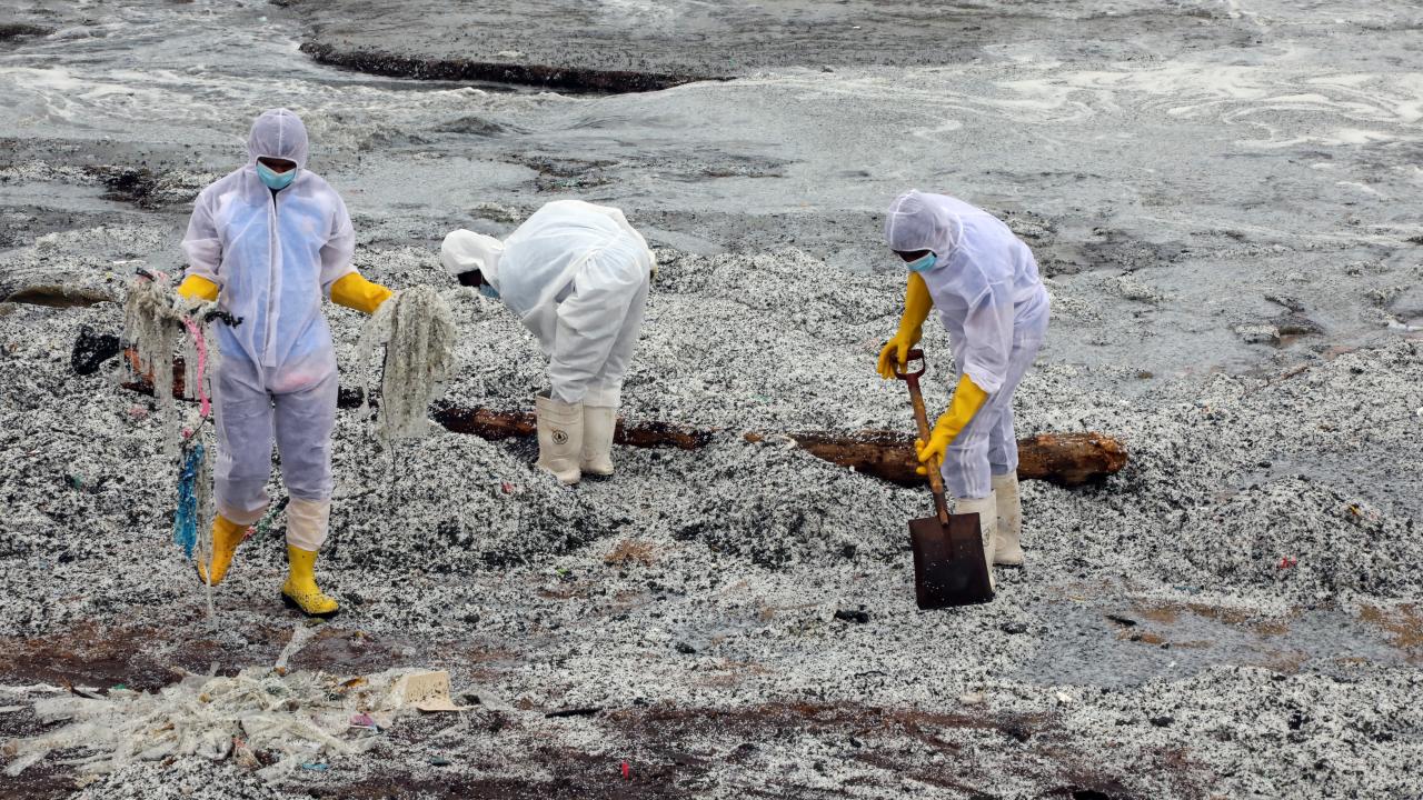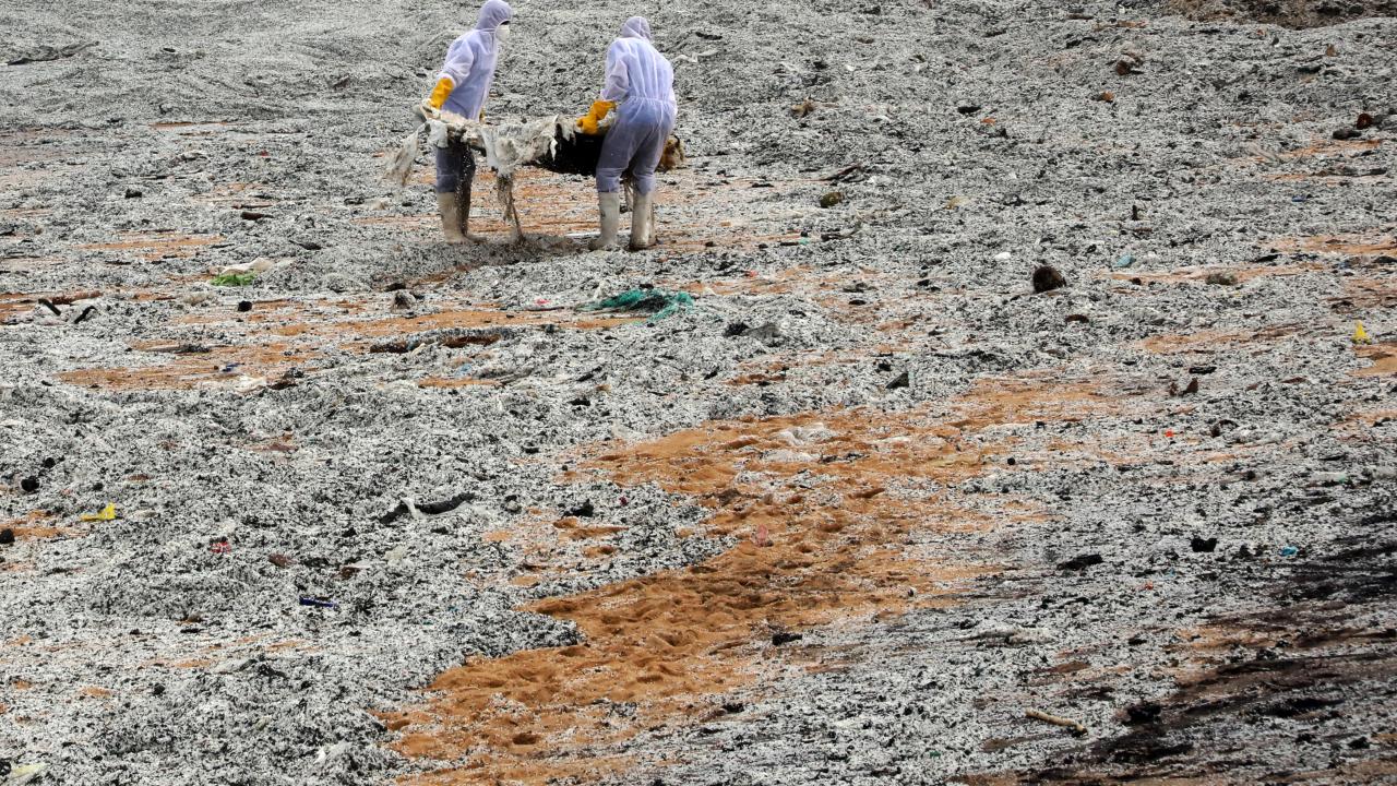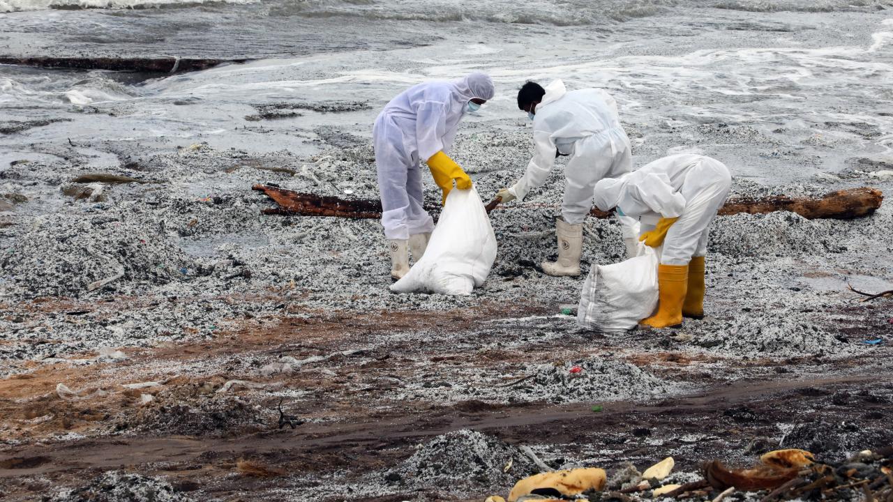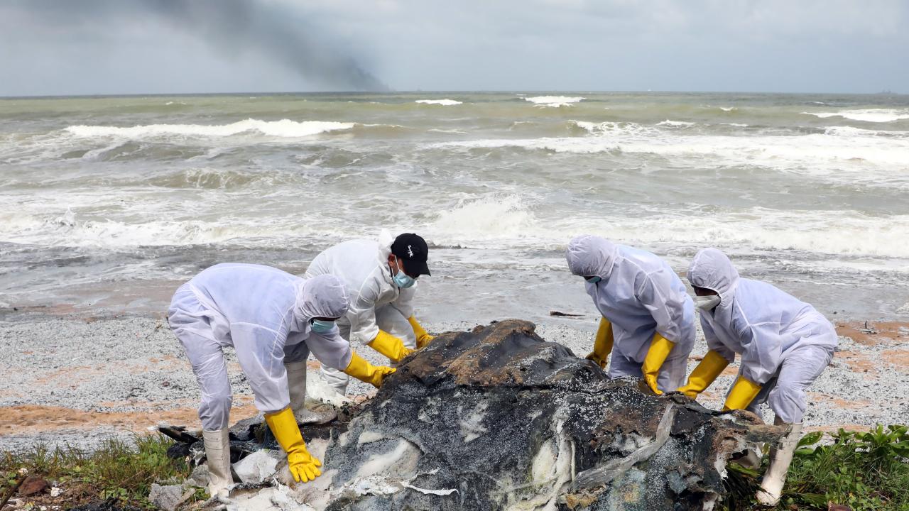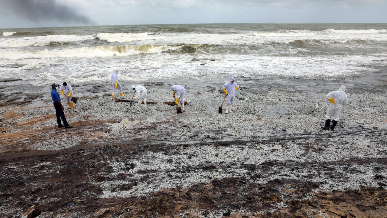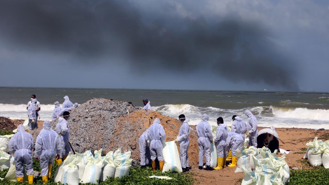 Sri Lanka Donanma personeli koruyucu kıyafetlerle kıyıya vuran enkaz ve kimyasal granülleri temizlemeye çalıştı.