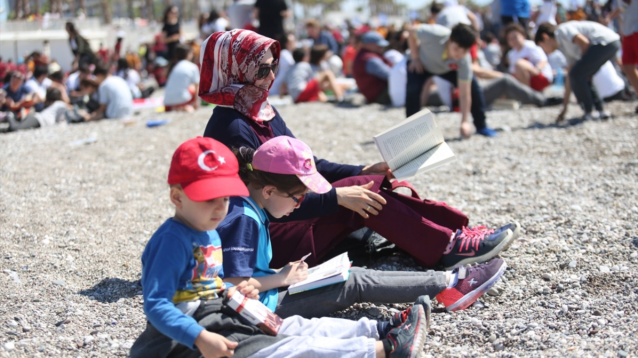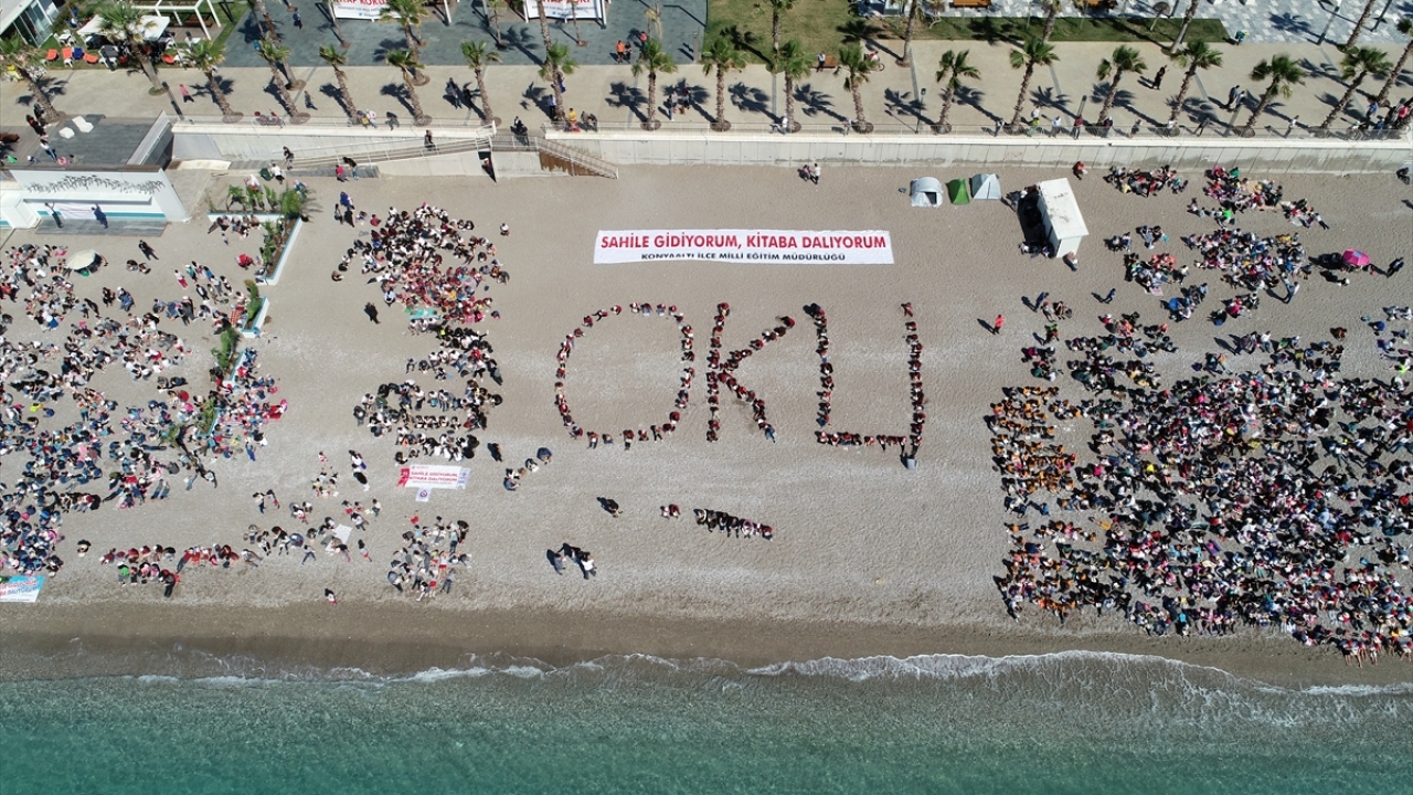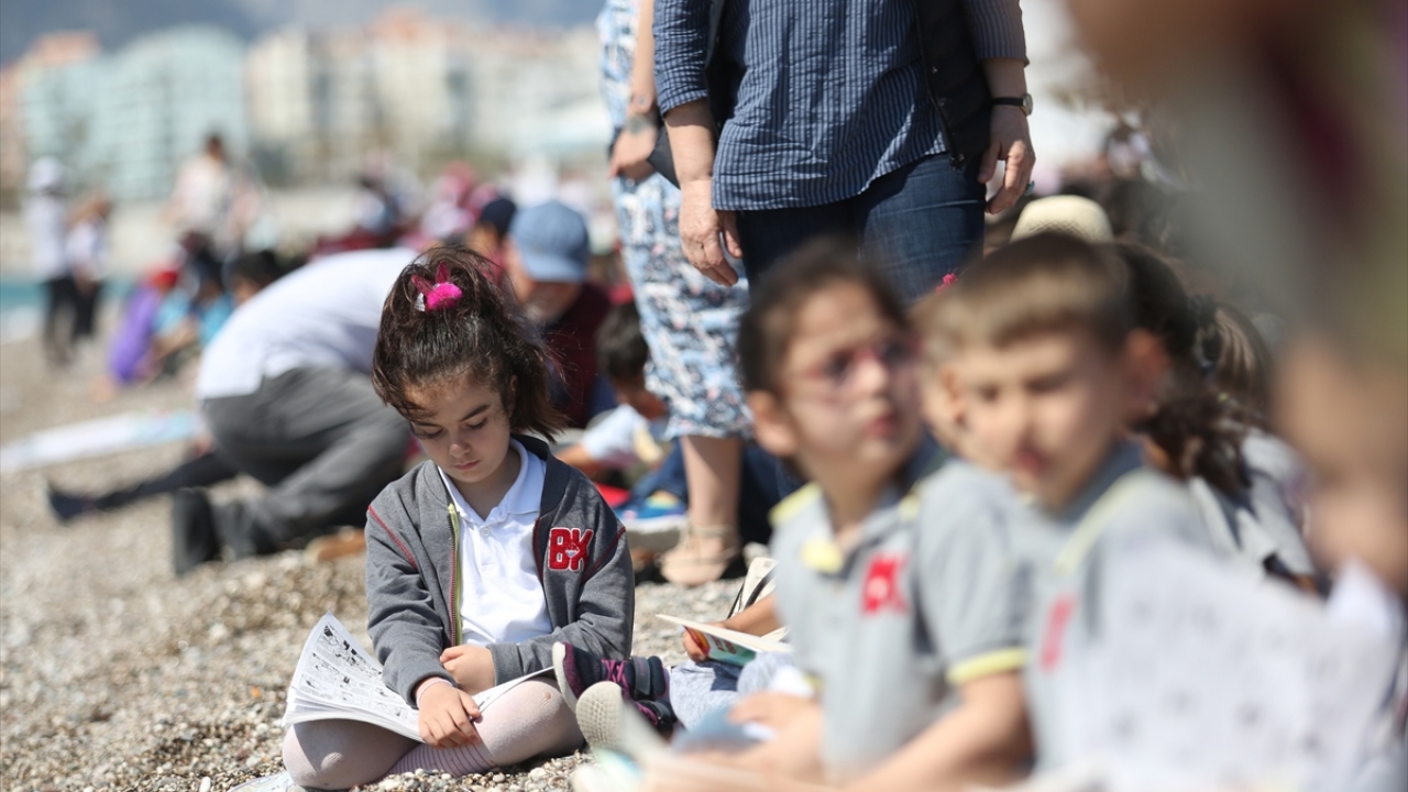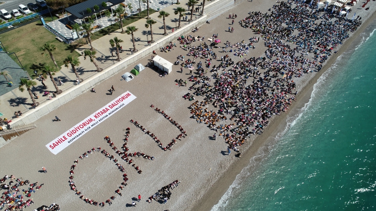 Antalya'da Konyaaltı İlçe Milli Eğitim Müdürlüğünce düzenlenen "Sahile gidiyorum, kitaba dalıyorum" projesi kapsamında 30 bin öğrenci ve velisi Konyaaltı Plajı'nda birlikte kitap okudu.