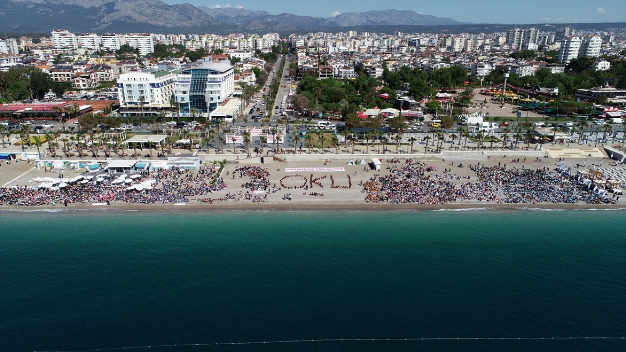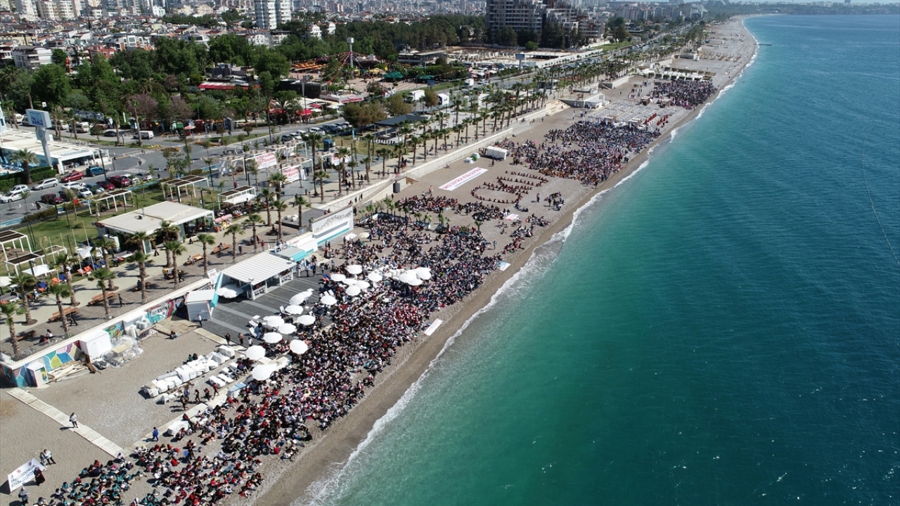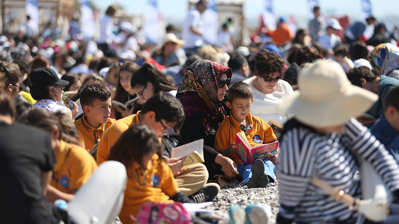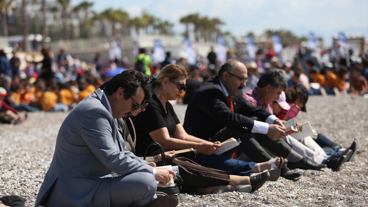 Antalya'da Konyaaltı İlçe Milli Eğitim Müdürlüğünce düzenlenen "Sahile gidiyorum, kitaba dalıyorum" projesi kapsamında 30 bin öğrenci ve velisi Konyaaltı Plajı'nda birlikte kitap okudu.