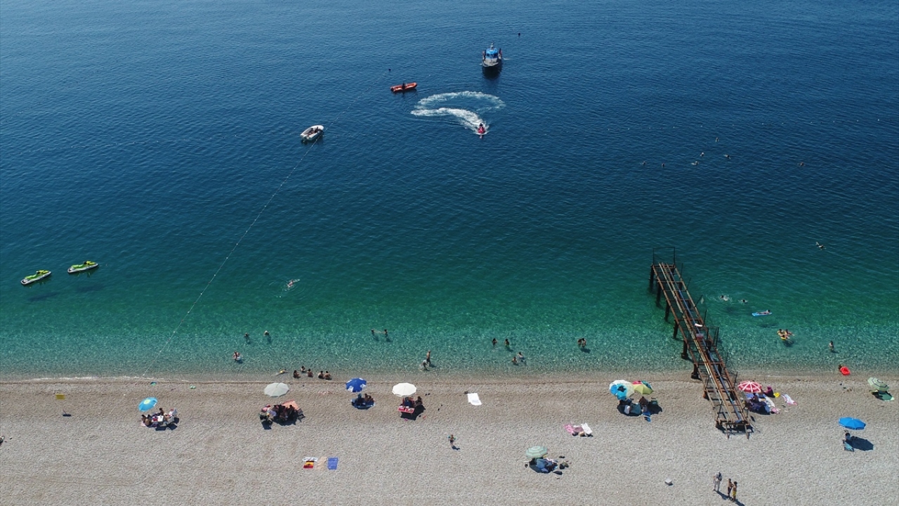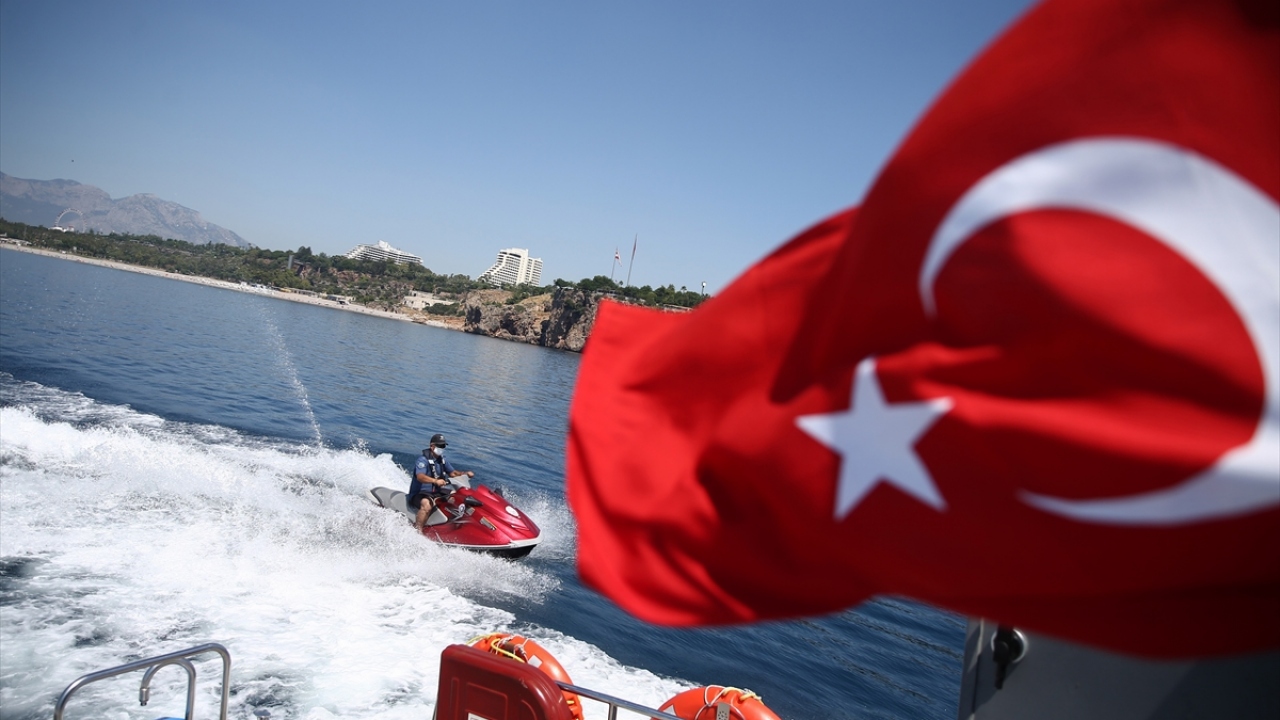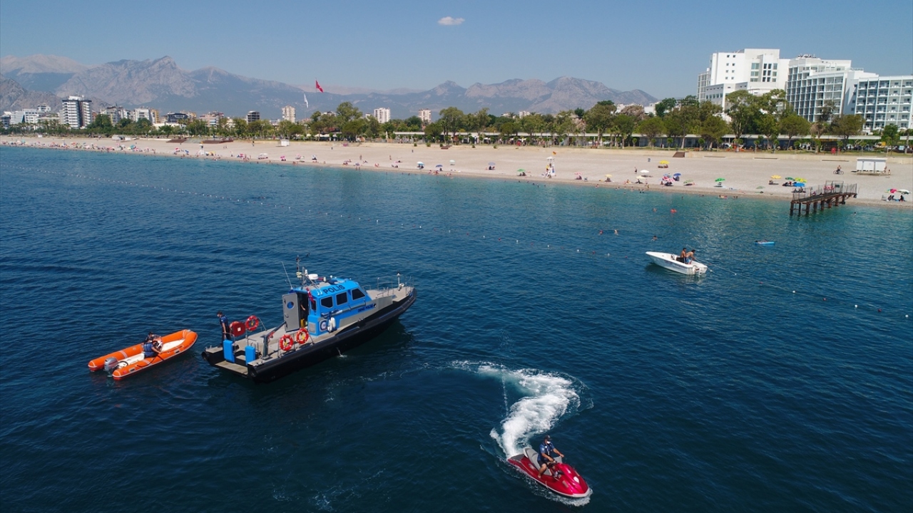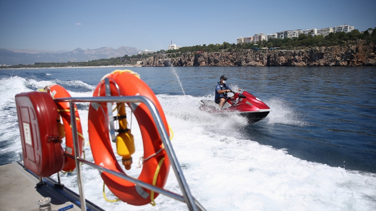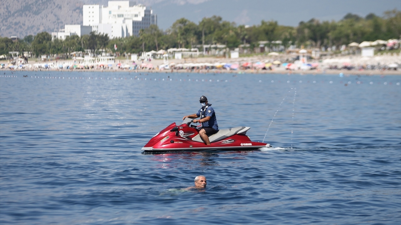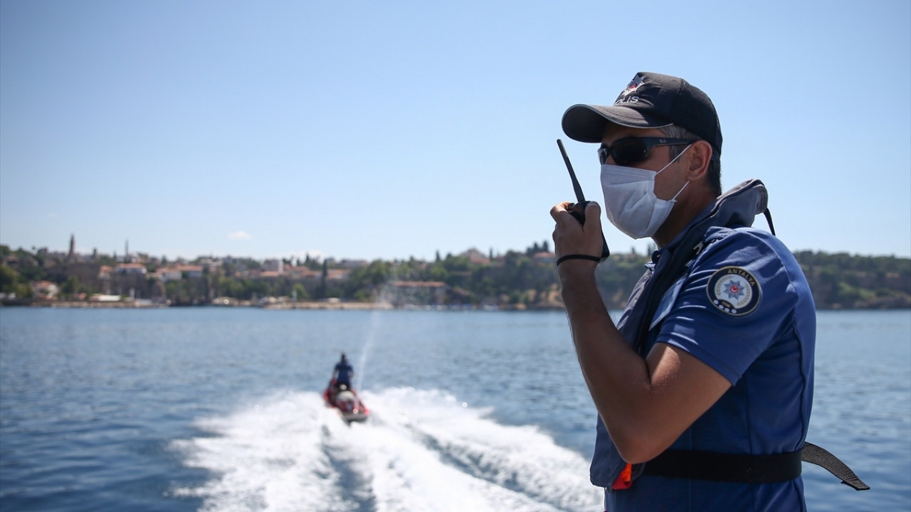 Karadan "atlı polis" ve bisikletli "martı" timlerinin görev yaptığı yaklaşık 7 kilometre uzunluğundaki sahilin açıklarında baştan sona "karakolbot" adı verilen bot, jet-ski ve operasyon botuyla devriye gezen ekipler, vatandaşların Kovid-19 tedbirlerini uyup uymadığını kontrol ediyor.