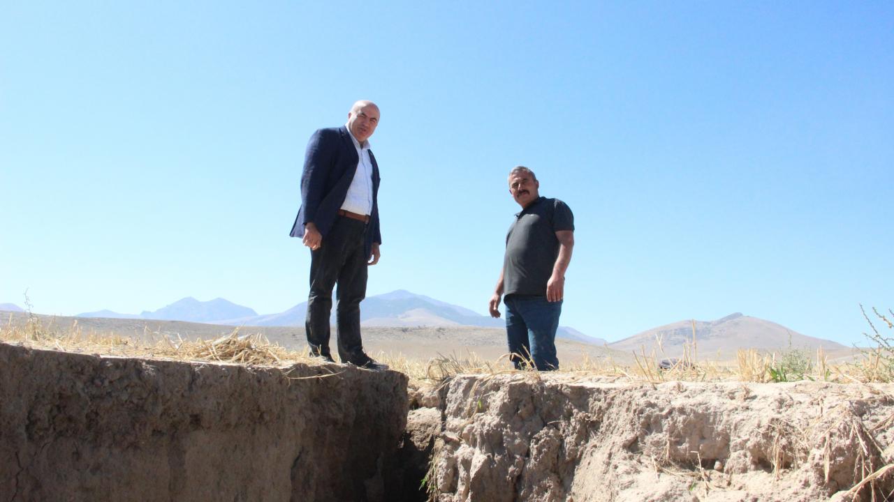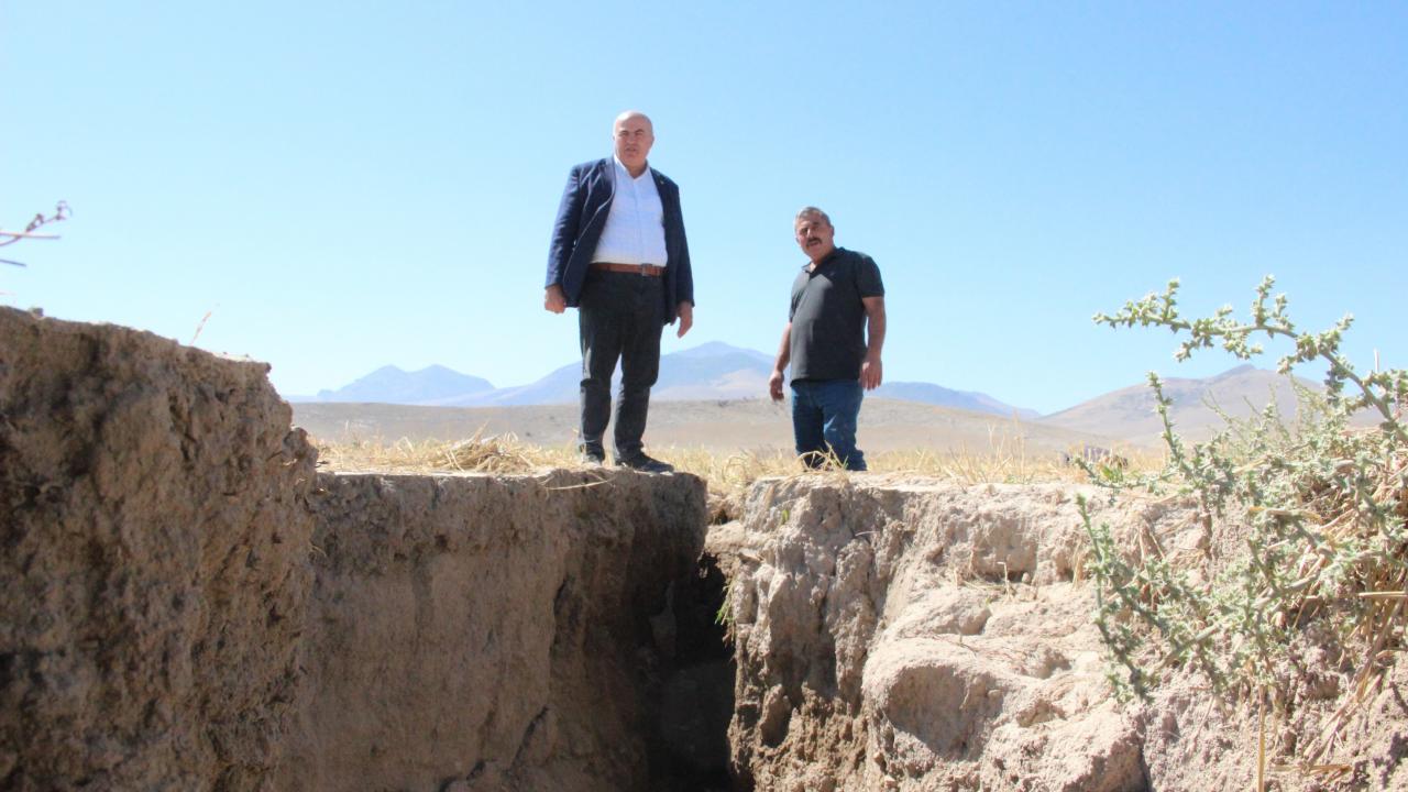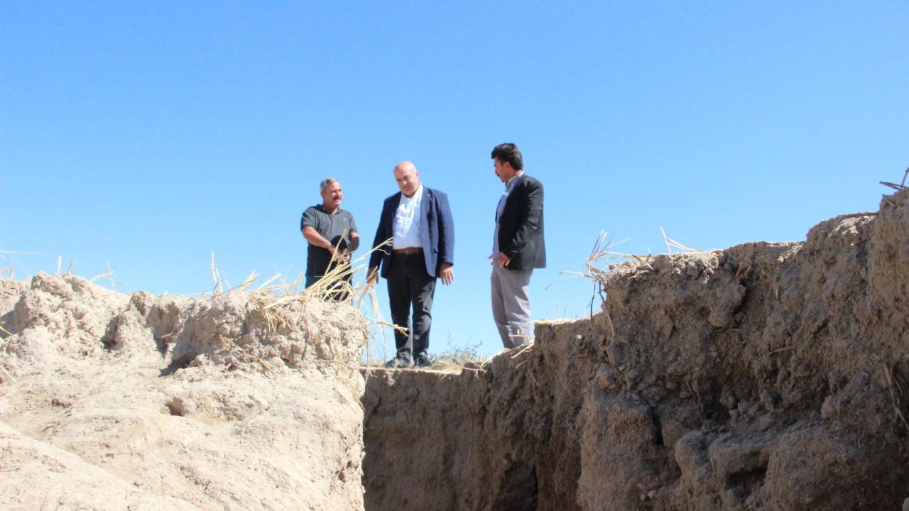Karaman Ziraat Odası Başkanı Mehmet Bayram, yüzey yarığının oluştuğu tarlada incelemelerde bulundu.