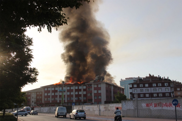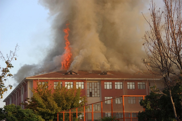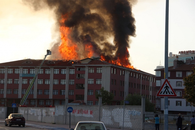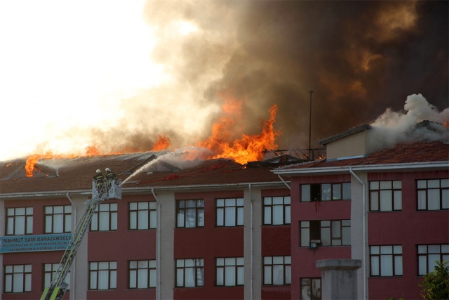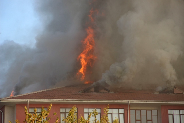 Kent merkezindeki bir lise ve bitişiğindeki kız öğrenci yurdunun çatısında çıkan yangın, itfaiye ekiplerince söndürüldü.