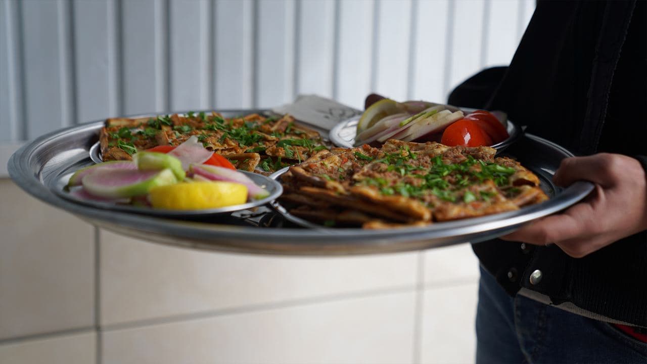 Etli ekmek, piştikten sonra üzerine maydanoz serpilerek servis ediliyor.