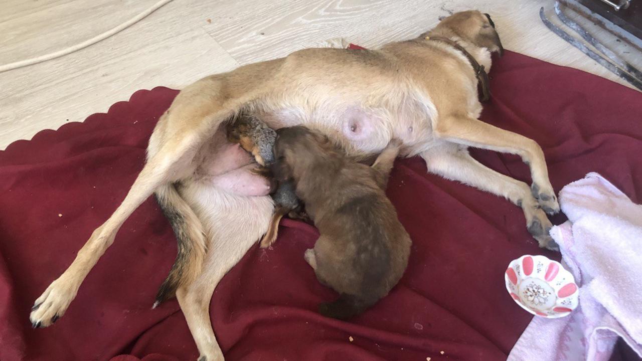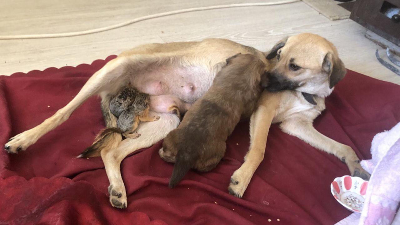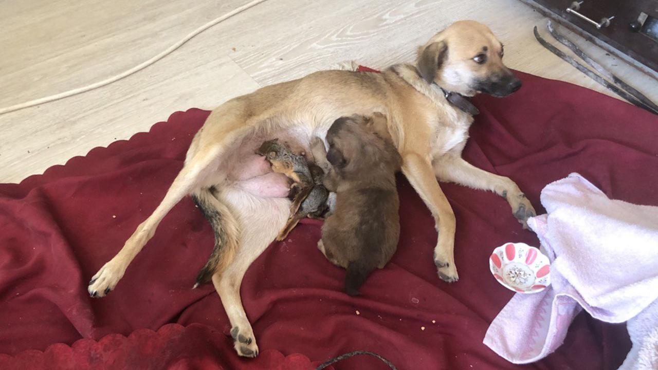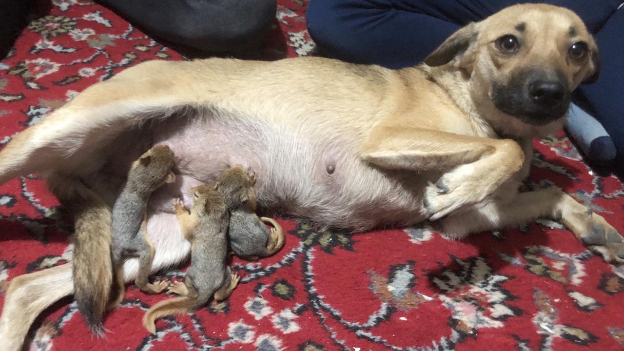 Isparta'nın Yalvaç ilçesinde yuva kurdukları ağacın kesilmesi üzerine annelerinden ayrı kalan 3 yavru sincaba, 15 gün önce 6 yavru dünyaya getiren Zeyna adlı köpek annelik yapıyor. Zeyna, sincapları yavruları gibi yalayıp, emziriyor.