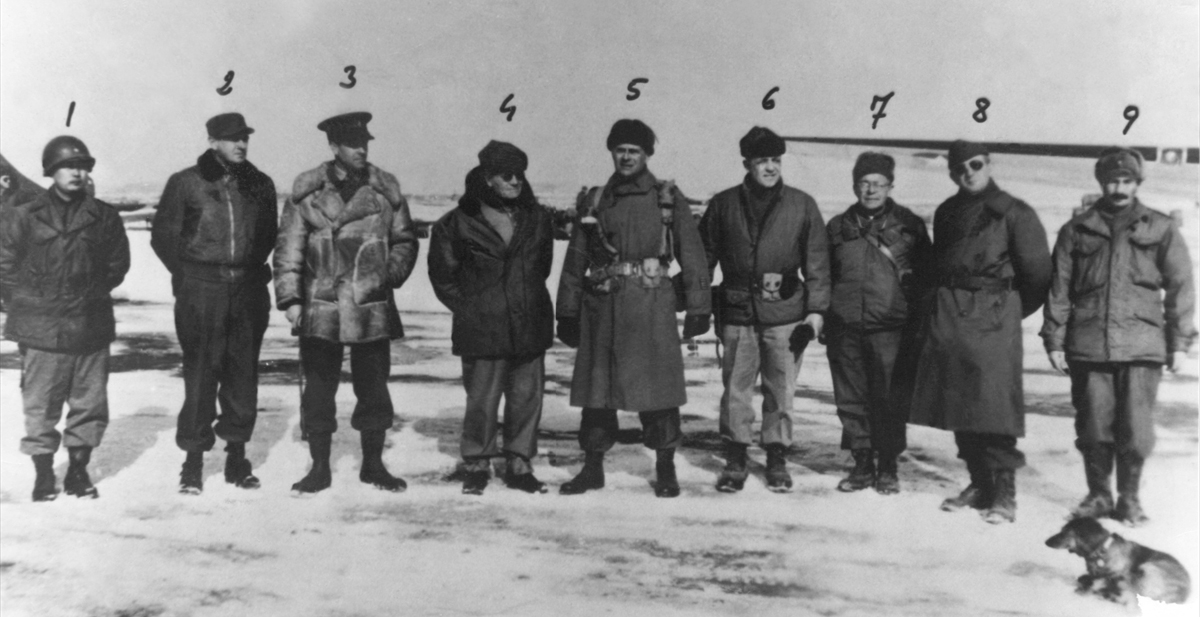 Kore`yi ziyarete gelen General MC. Arthur`u, Swan Havaalanında Koreli General Pakinyap (solda), Ordu Kurmay Başkanı (sol 2), İngiliz Tugay Komutanı (sol 3), Kolordu Komutanı Korgeneral Mılburn (sol 4), 8.Ordu Komutanı General Ridgway (sağ 5), 25.Tümen Komutanı General Kean (sağ 4), 3.Tümen Komutanı General Seoul (sağ 3) ve Türk Tugay Komutanı Tahsin Yazıcı (sağ 2) karşıladı. (Arşiv)