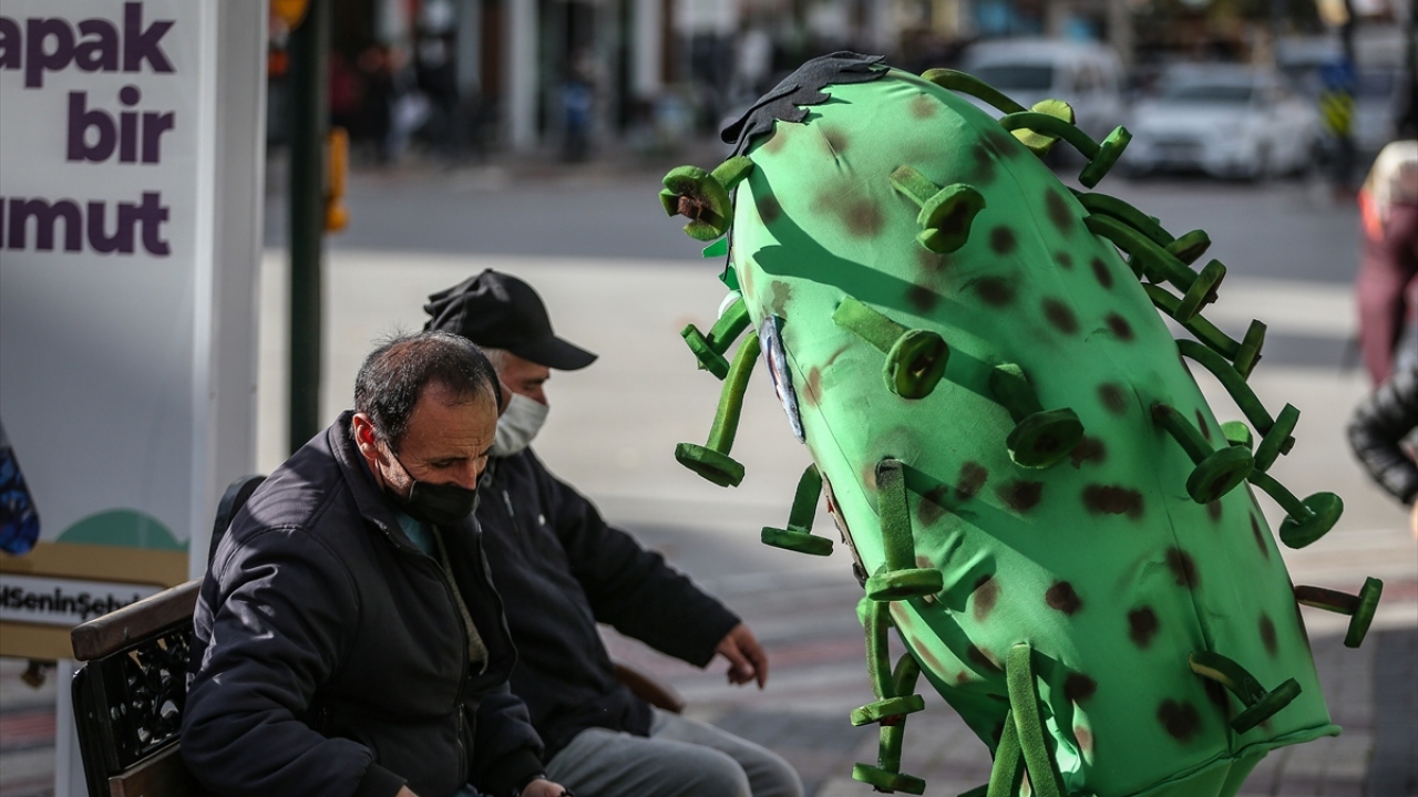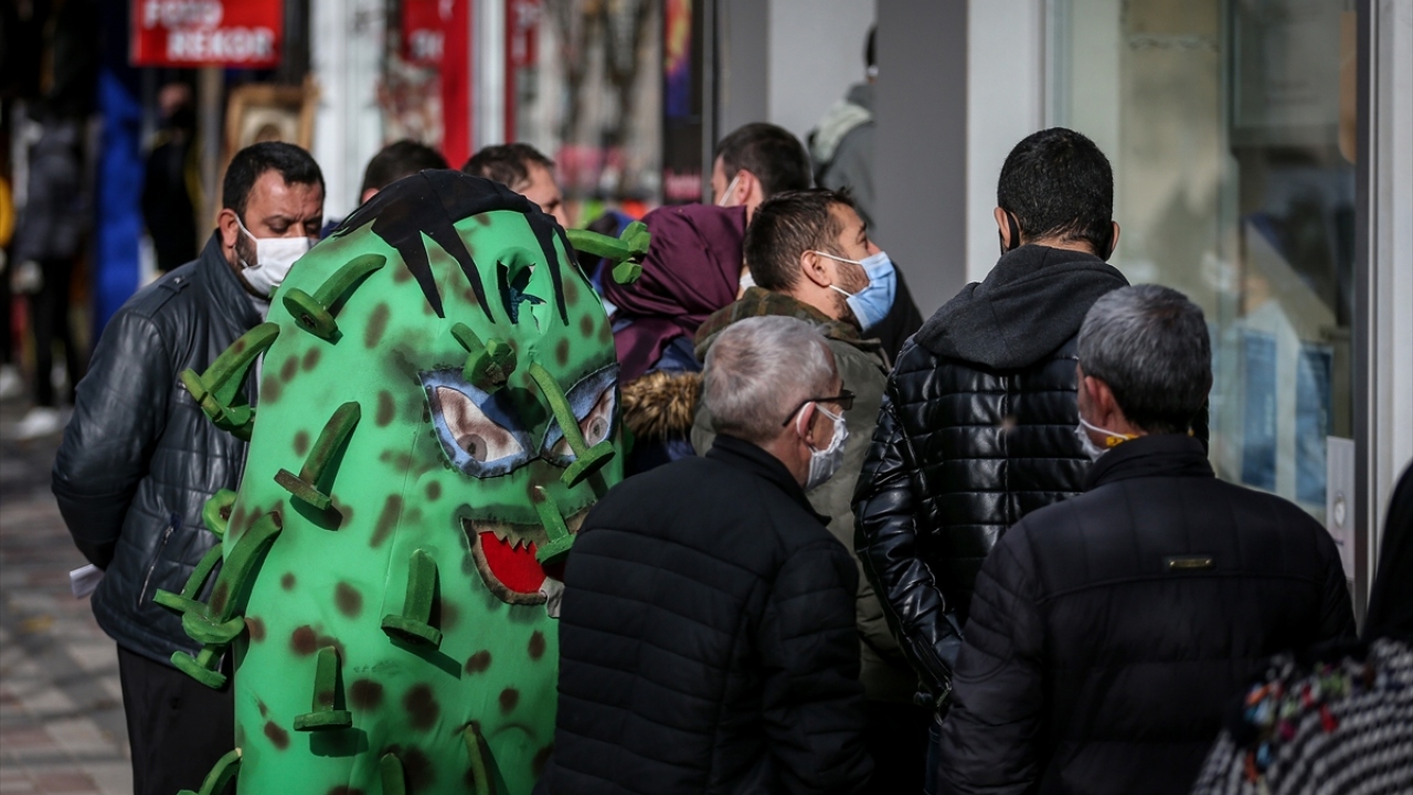 Kimi zaman bankamatikte sıra bekleyen vatandaşların arasına giren, kimi zaman ise bankta oturan yaşlıların yanına giden "koronavirüs", bazen de grup halinde yürüyenlere sessizce yaklaşarak uyardı.