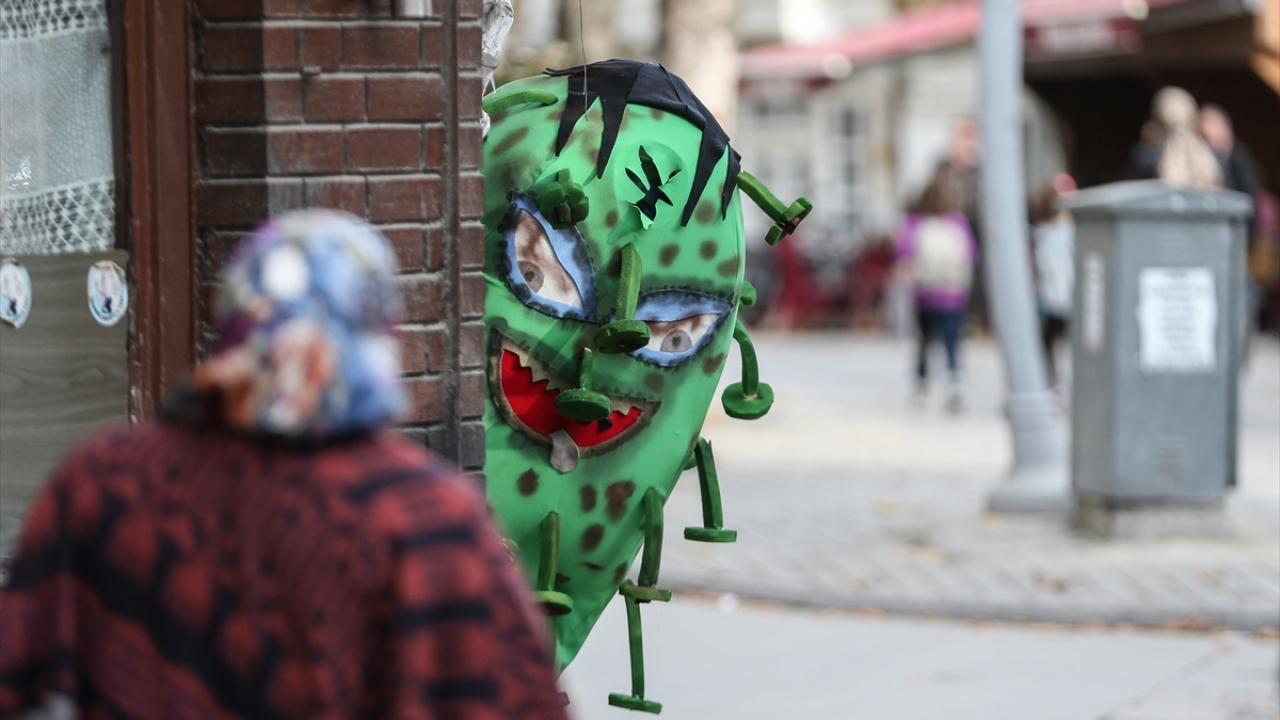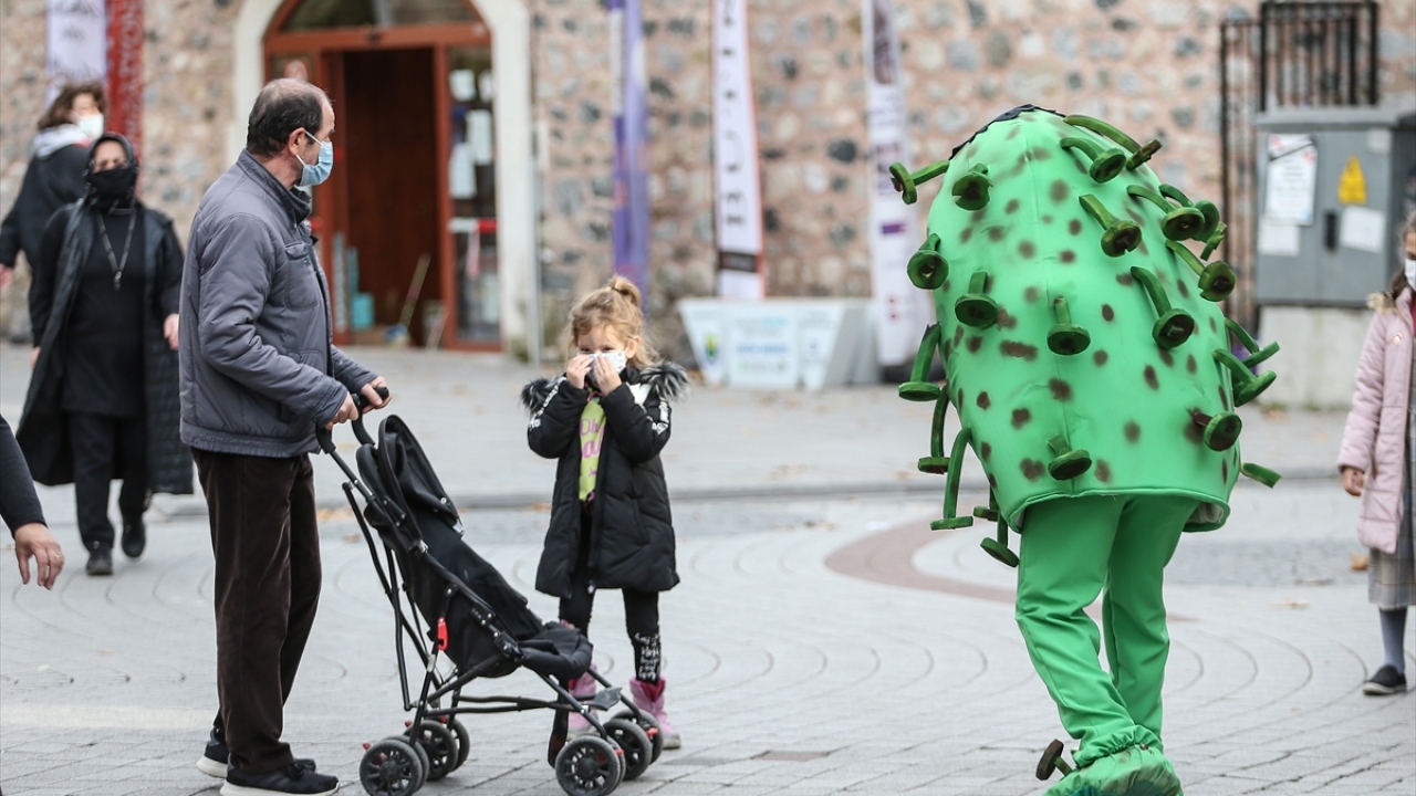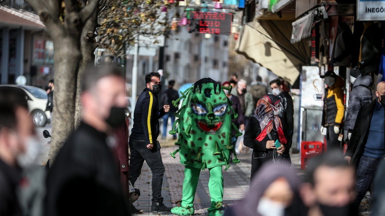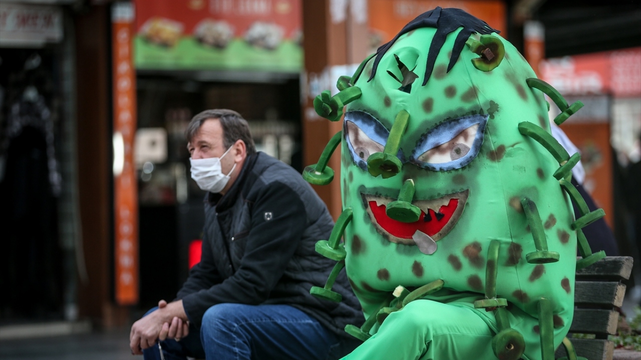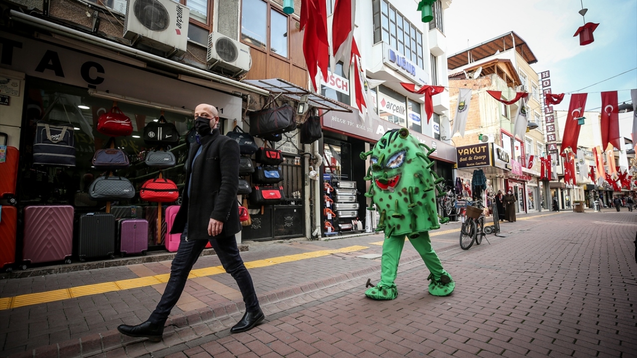Bursa'nın İnegöl ilçesinde yeşil renkli küre şeklinde 'koronavirüs kostümü' giyerek sokaklarda gezen belediye personeli, vatandaşlara maske, mesafe, temizlik kuralını hatırlattı.