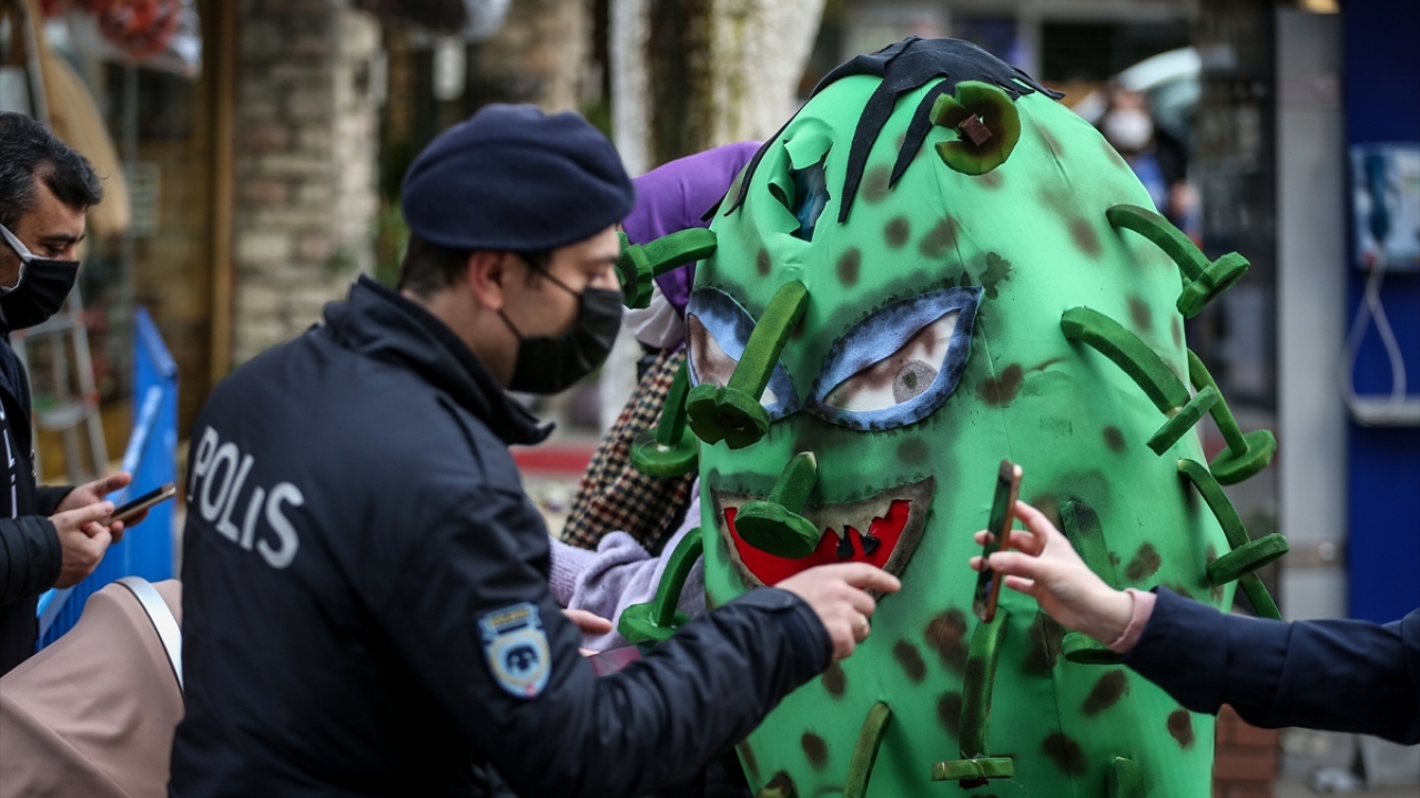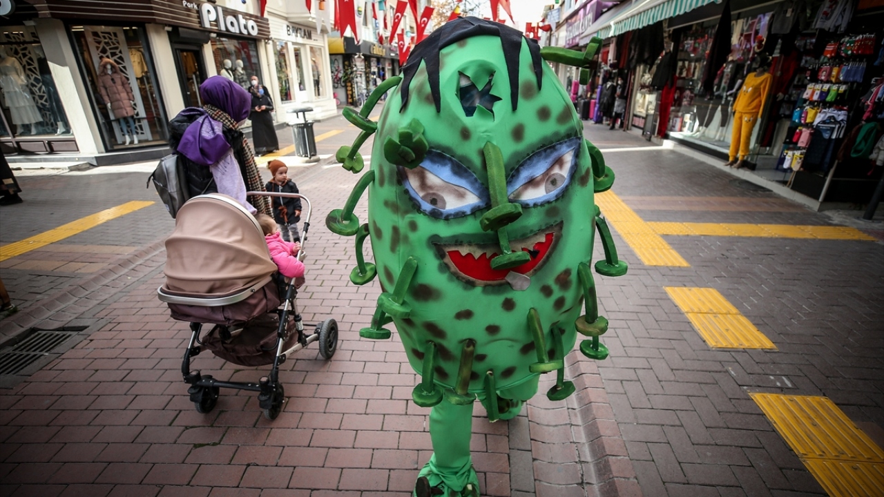 'Koronavirüs kostümü'yle gezen belediye personelinden maske, mesafe, temizlik uyarısı
