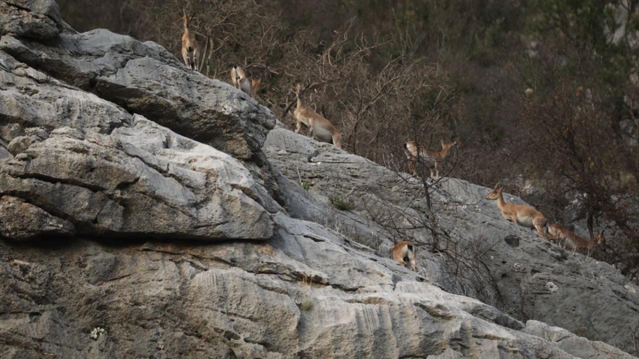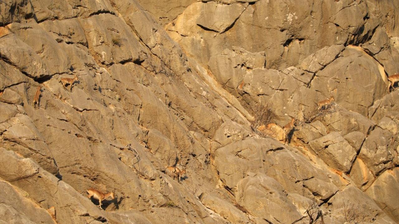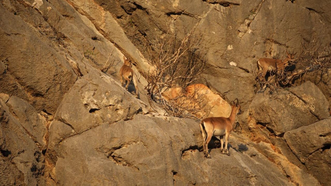 Milli parktaki kayarlarda yaşayan keçiler, yüksek rakımlı noktalardan insanların gözle rahatlıkla görebileceği noktalara iniyor.