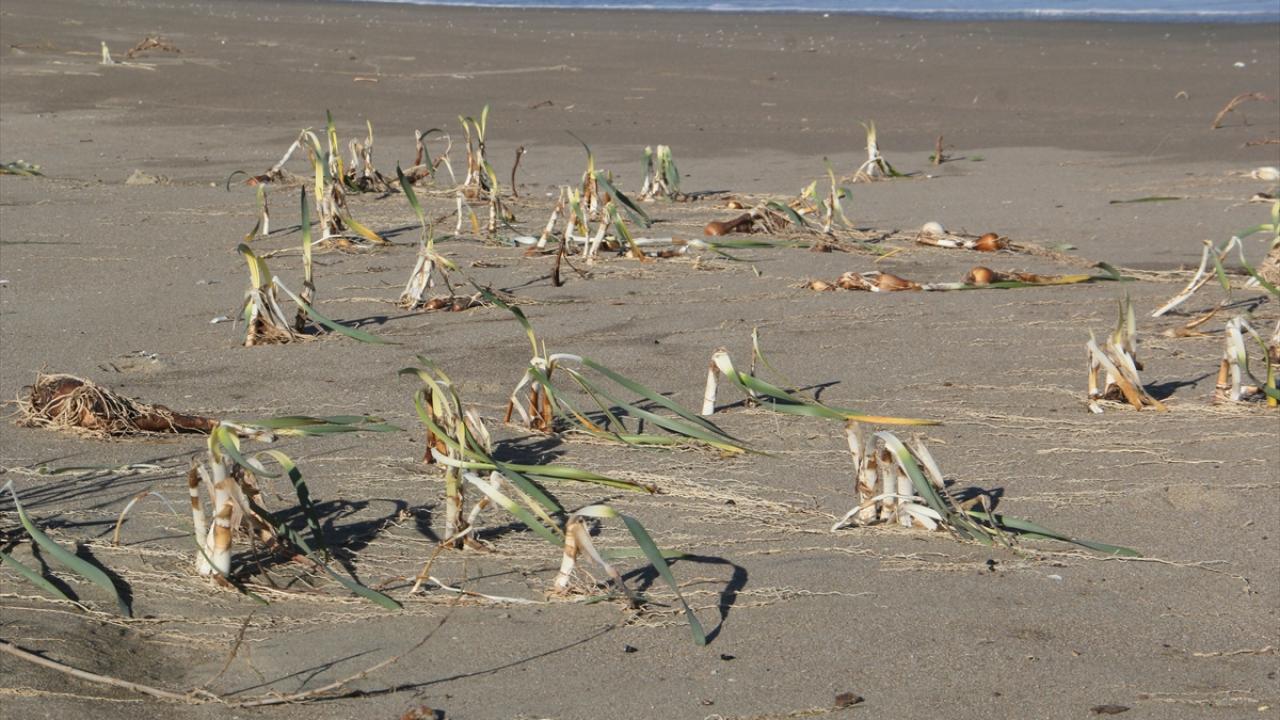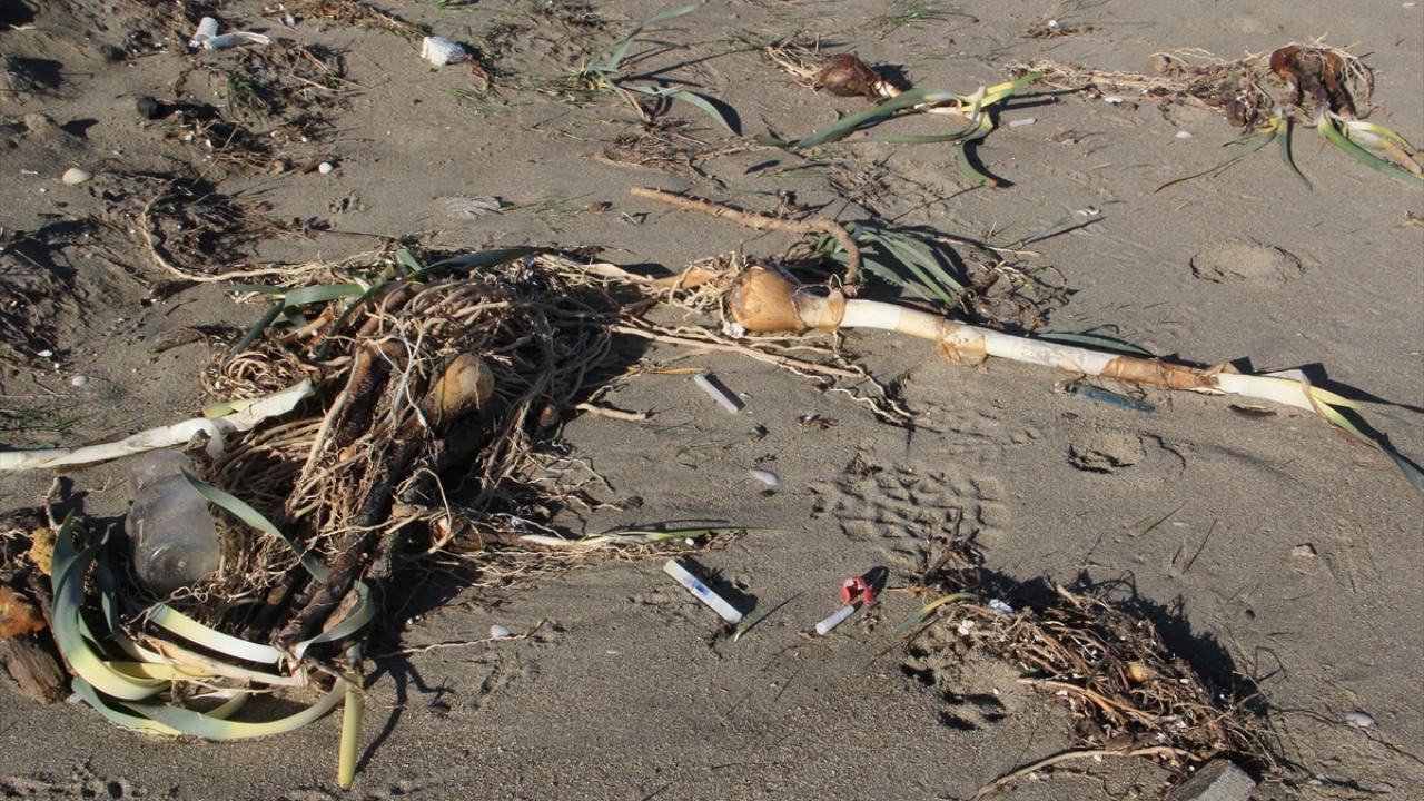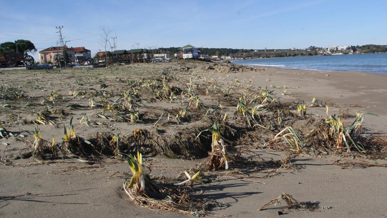 Özellikle Akliman sahili boyunca etkili olan fırtına bölgedeki çok sayıda kum zambağını sökerek yol kenarındaki kaldırımın üstlerine kadar savurdu.