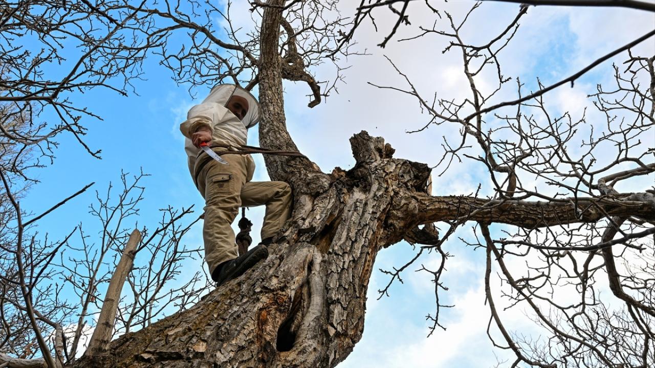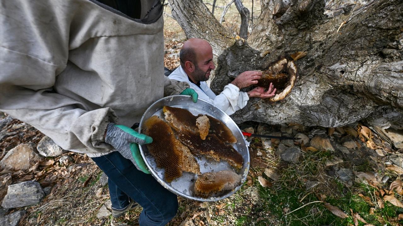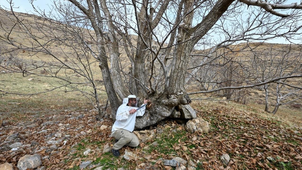 Van'da arıcılık yapan "Arı adam" lakaplı Abdulvahap Semo, Çatak ilçesinde kovanlardan kaçan arıların yuva yaptığı ceviz ağacının kovuğundan 5 kilogram bal çıkardı.