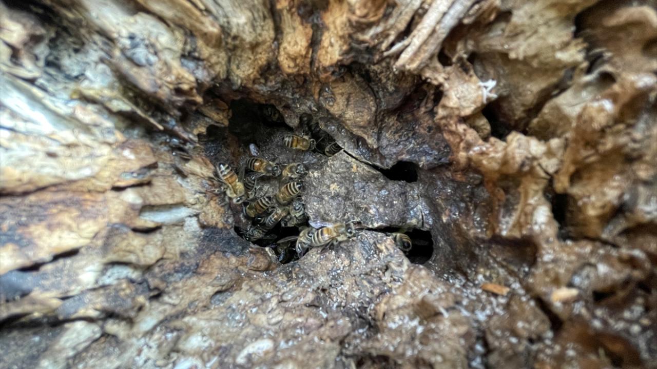 Kovandan kaçan arıların yuva yaptığı ağacın kovuğundan 5 kilogram bal çıkarıldı