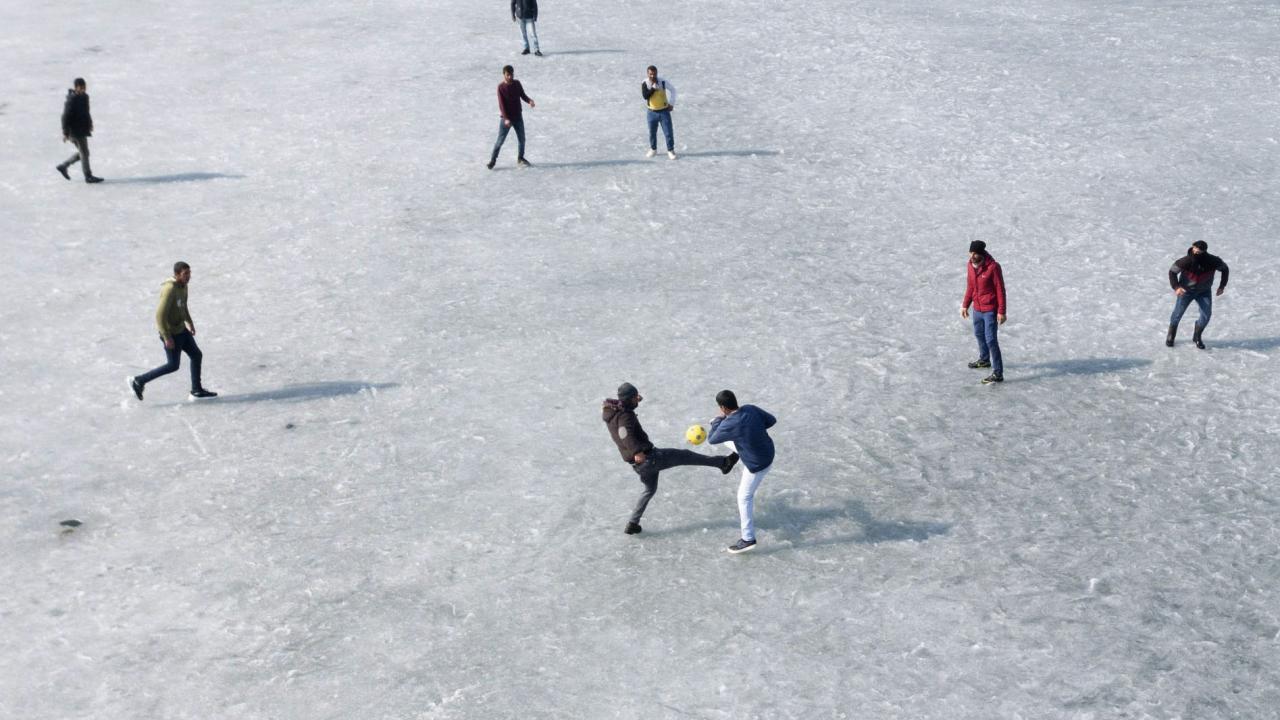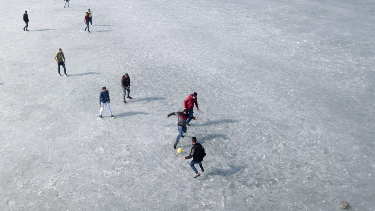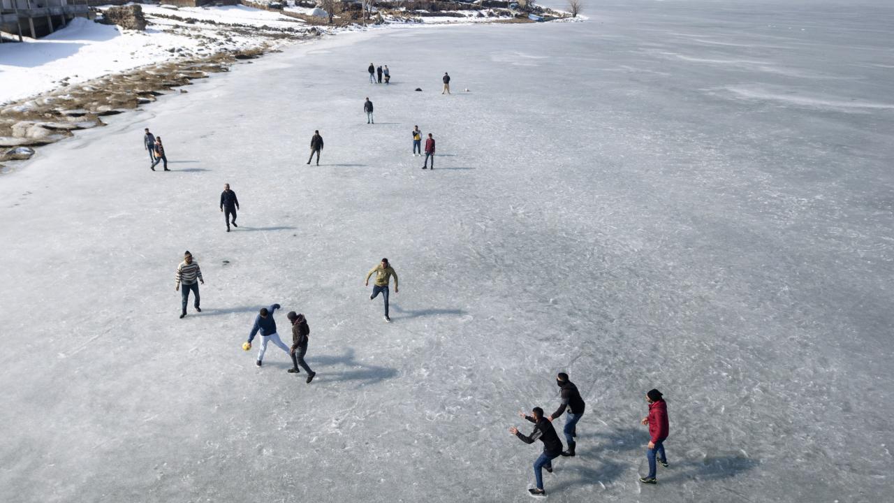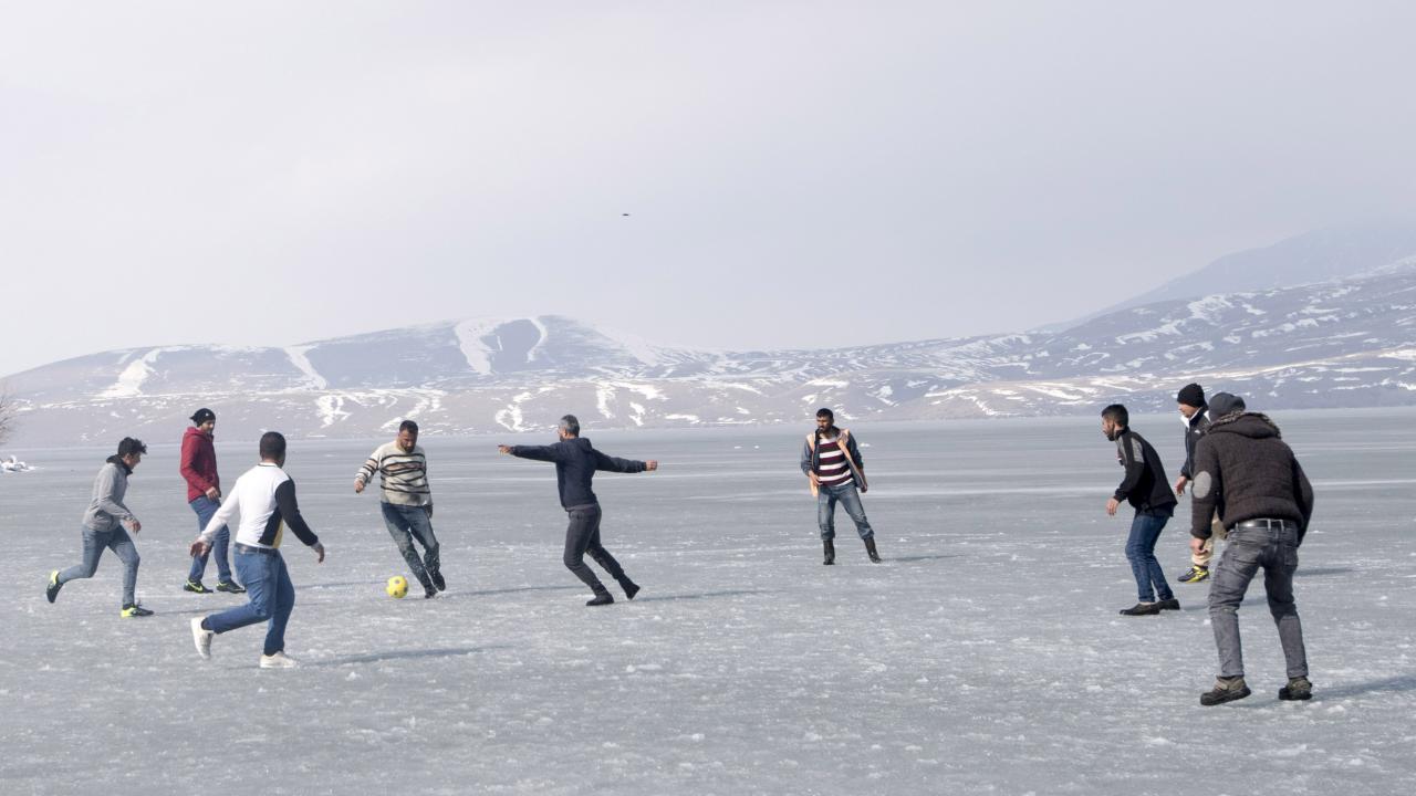 Donan göl üzerinde futbol oynayan gençlerden Mehmet Oğur, kış mevsimi boyunca donan gölde futbol oynayarak boş zamanlarını değerlendirdiklerini söyledi.