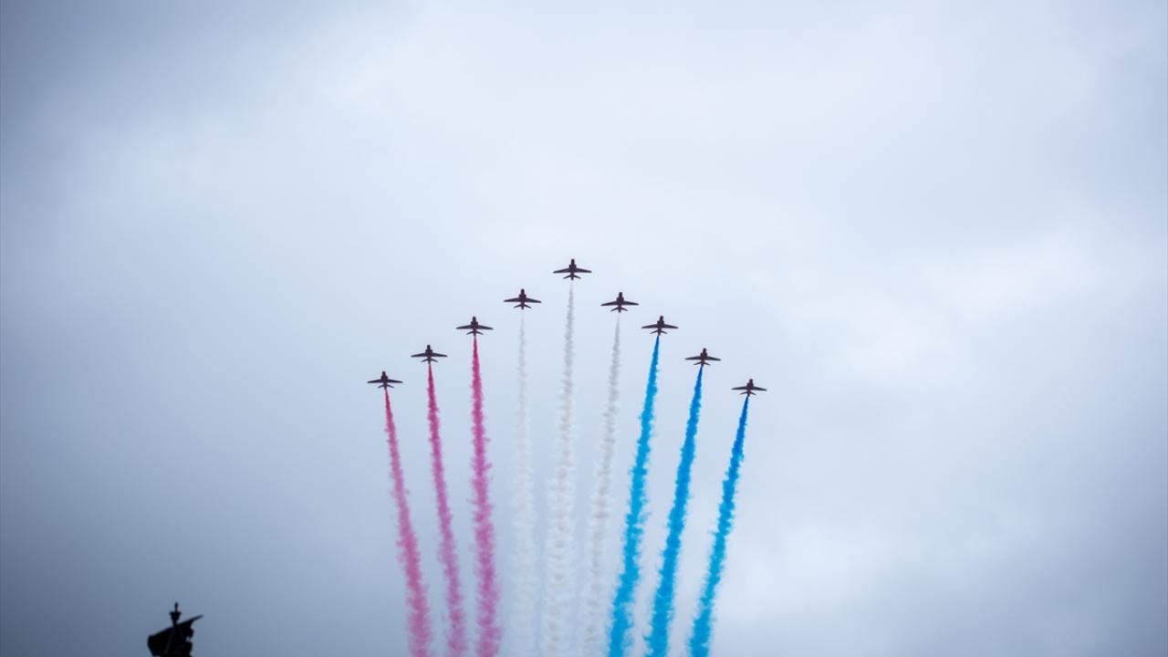 Tören sırasında askeri uçaklar gösteri yaptı, top atışları gerçekleştirildi.