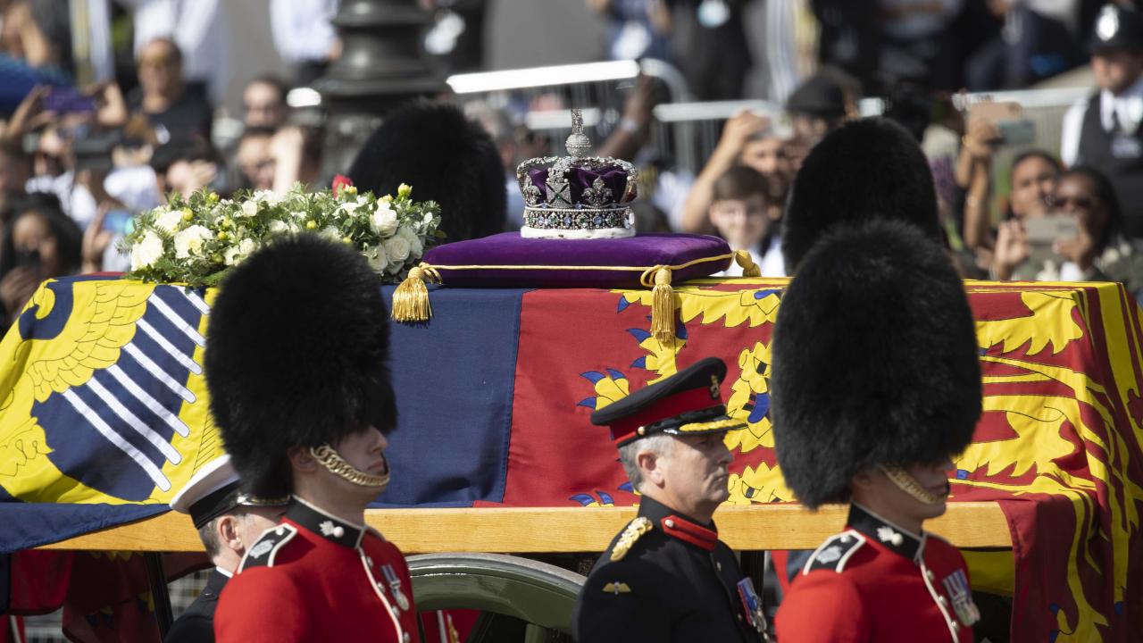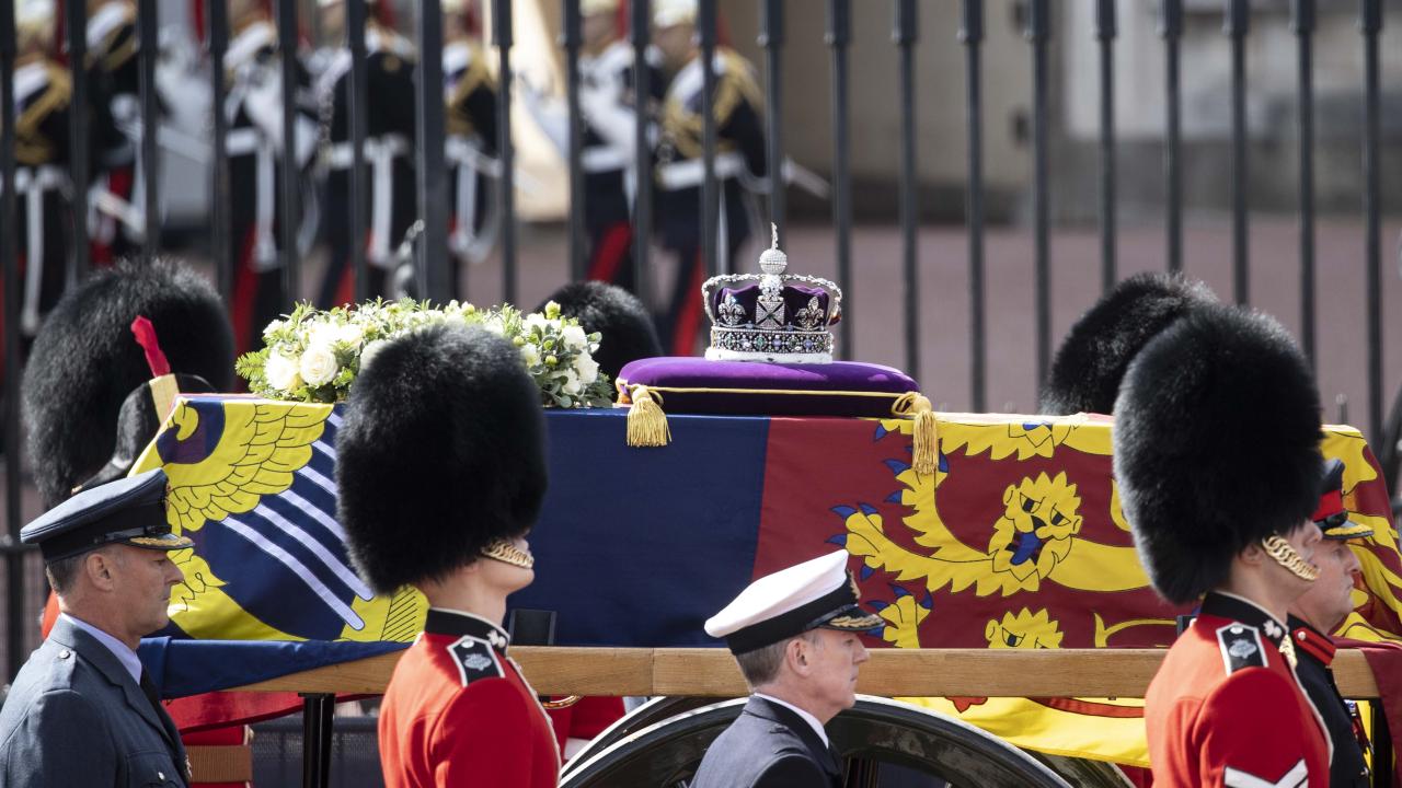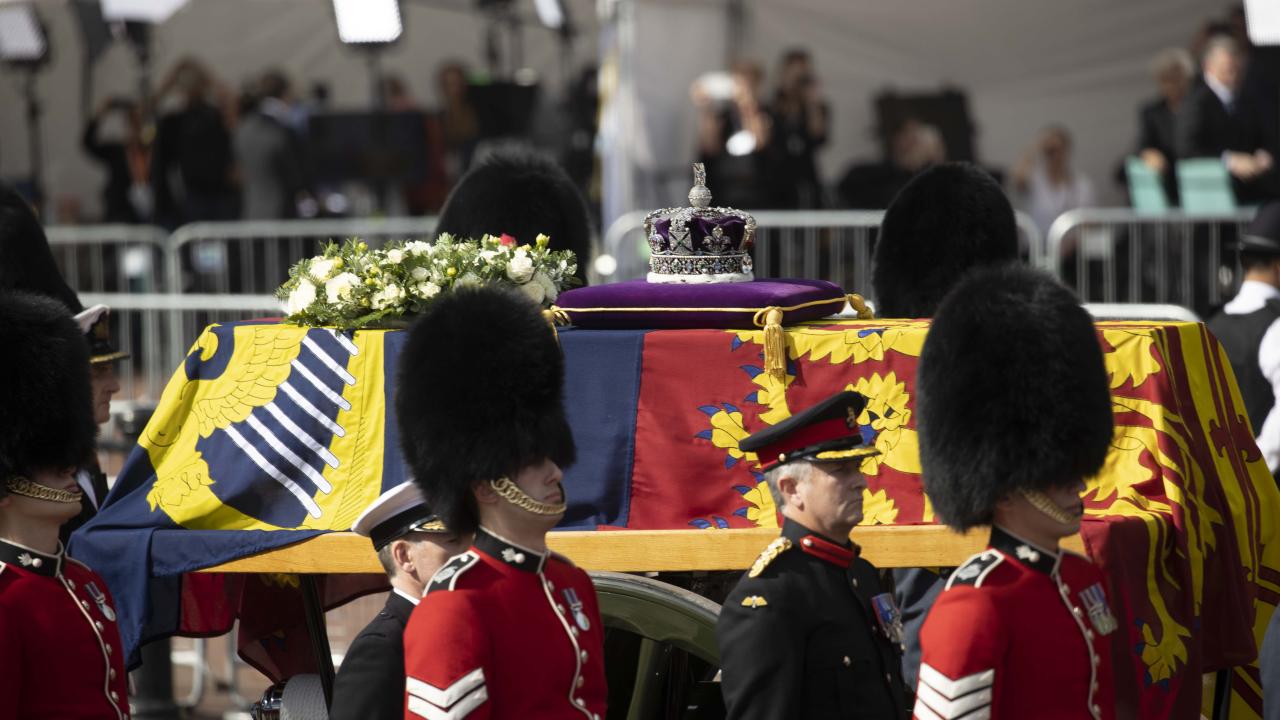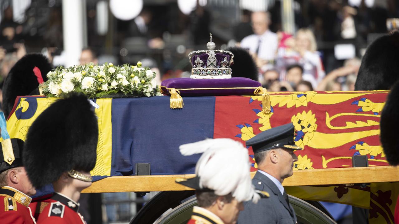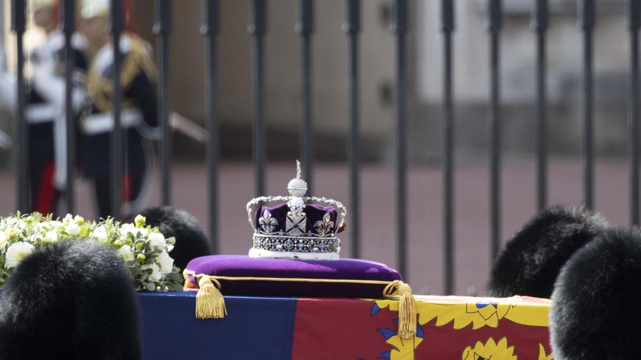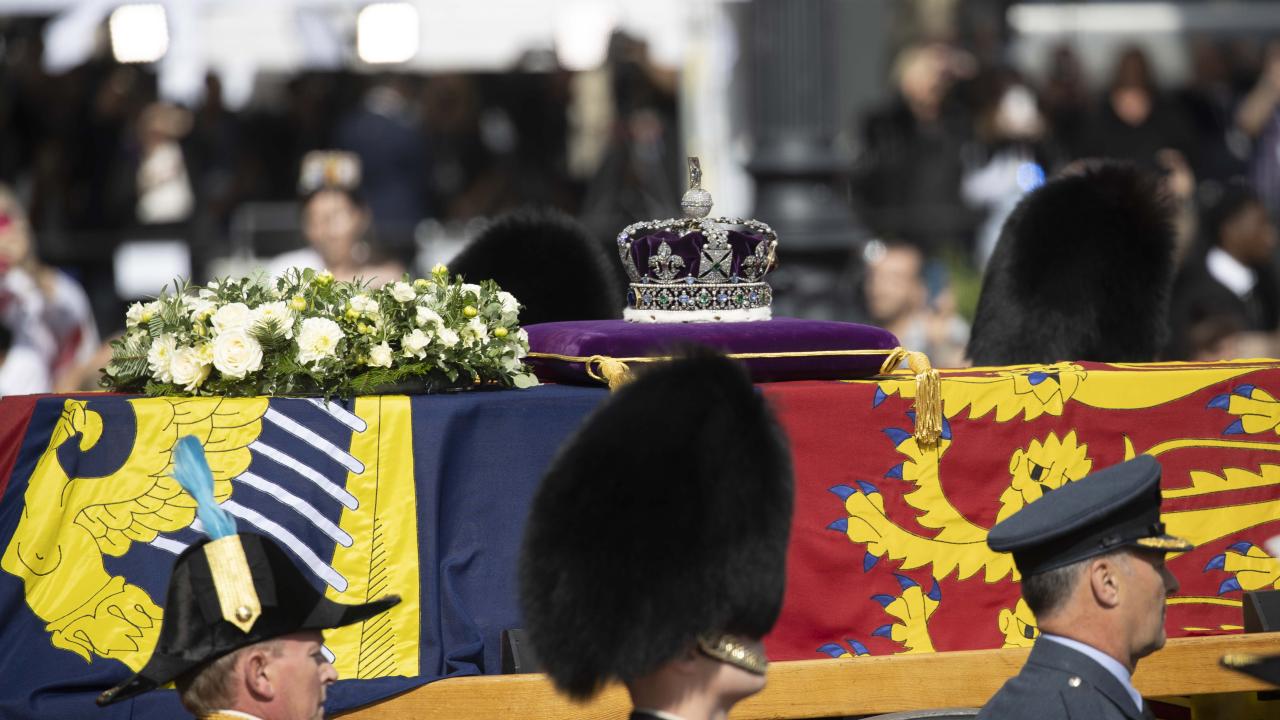 İngiltere Kraliçesi 2. Elizabeth`in tabutunun üzerinde mor bir minderde tacı ve yanında da Balmoral ve Windsor`daki bahçelerden getirilmiş çiçeklerden oluşan bir çelenk yer aldı.