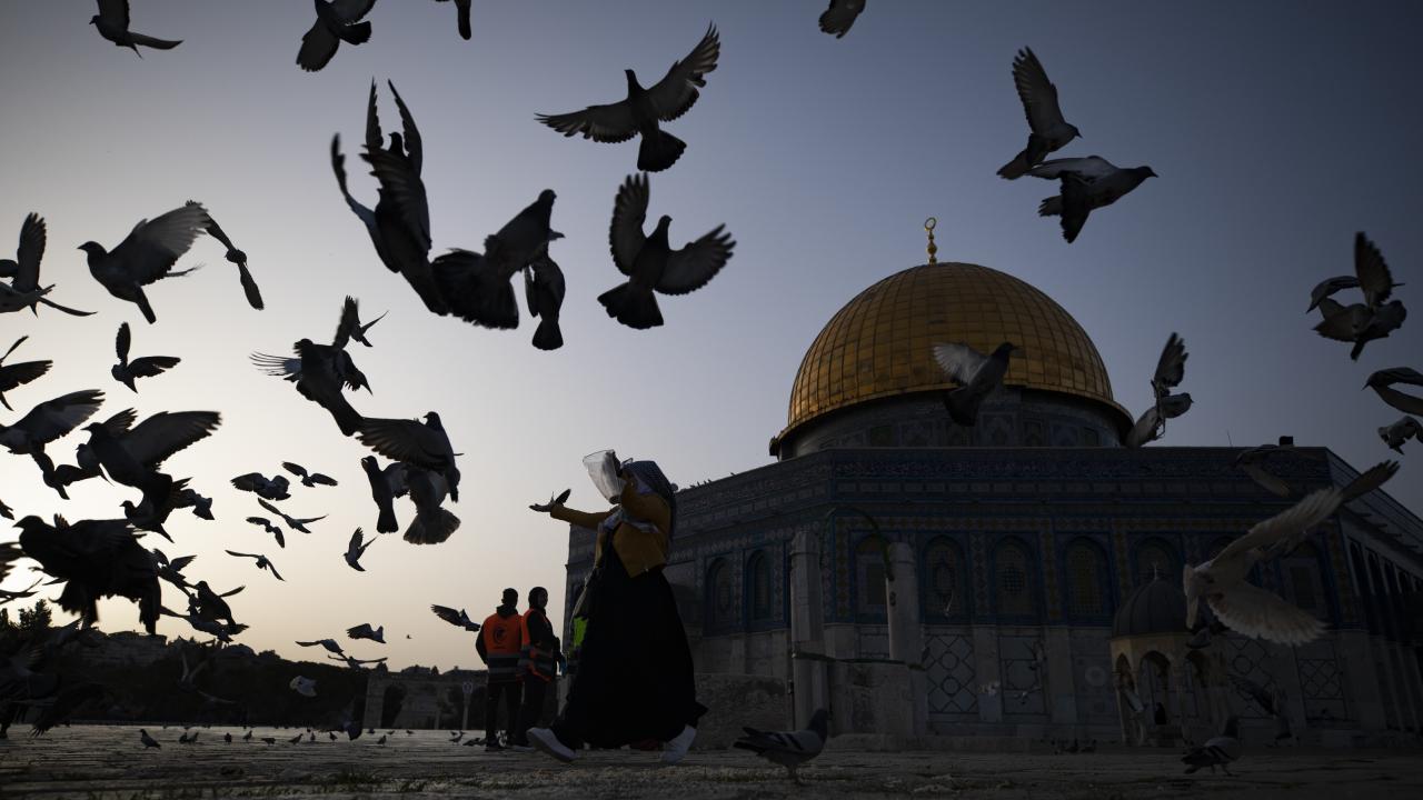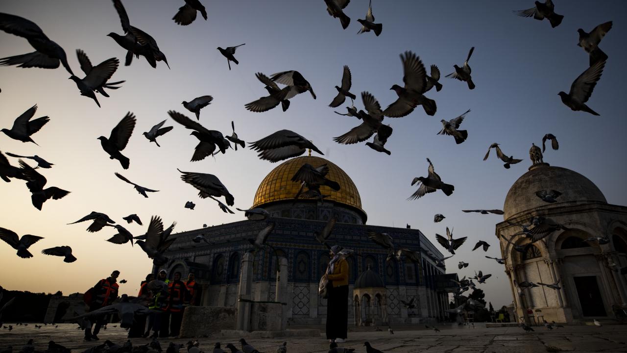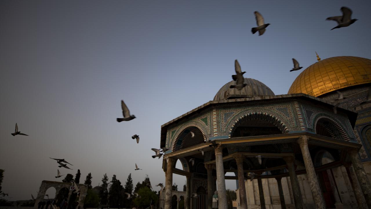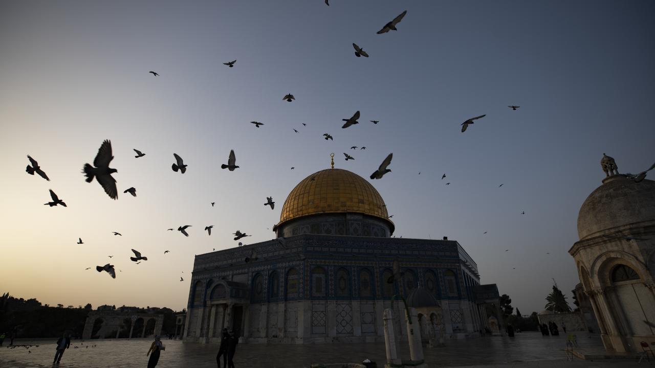 Kudüs'te Müslümanların ilk kıblesi olan Mescid-i Aksa içinde yer alan Kubbetüs Sahra Camisi, akşam saatlerinde etrafında uçan güvercinlerle güzel görüntü oluşturdu.