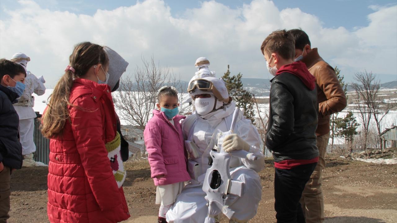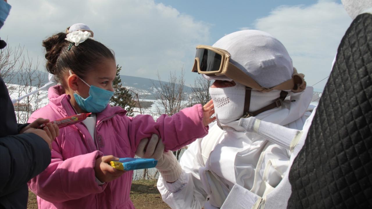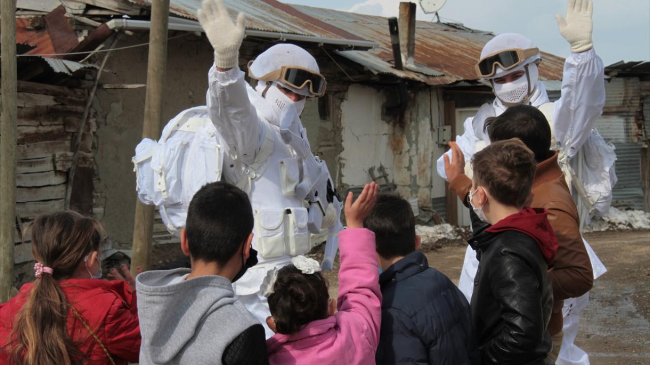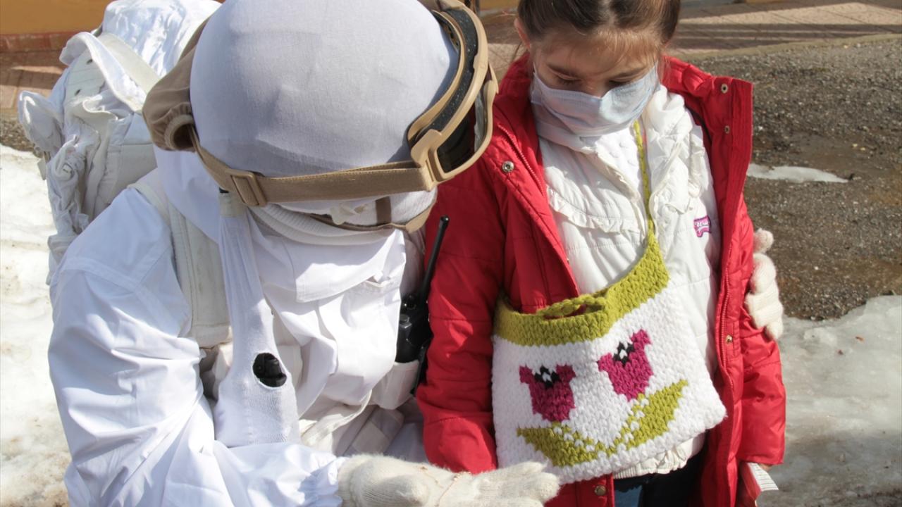 Askerlerin kumanyalarını paylaştığı çocuklar ise Mehmetçiğin teçhizatını ve giydikleri beyaz kamuflaj elbiselerini inceledi.