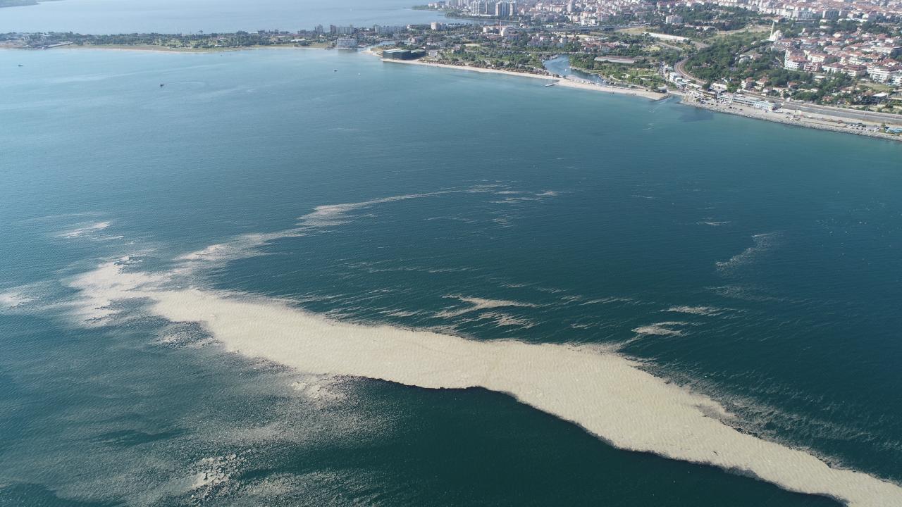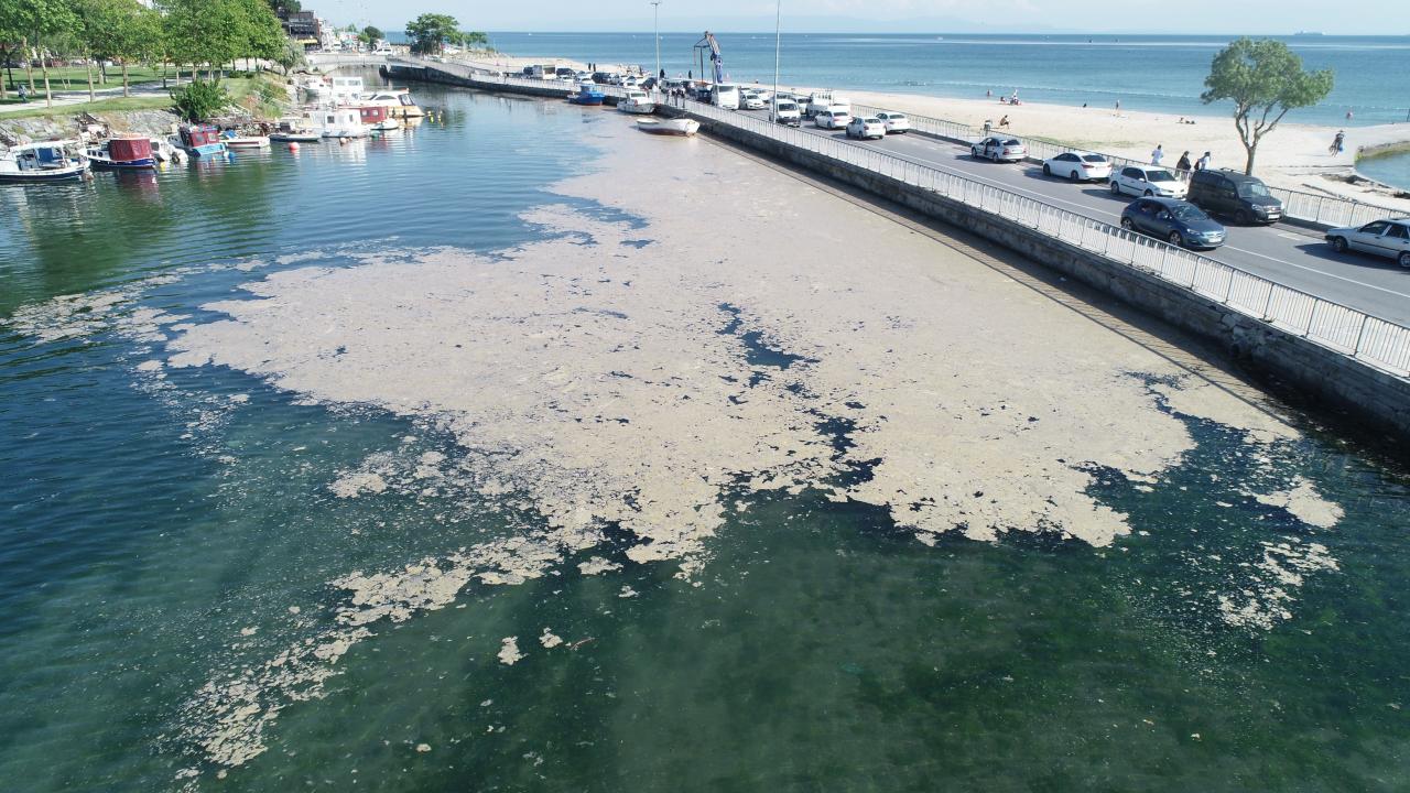 Marmara Denizi'nde etkili olan deniz salyası Küçükçekmece açıklarında ada görüntüsü oluşturdu. Sahile kadar ilerleyerek, Menekşe Deresi'ne ulaşan müsilaj havadan görüntülendi.