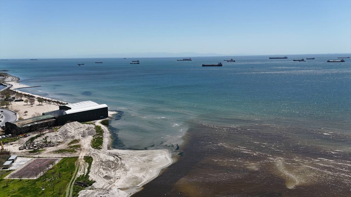Rengi kahverengiye dönen derenin denizle buluştuğu bölge, dronla görüntülendi.
