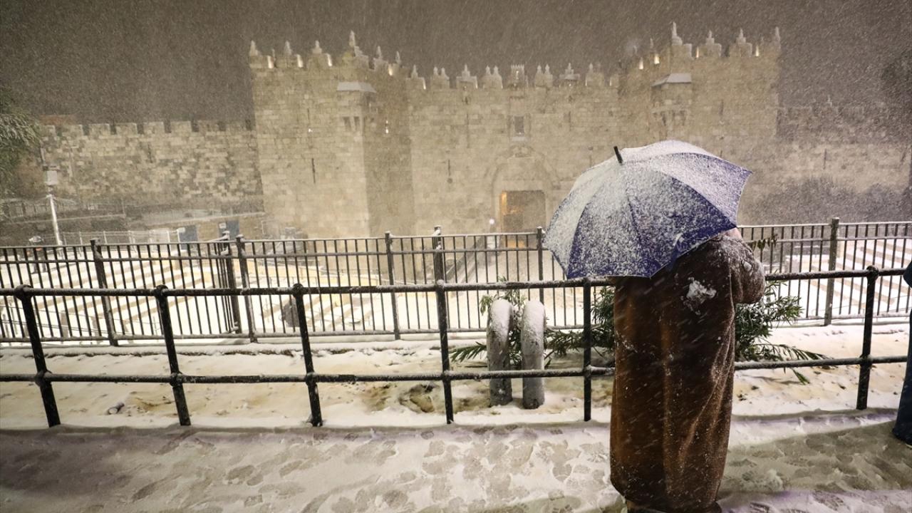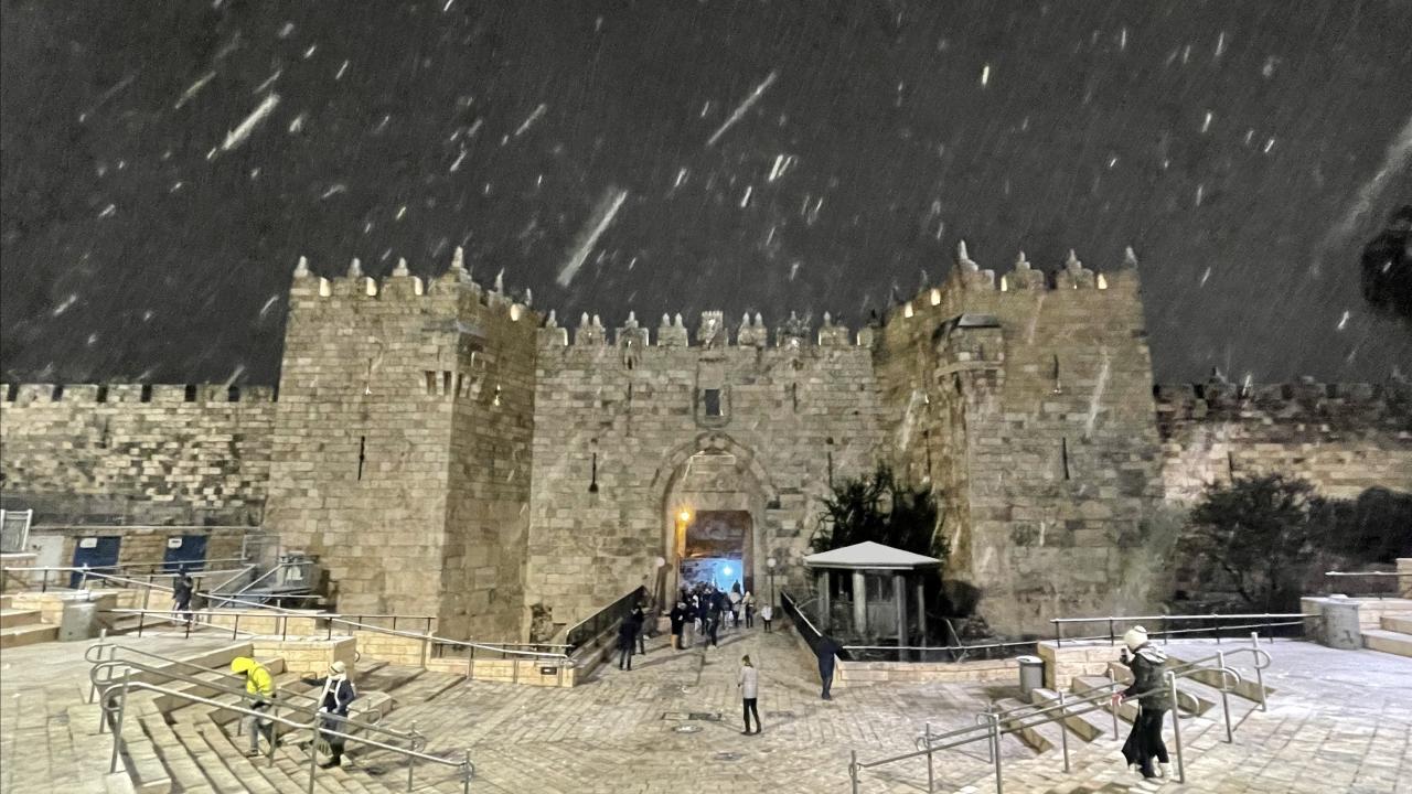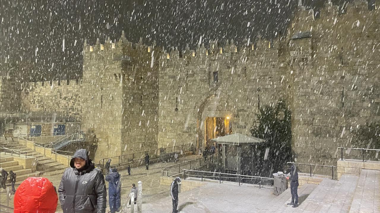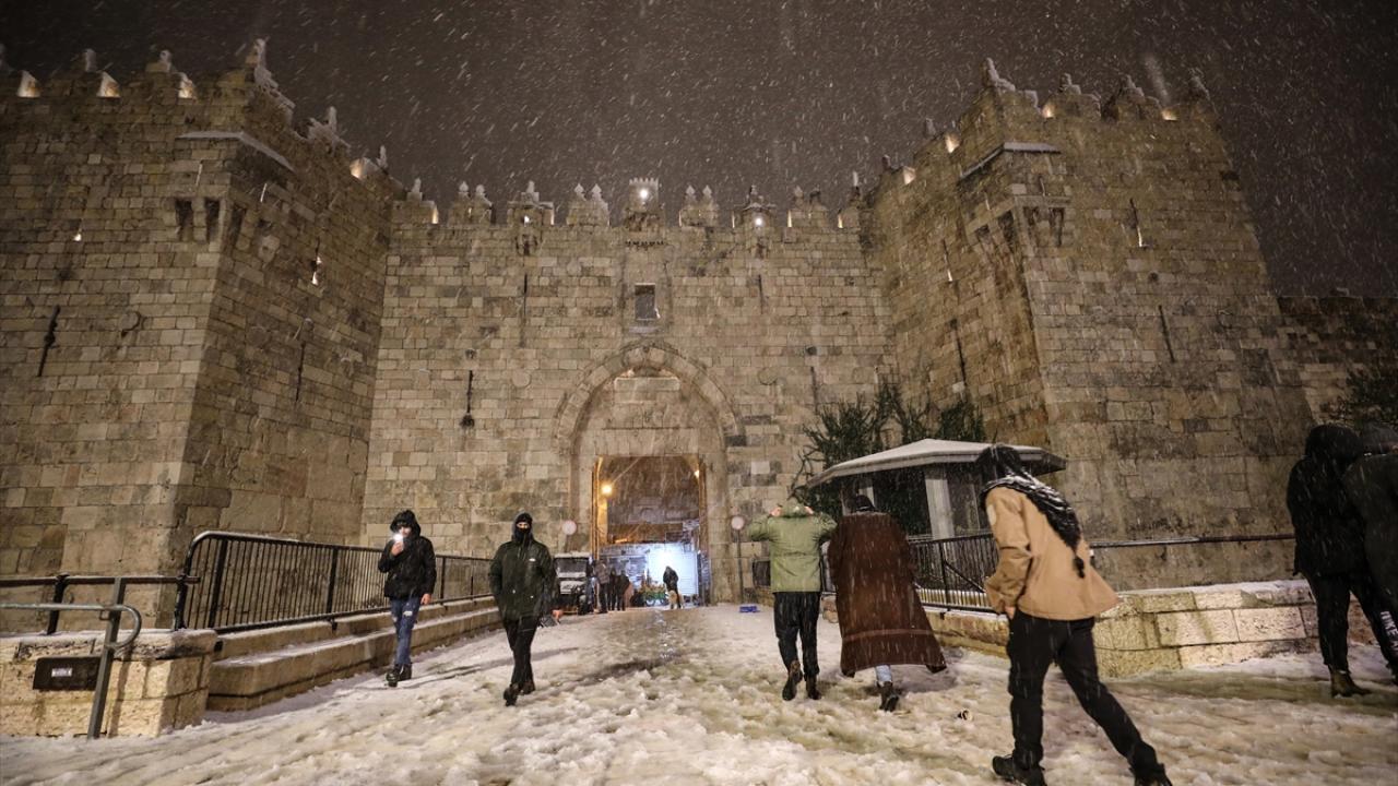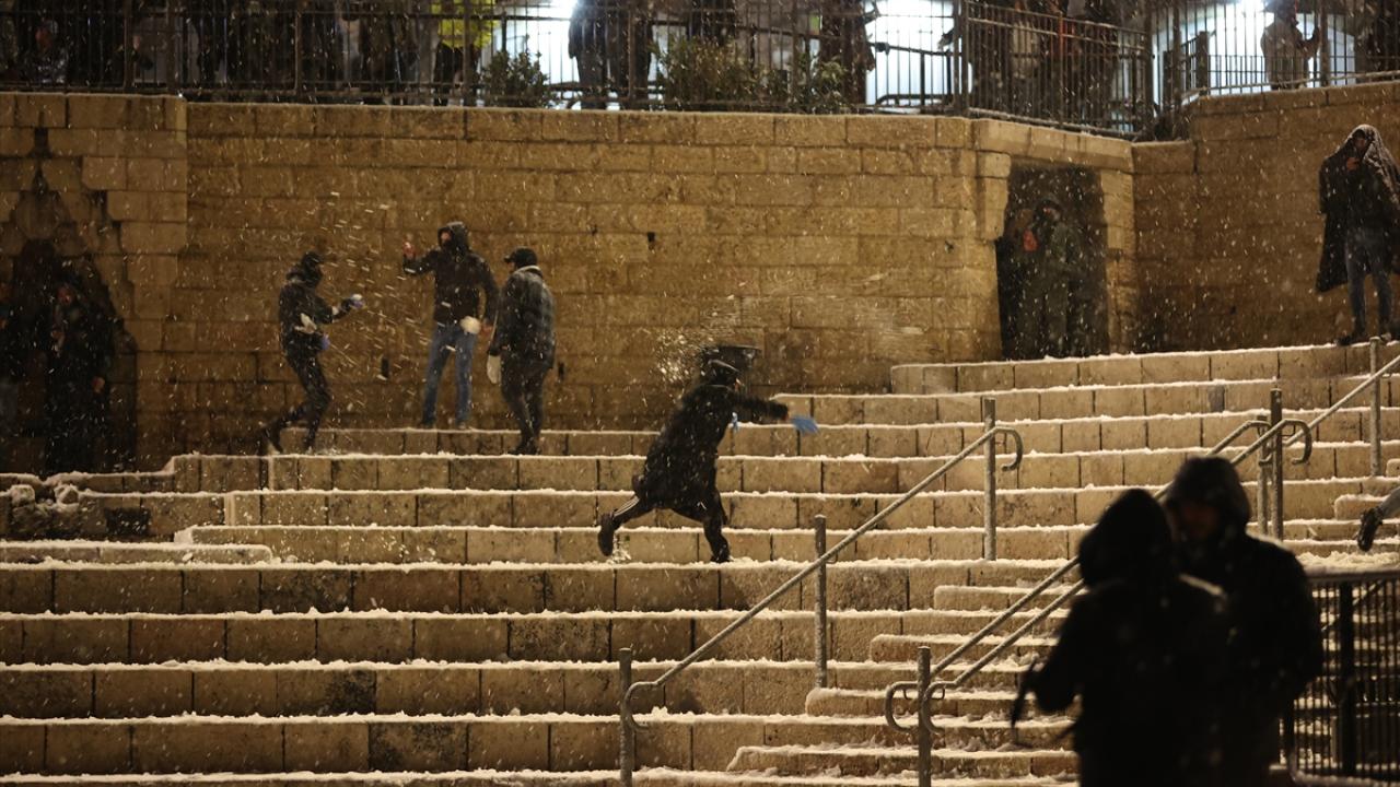Başta çocuklar olmak üzere karın yağmasını fırsat bilen her yaştan Kudüslü, Doğu Kudüs`teki Eski Şehir`in Şam Kapısı çevresinde toplanarak kartopu savaşı yaptı.