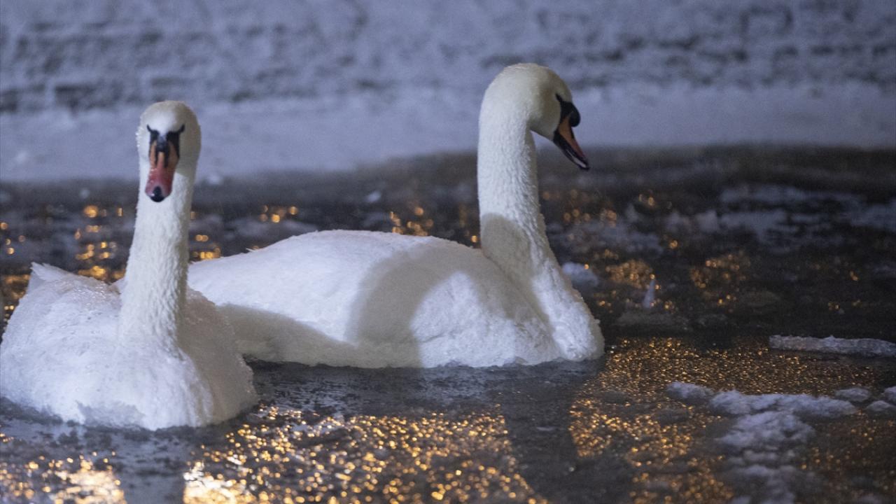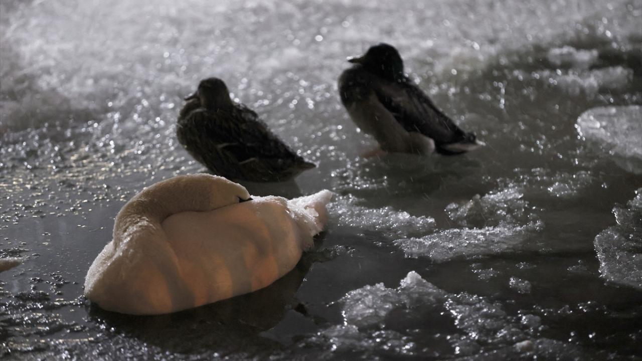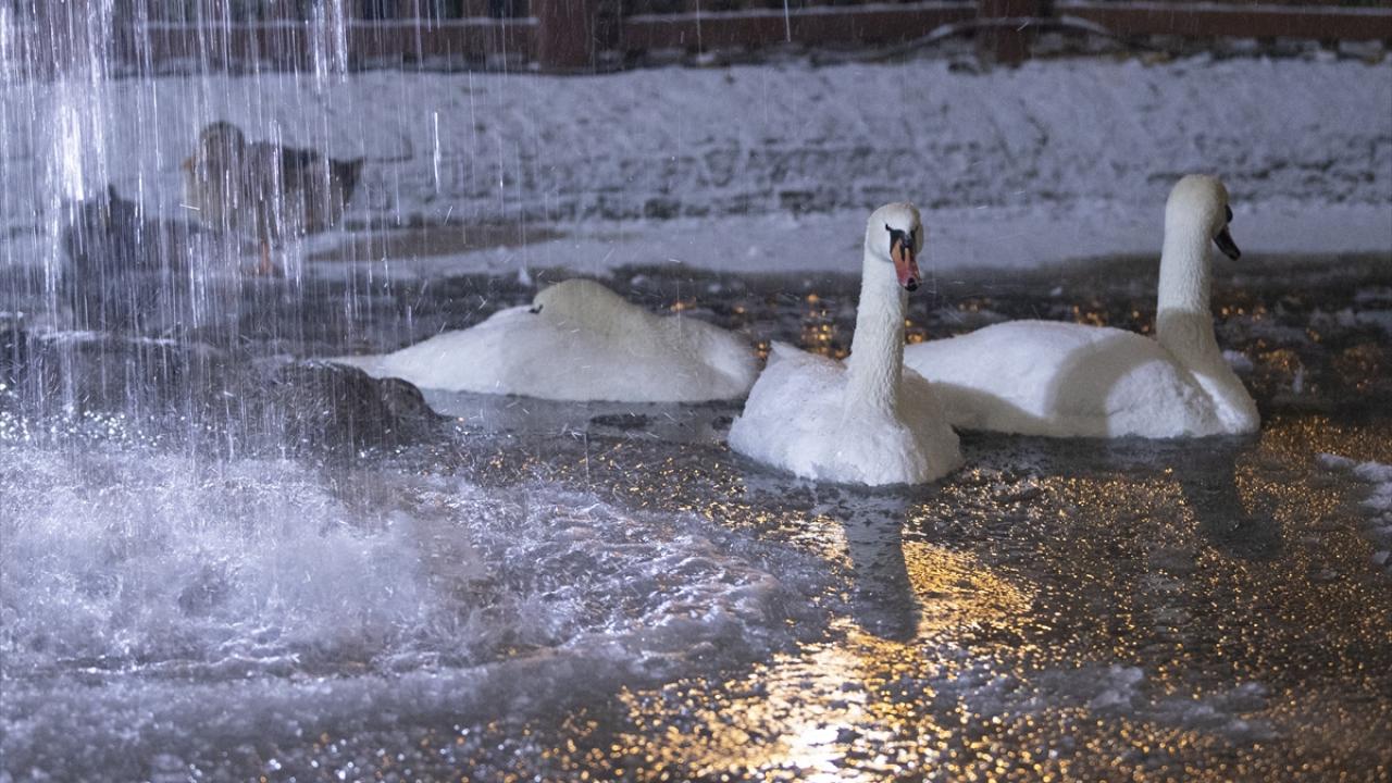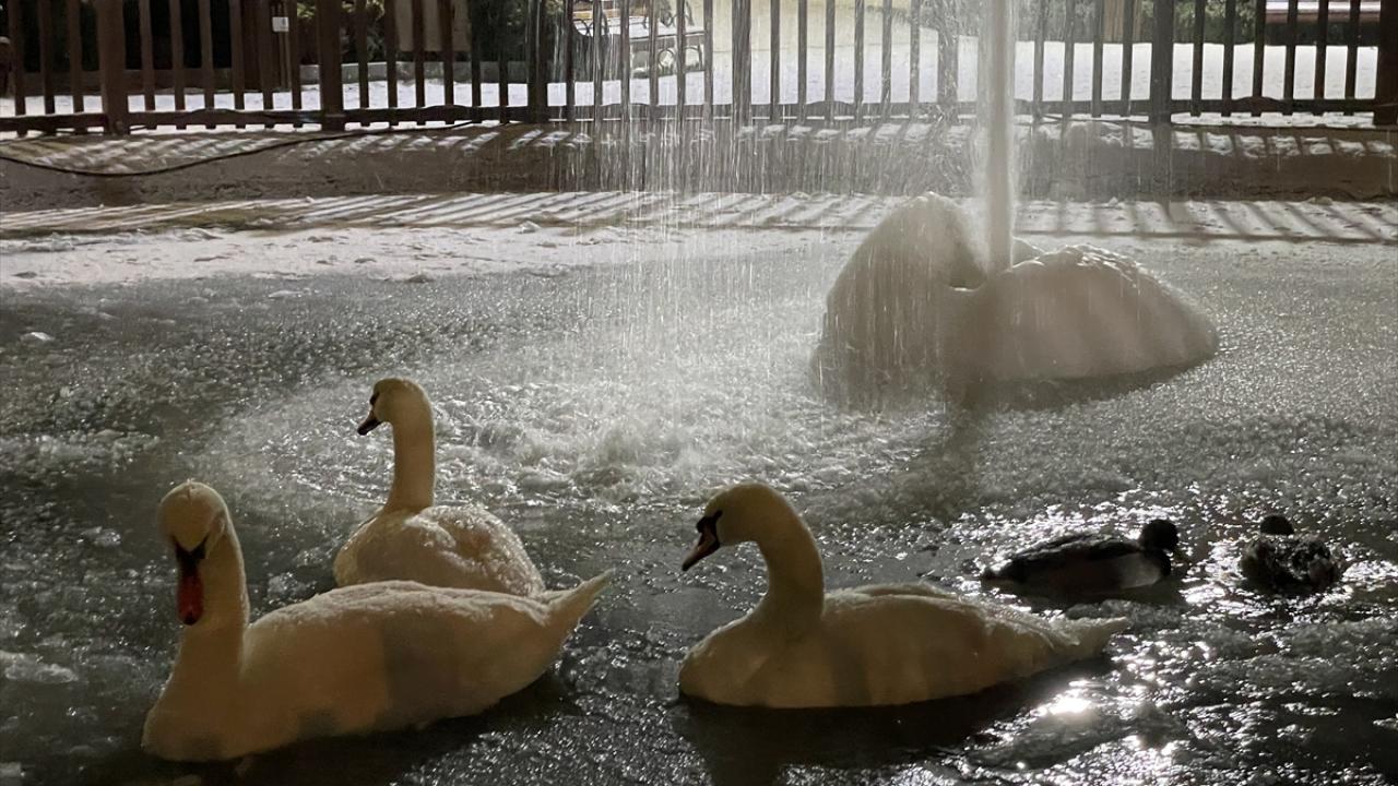 Havuzdaki fıskiyelerin altlarında buz kalıpları oluşurken, parkın ev sahipleri kuğular ve ördeklerin yaşam alanı daraldı.