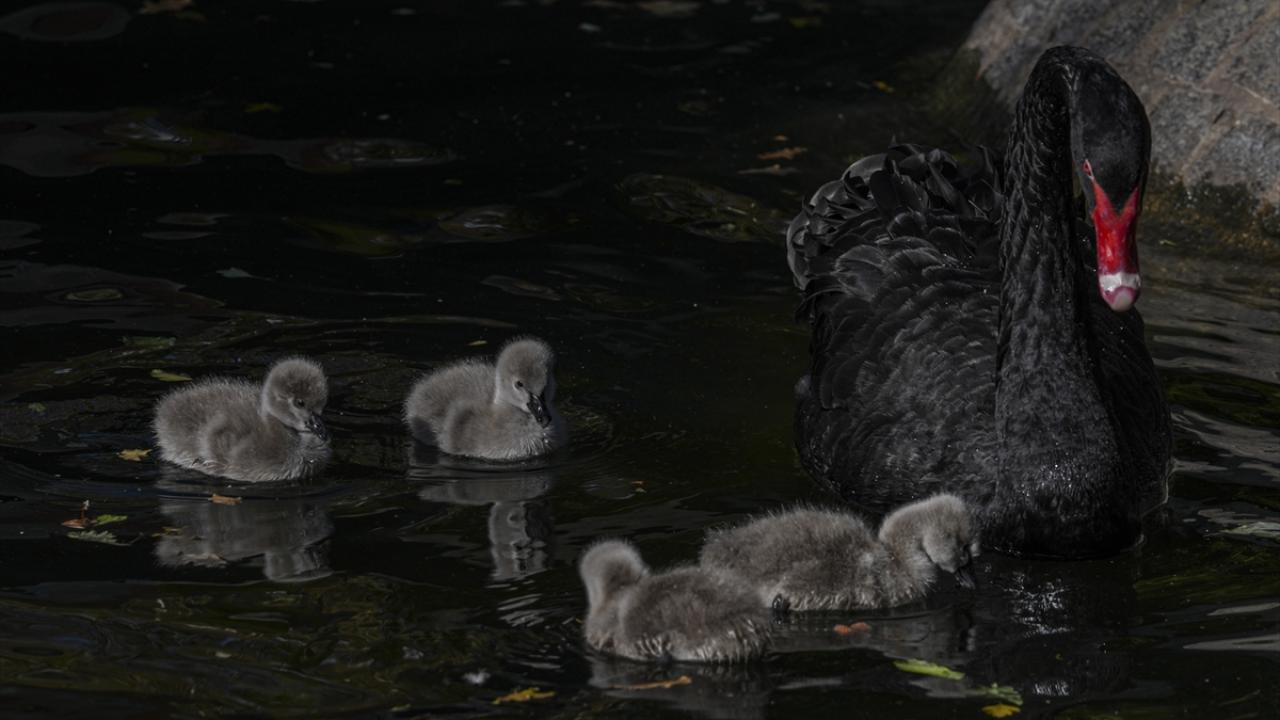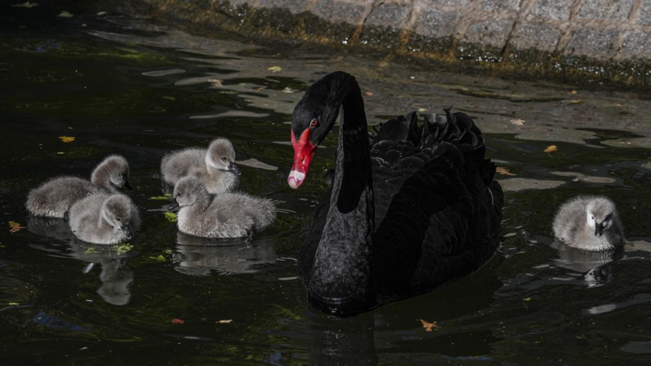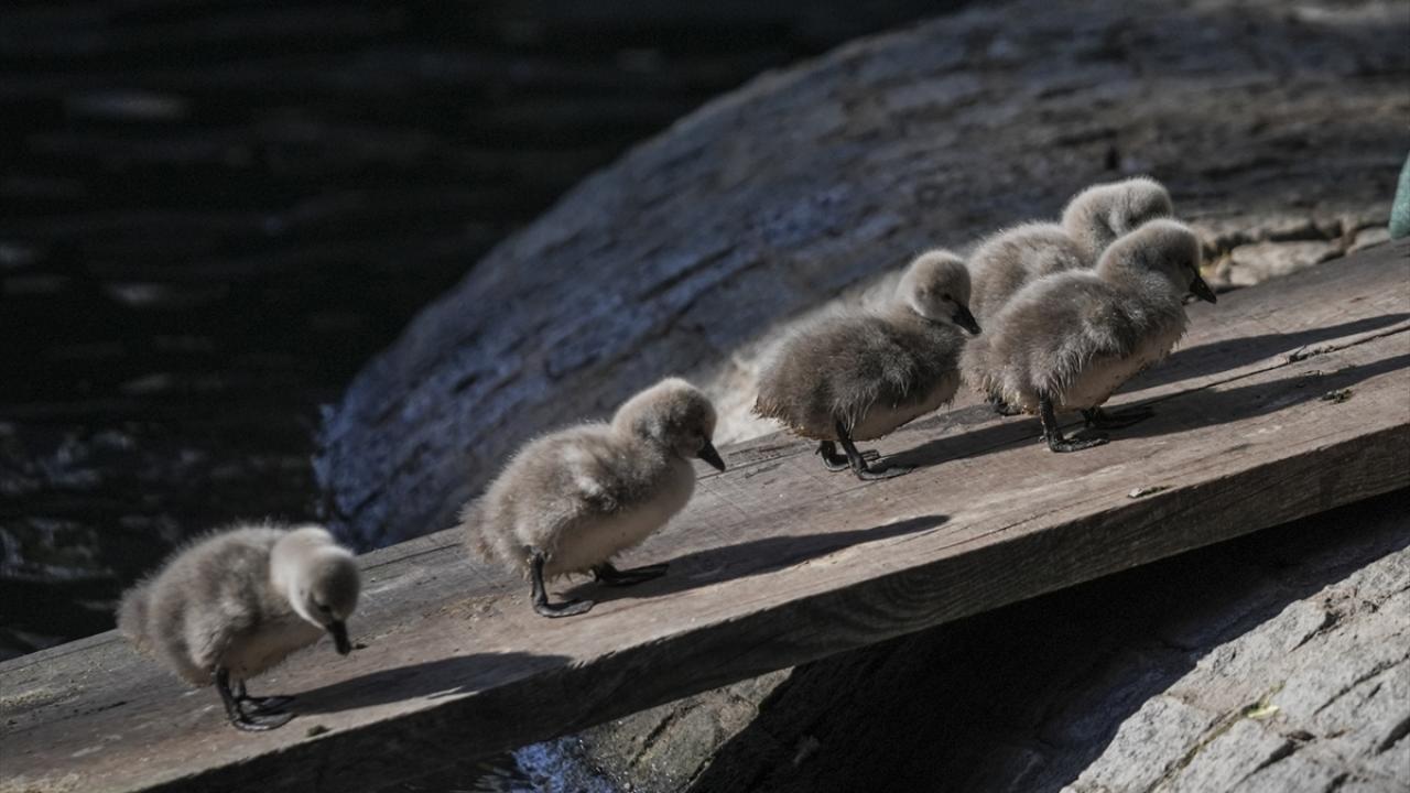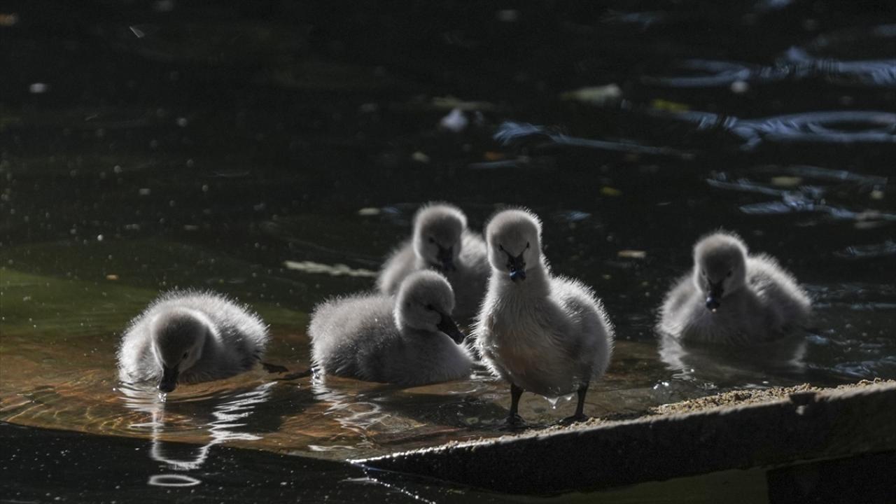 Ankara'nın simgelerinden Kuğulu Park'ta dünyaya gelen 5 siyah kuğu yavrusu suyla buluştu.