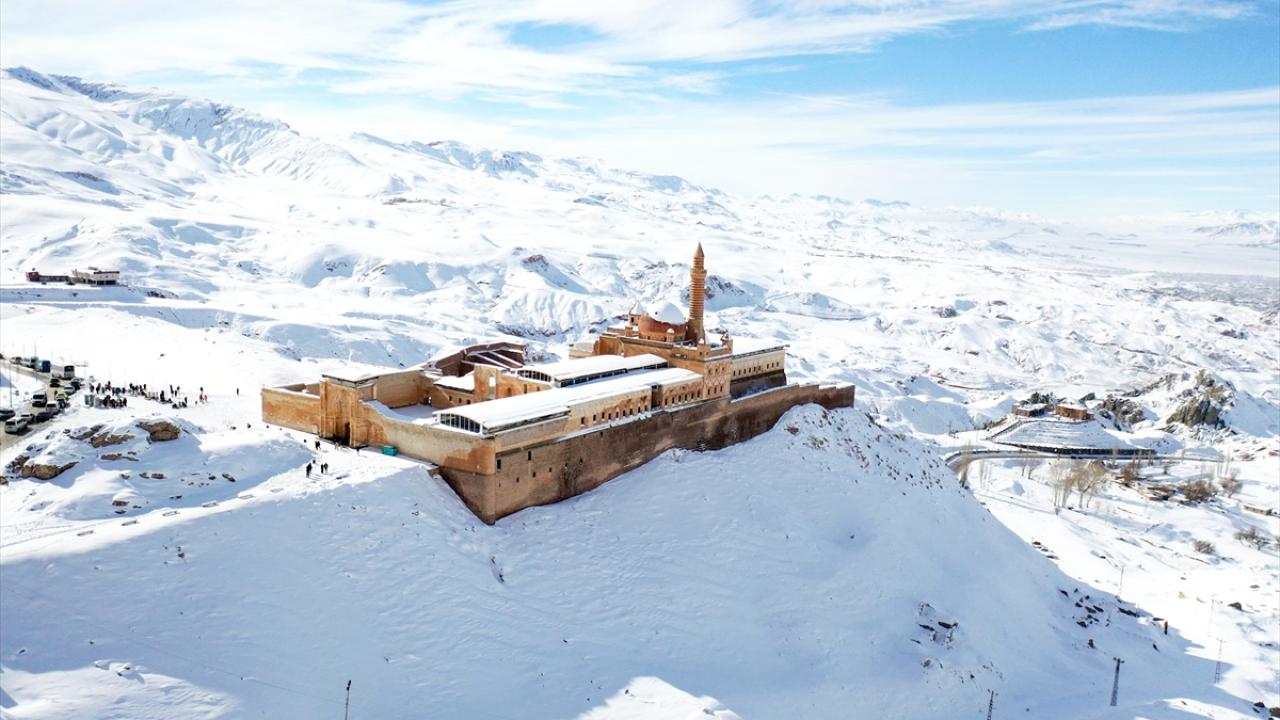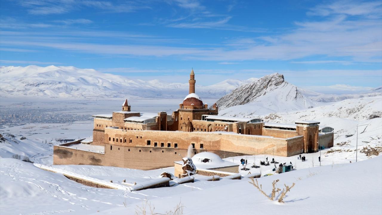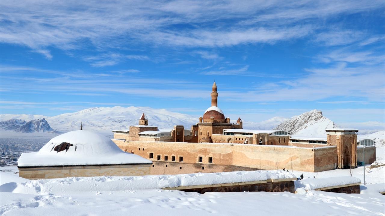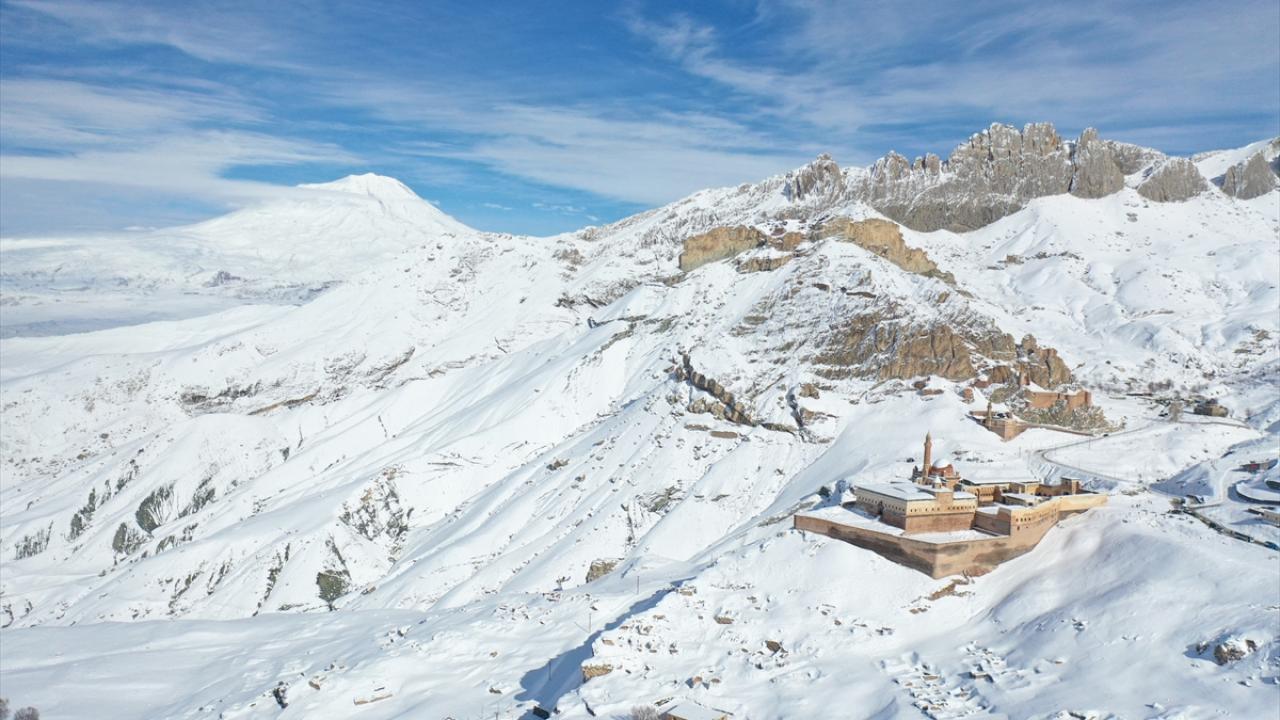 Türkiye`nin 5137 metreyle en yüksek dağı olan Ağrı Dağı`nın eteklerindeki ilçede yer alan İshak Paşa Sarayı ile çevresi karla kaplandı.