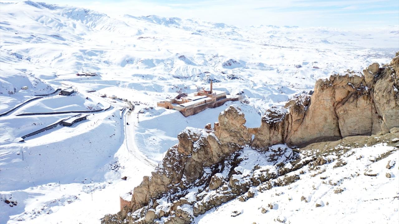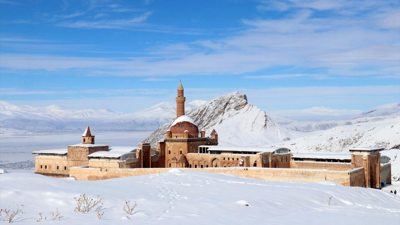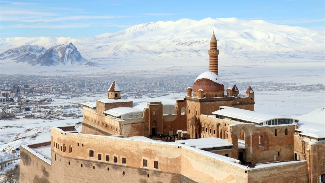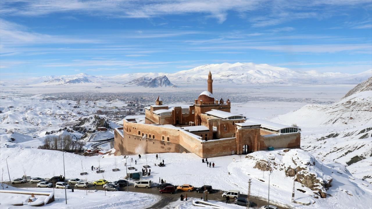 Türkiye`nin 5137 metreyle en yüksek dağı olan Ağrı Dağı`nın eteklerindeki ilçede yer alan İshak Paşa Sarayı ile çevresi karla kaplandı.