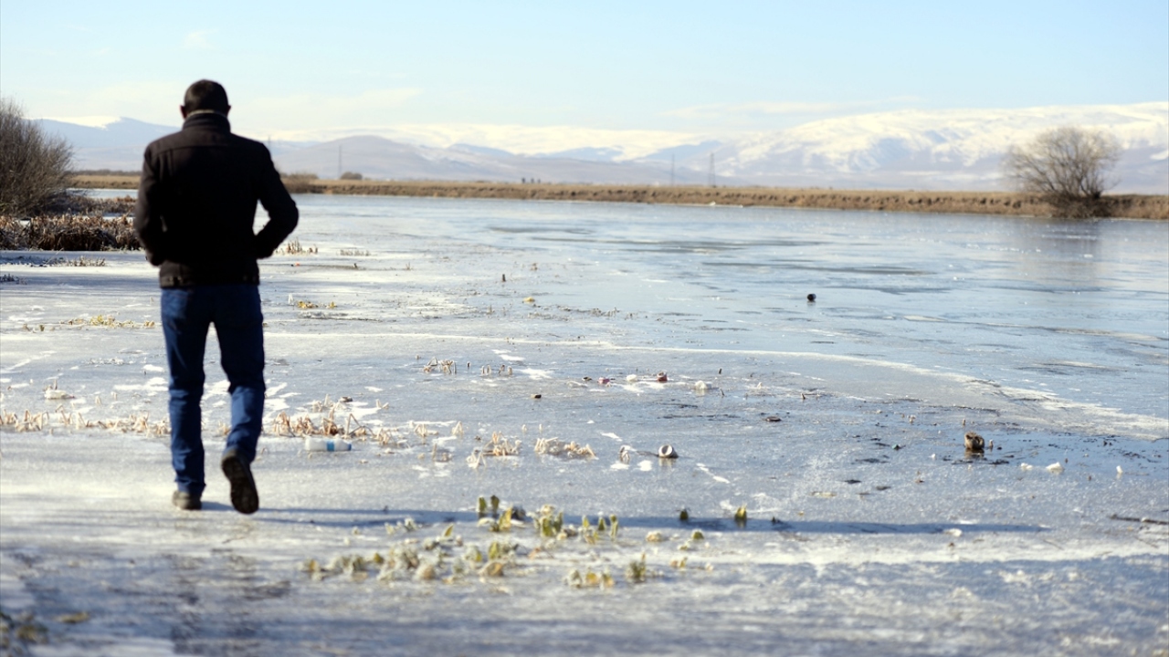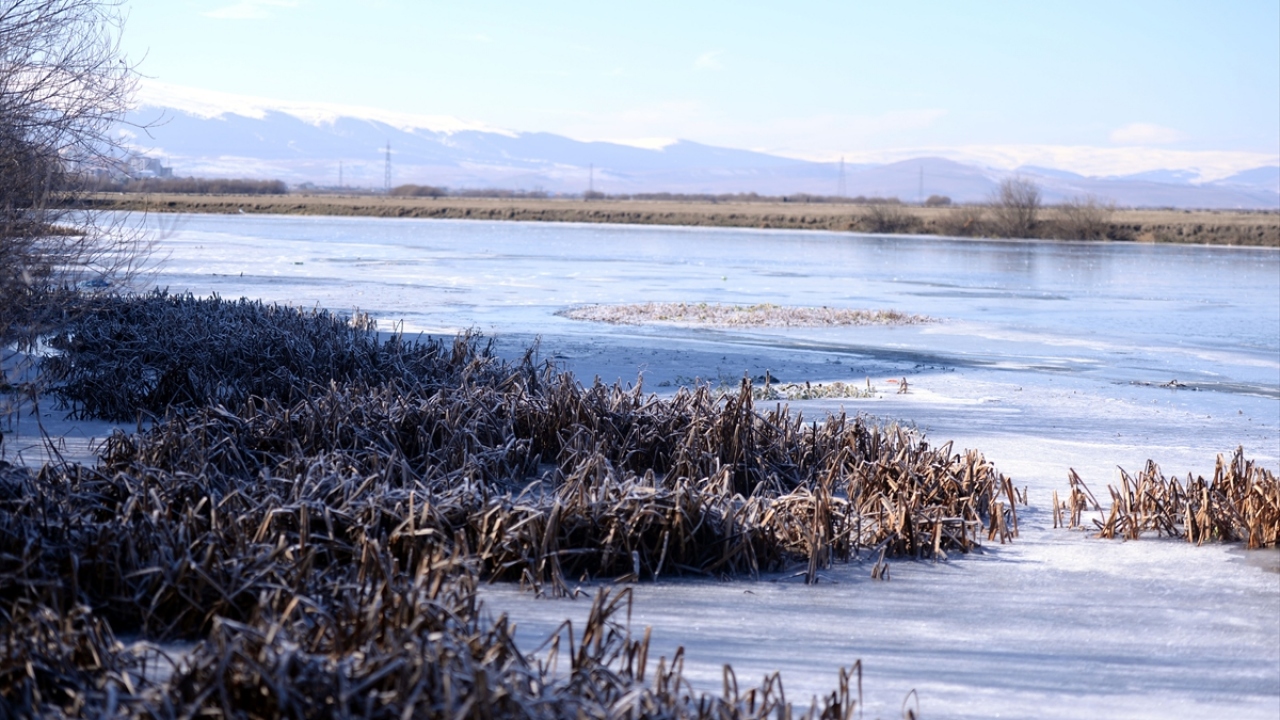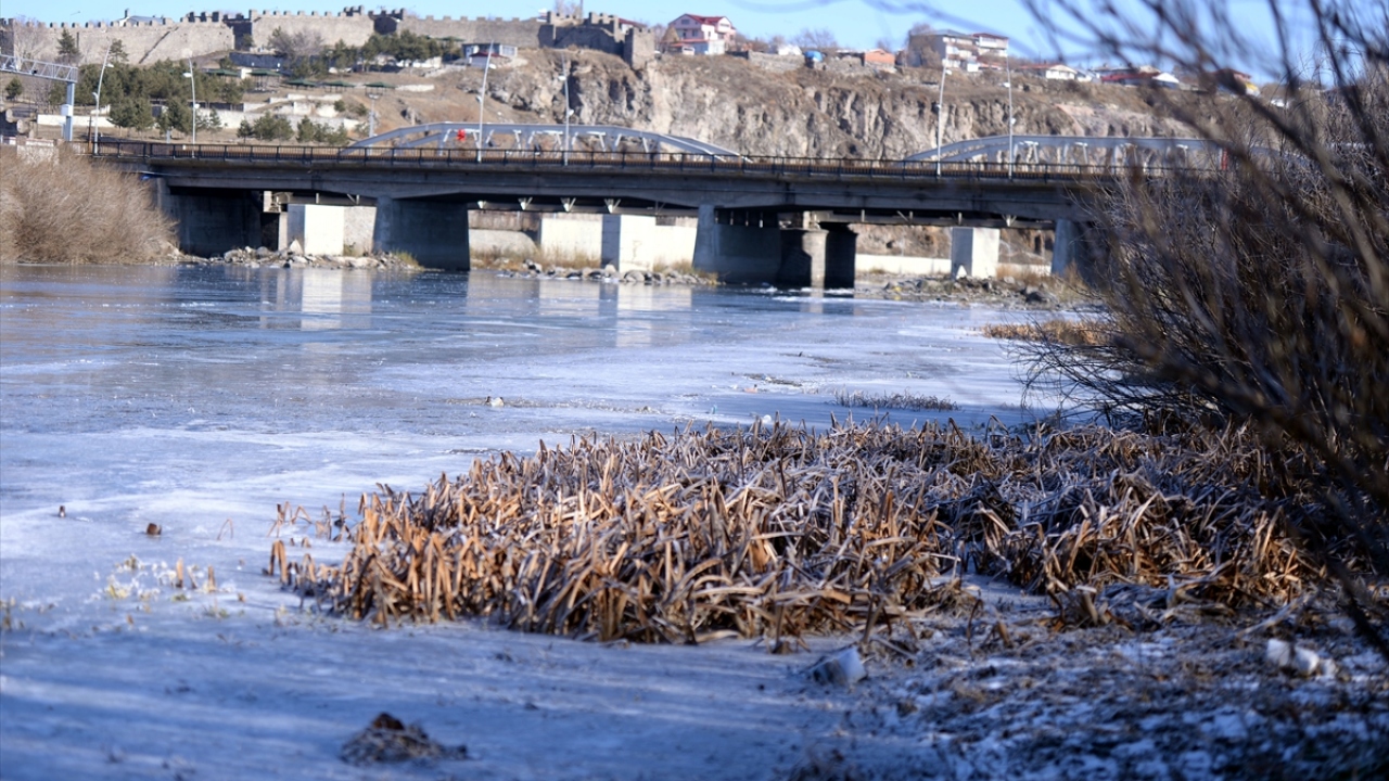 Gece hava sıcaklığının sıfırın altında 10 dereceye kadar düştüğü Ardahan'da Kura Nehri'nin yüzeyi buzla kaplandı.