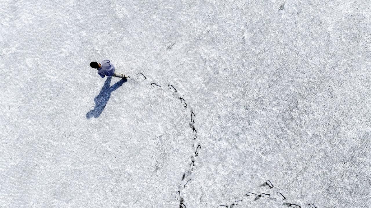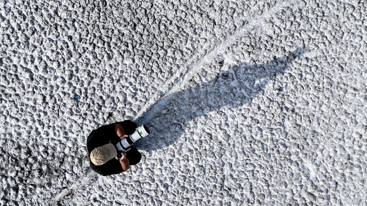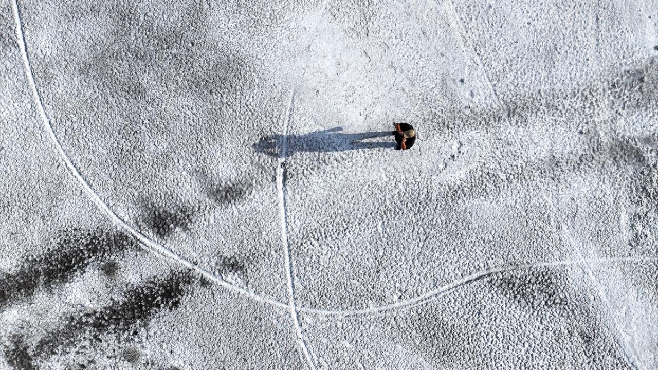 Yüzeyi kar ve buzla kaplı Çıldır Gölü, ziyaretçilerini ağırlıyor