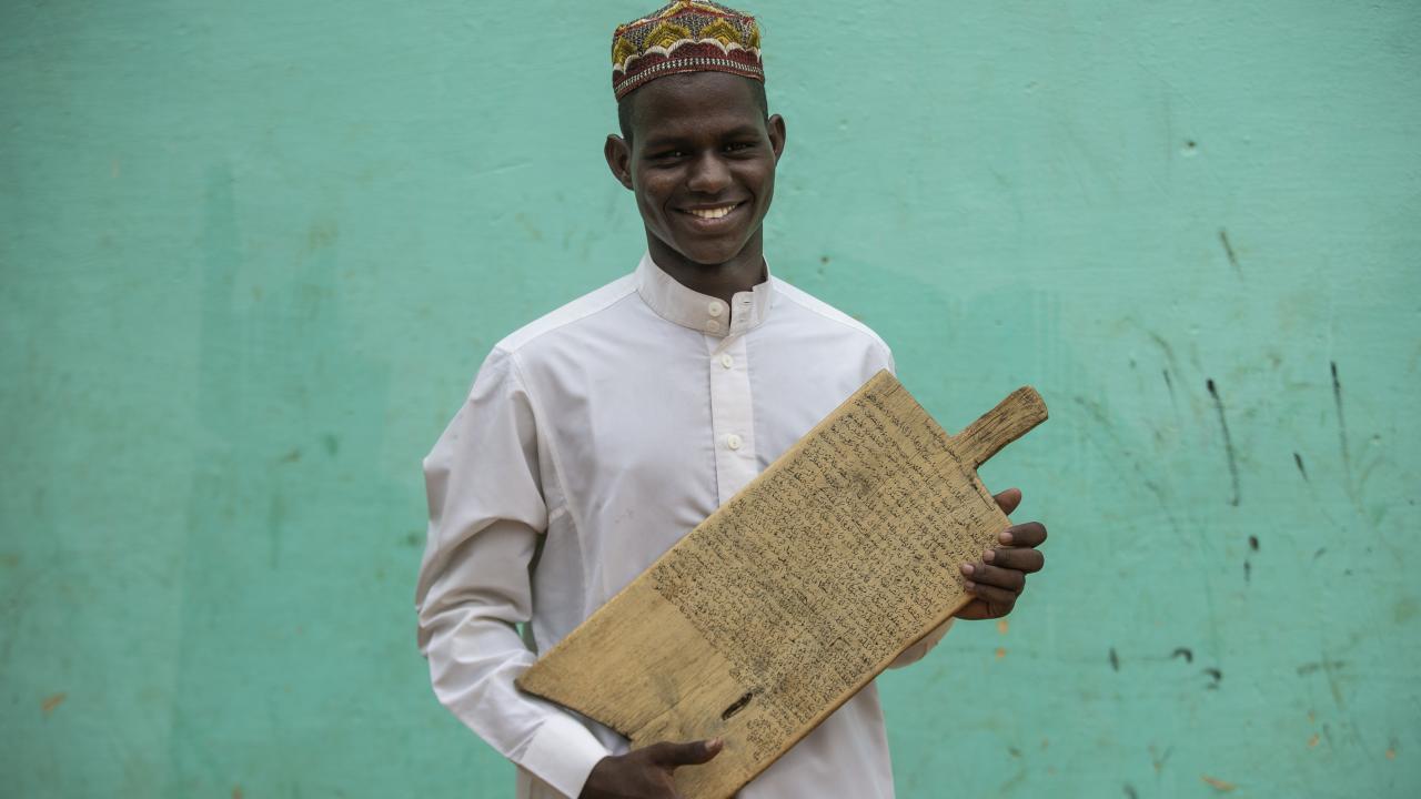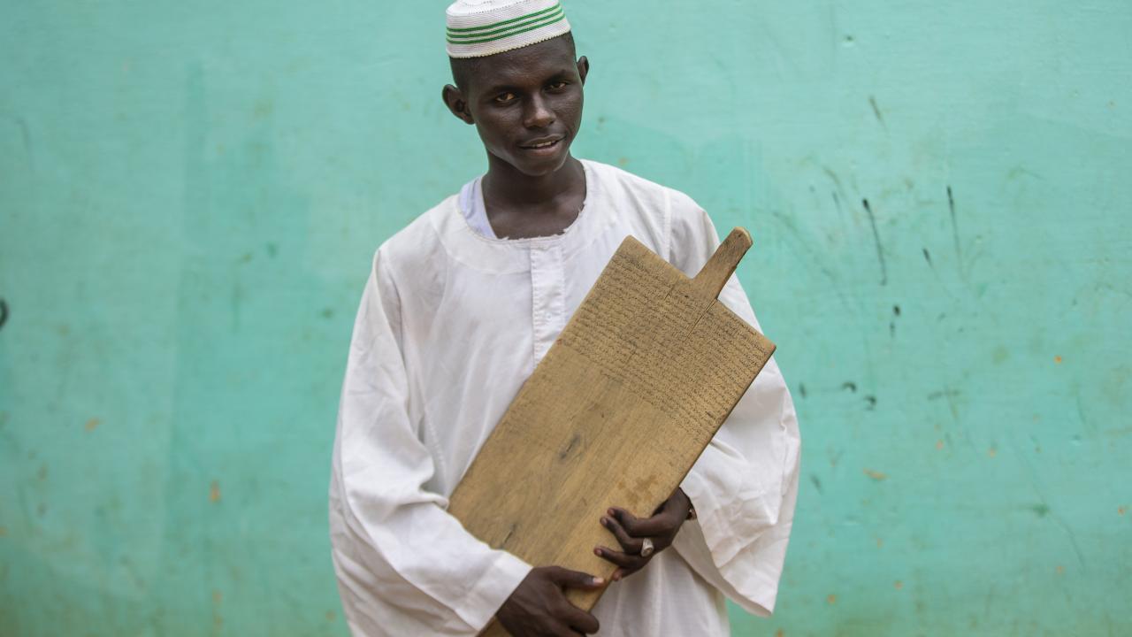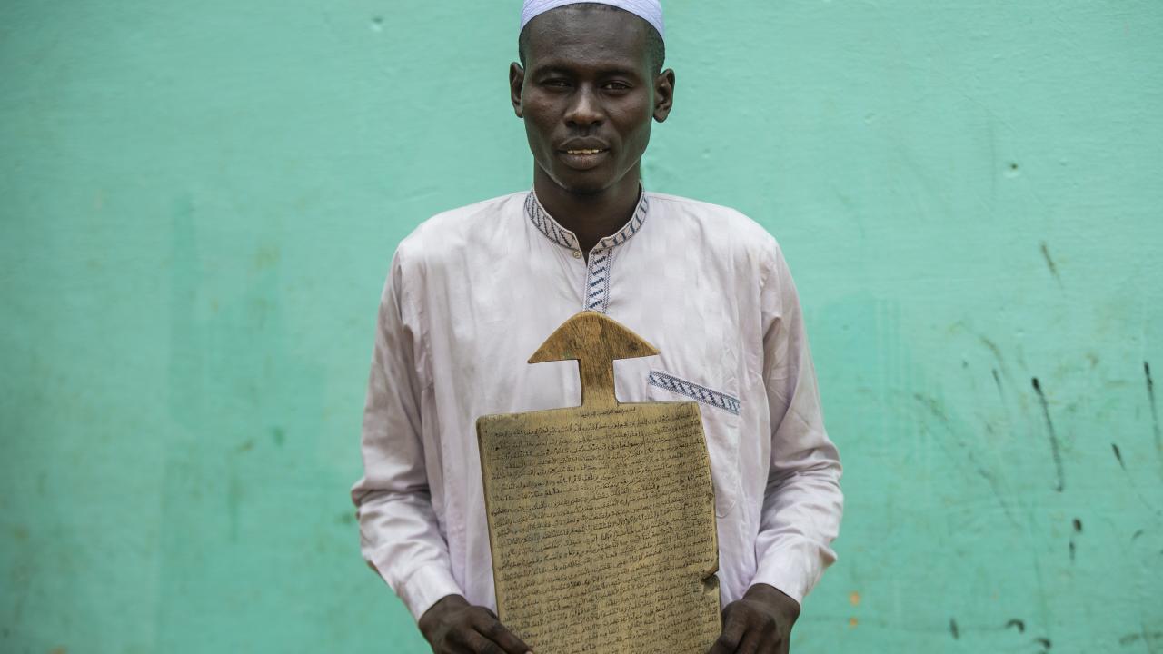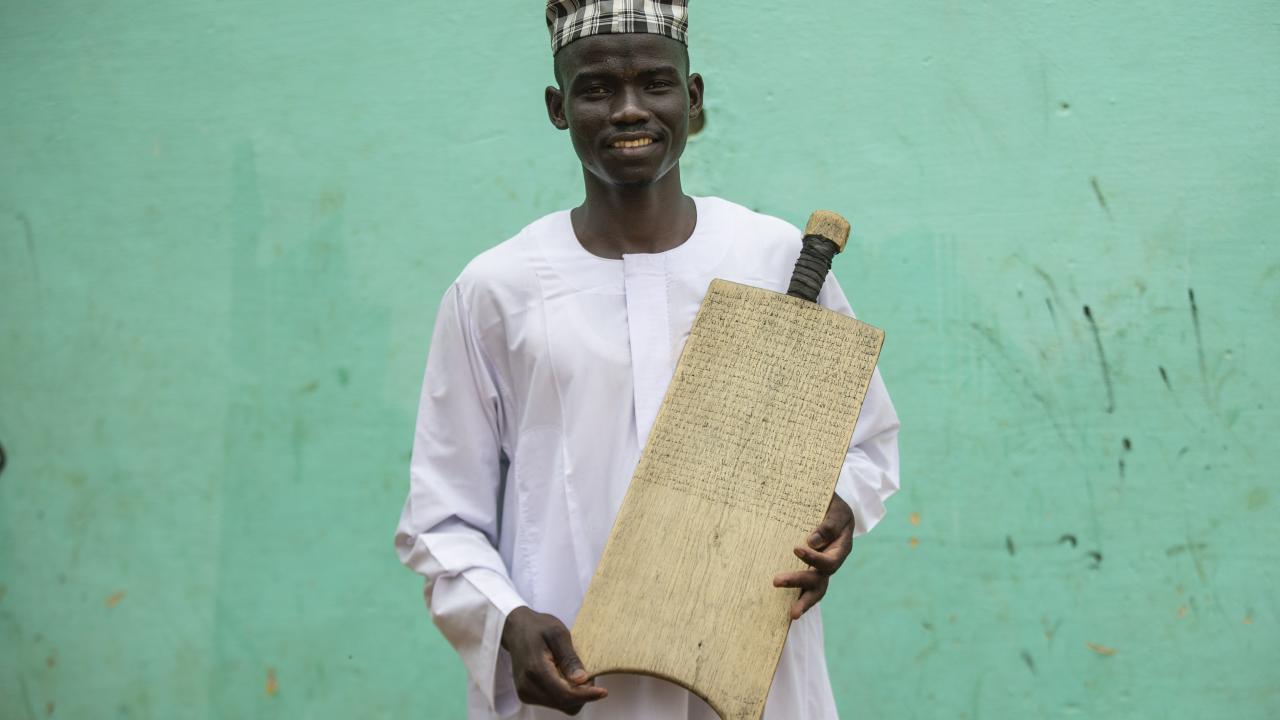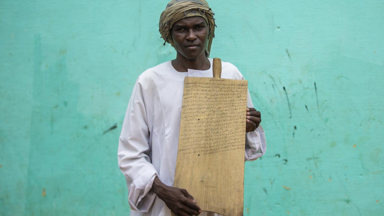 Sudan'ın başkenti Hartum'da gençler, Kur'an-ı Kerim okumayı tahta levhalar üzerinde yazan ayetlerden öğreniyor.