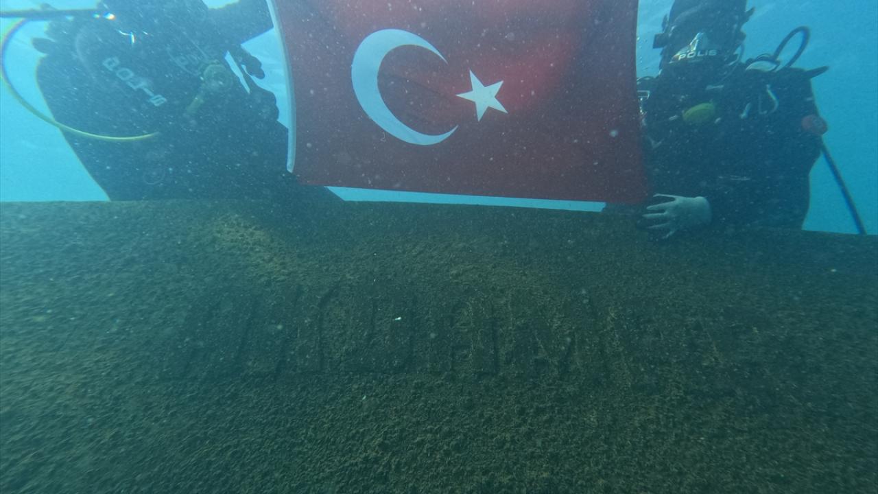 Gölde 1900`lü yıllarda yük taşımacılığında kullanıldığı belirtilen ve Bitlis`in Tatvan ilçesine bağlı Reşadiye köyü yakınlarında batan "Akdamar" isimli teknenin bulunduğu alanda dalış yapan kurbağa adamlar, batık tekneyi görüntüledi, Türk bayrağıyla fotoğraf çekti.
