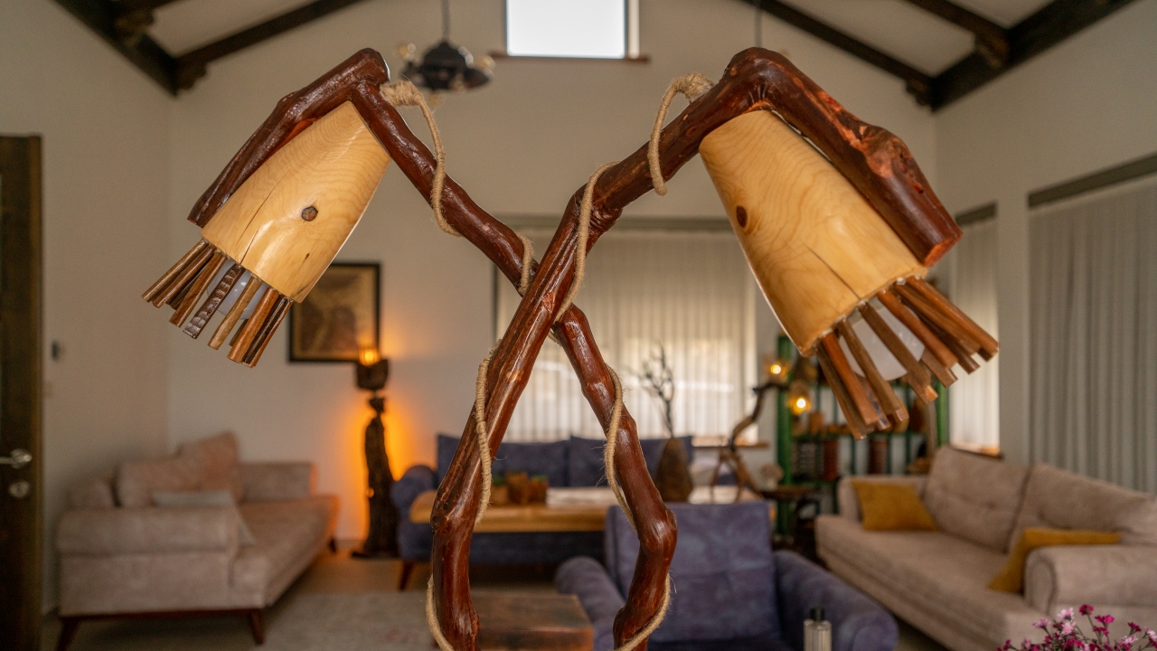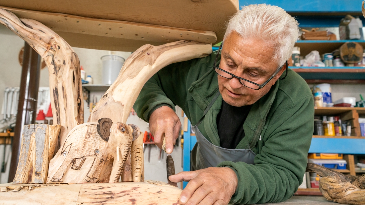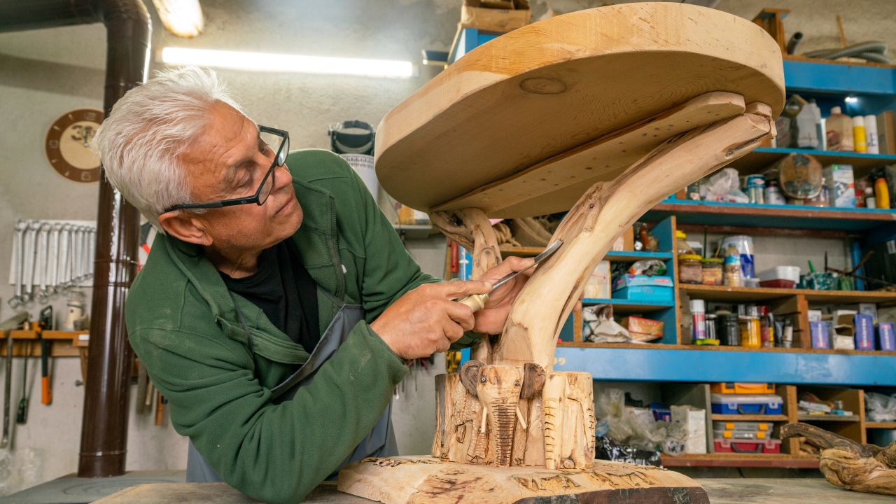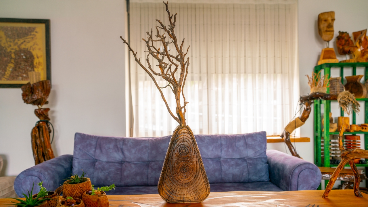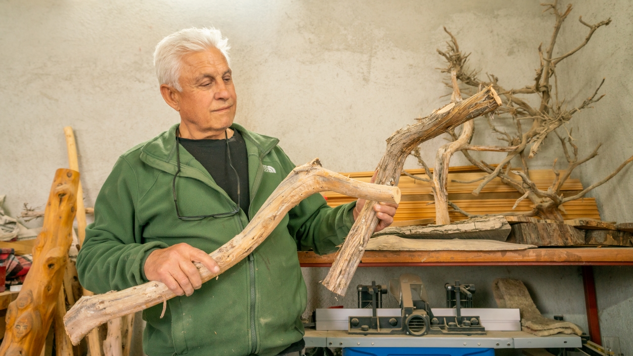 Evinin bahçesine küçük bir atölye kuran Taraşlı ormandan topladığı kuru dal, budak ve köklerin doğal şekillerinden yararlanarak eserler üretir.