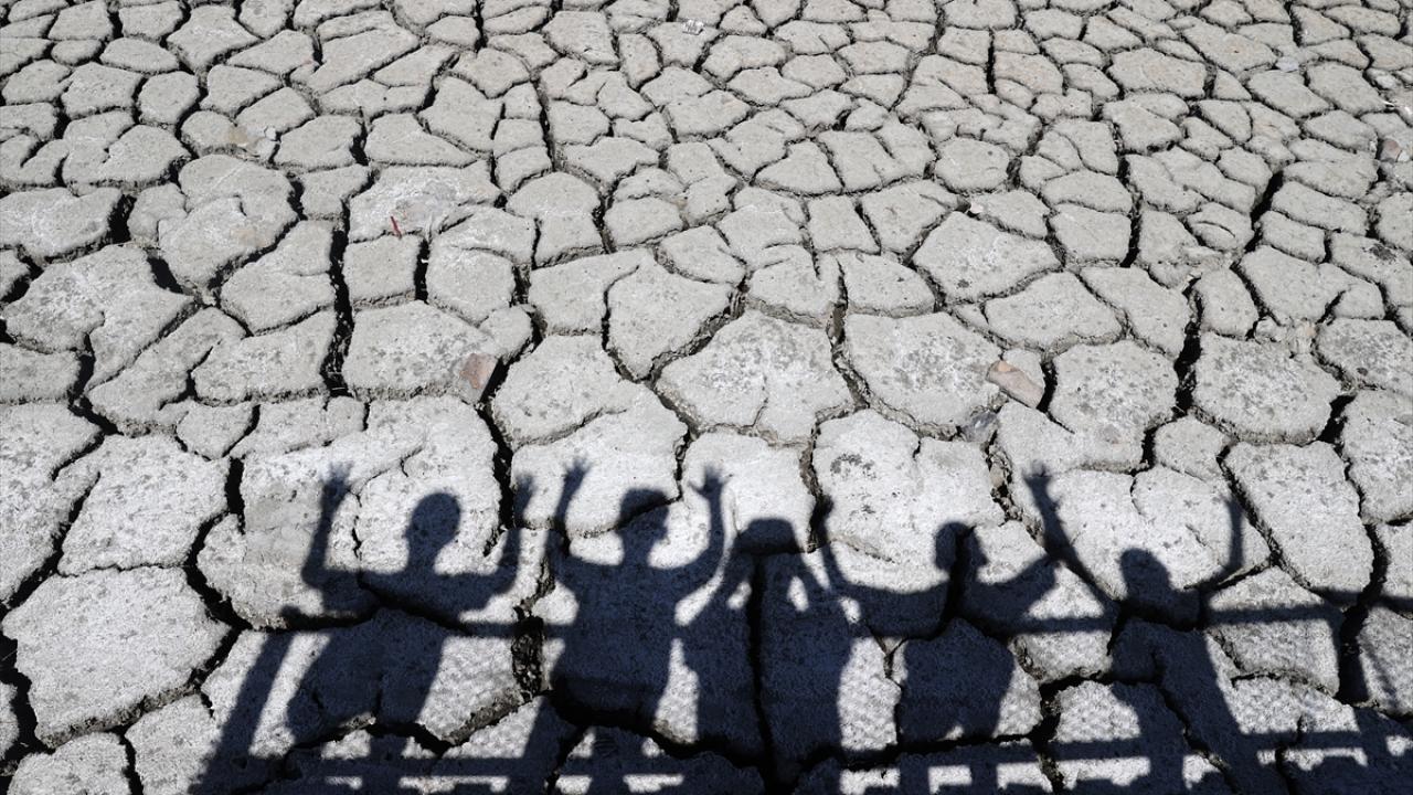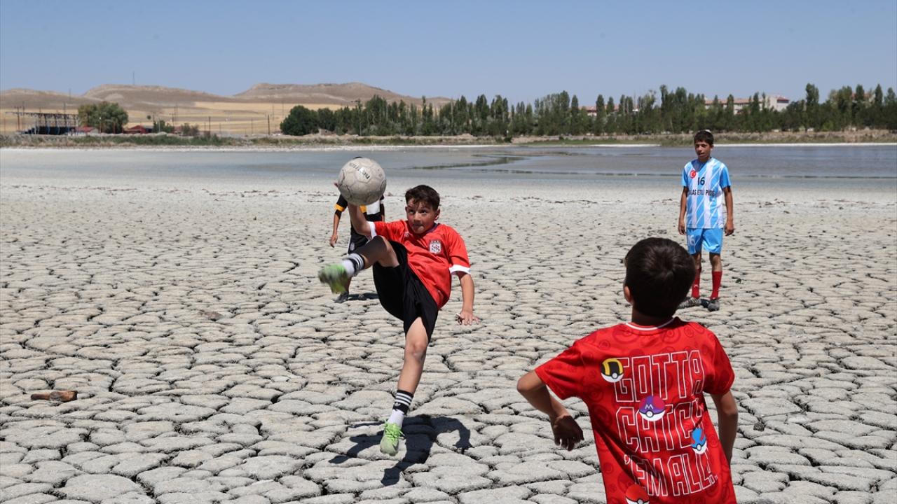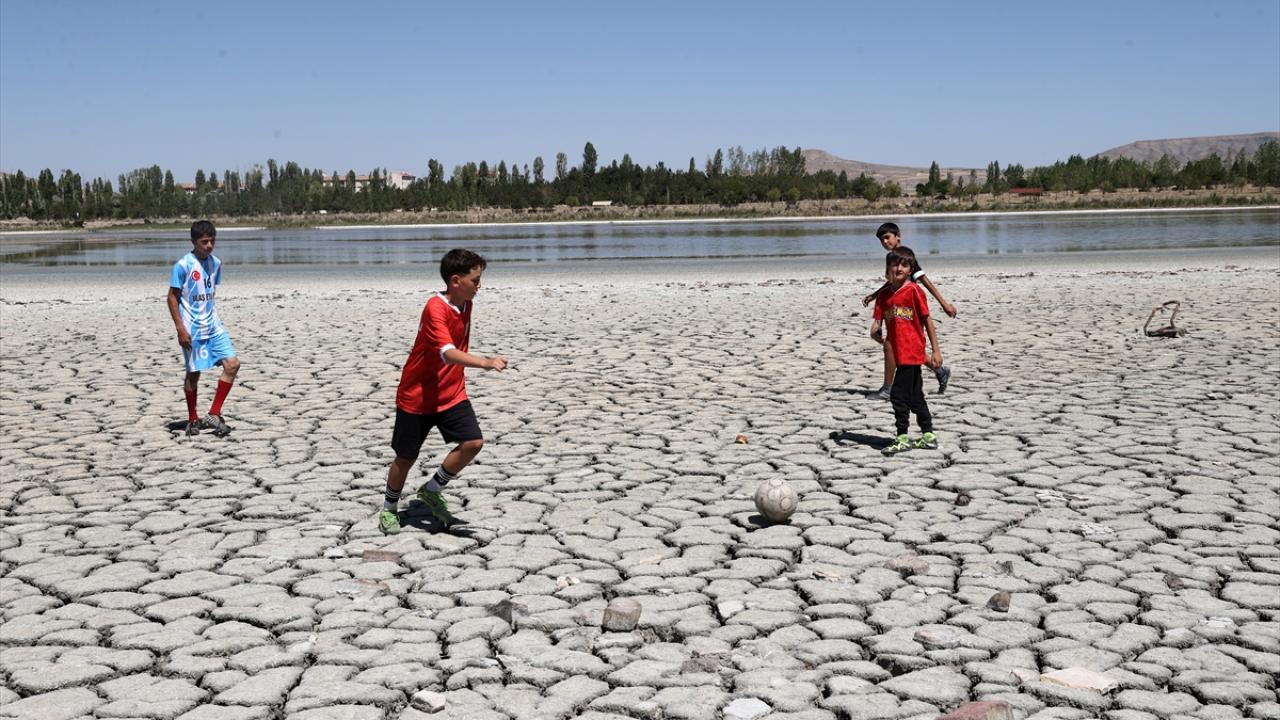 Balık ölümlerinin de yaşandığı gölün kuruyan kısımlarında bazı çocuklar futbol oynadı.