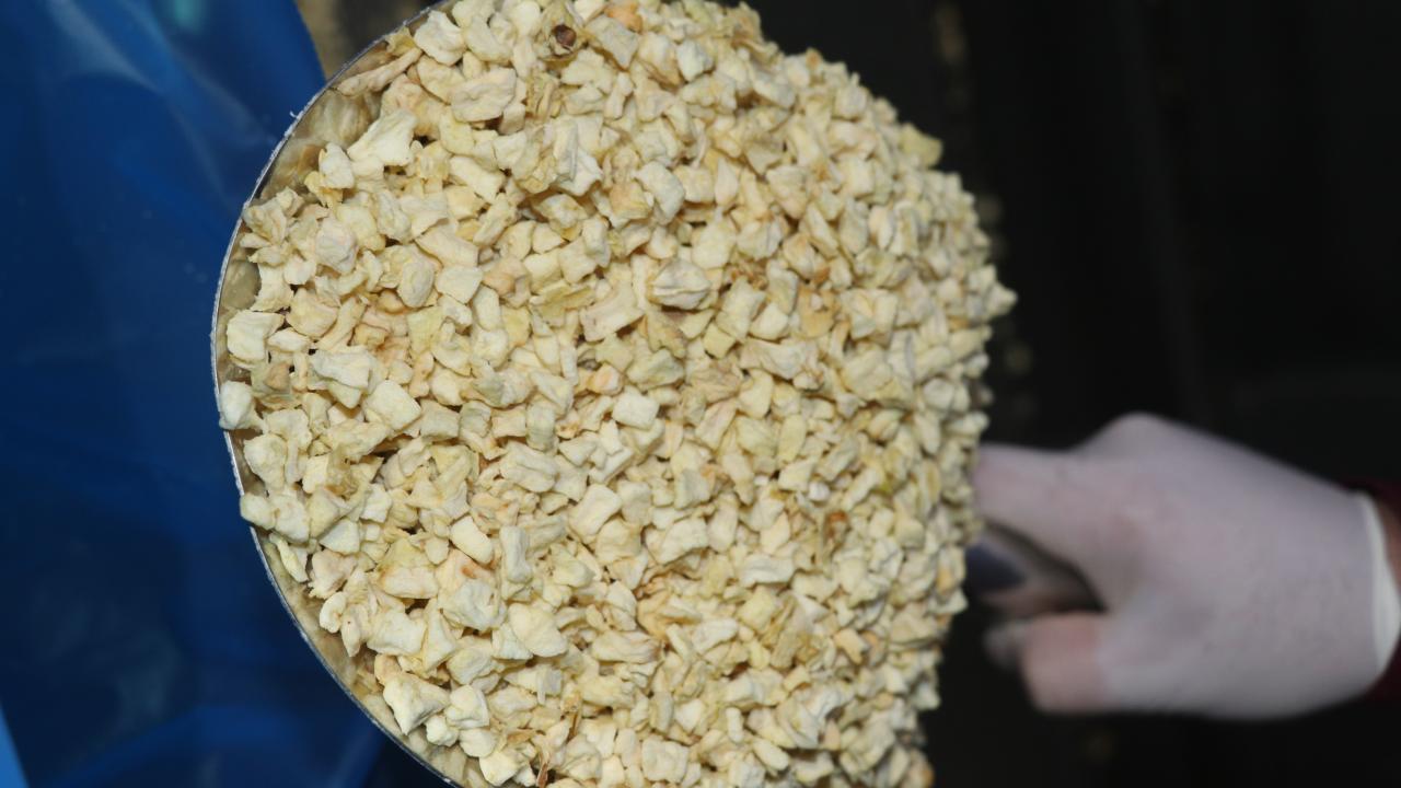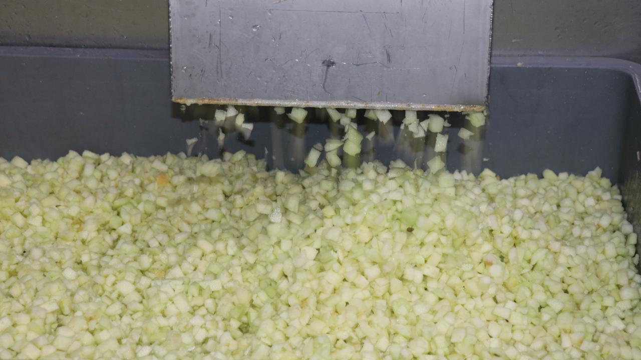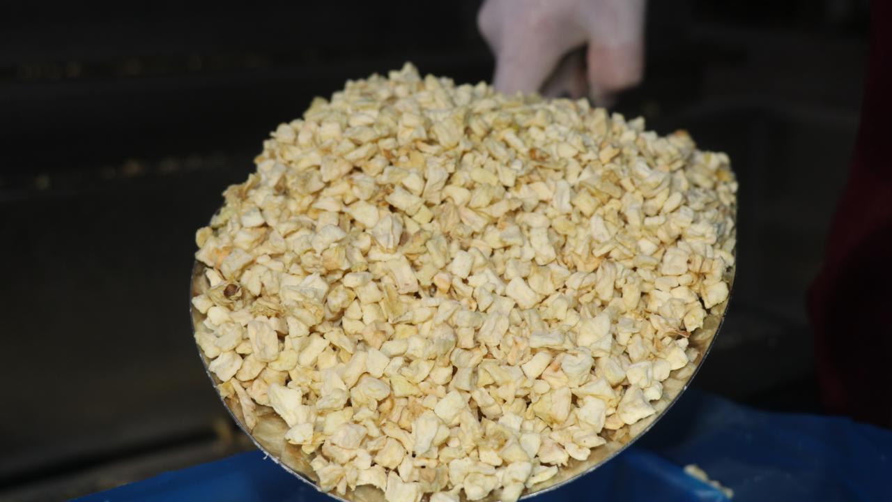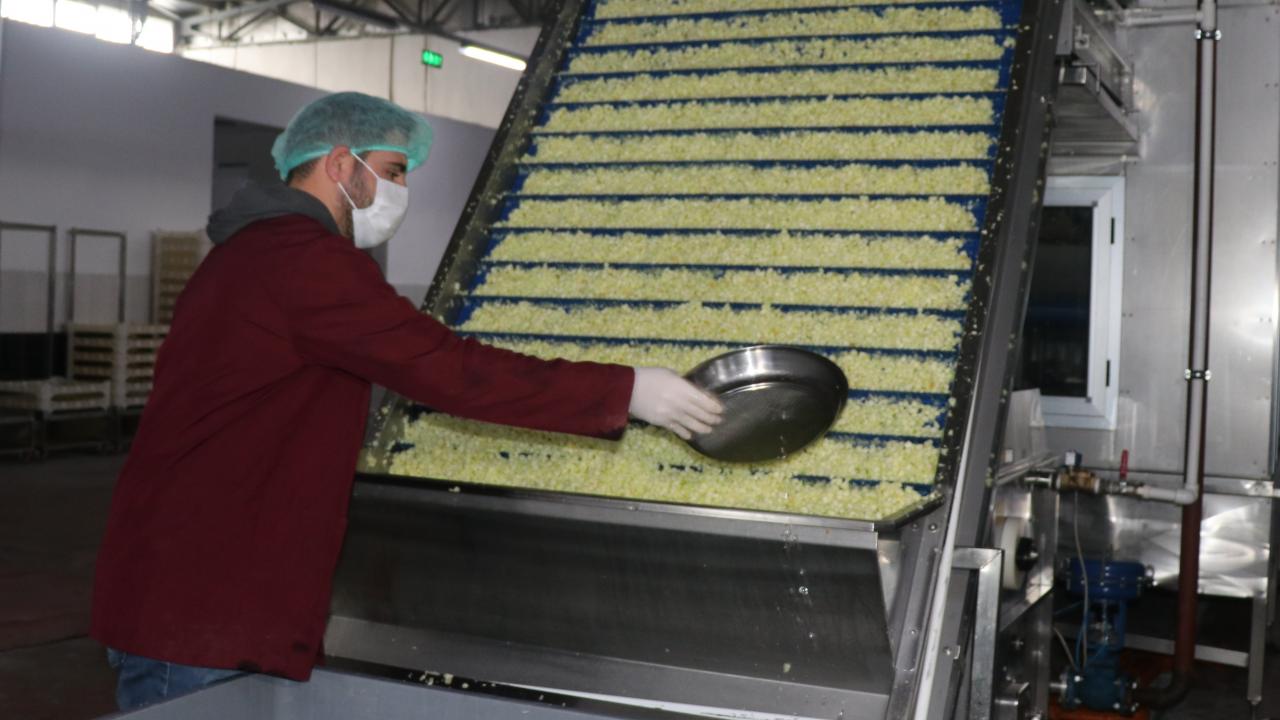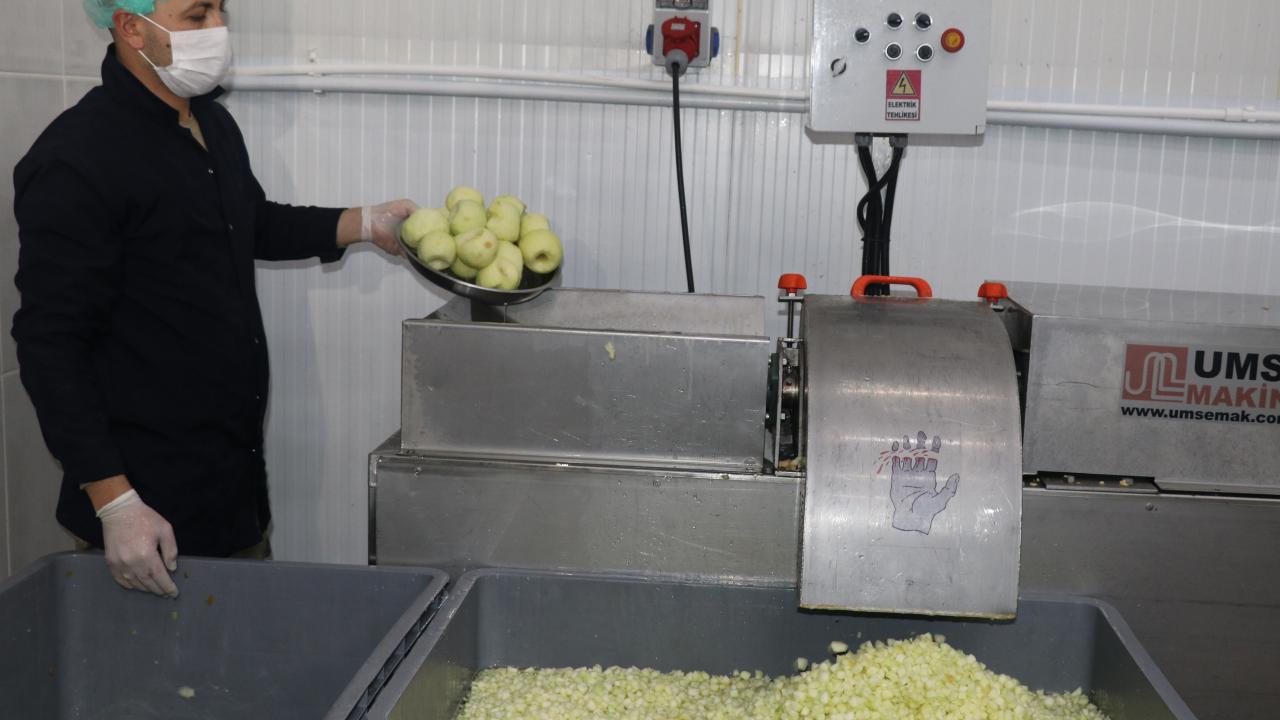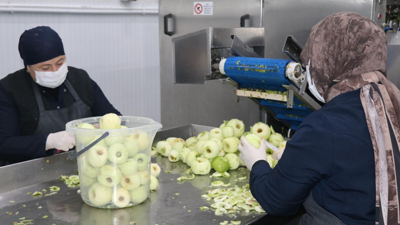 Yörede üretilen sebze ve meyveler, üç vardiya halinde faaliyet gösteren tesiste yıkama, soyma ve bölme işlemlerinin ardından kurutuluyor.
