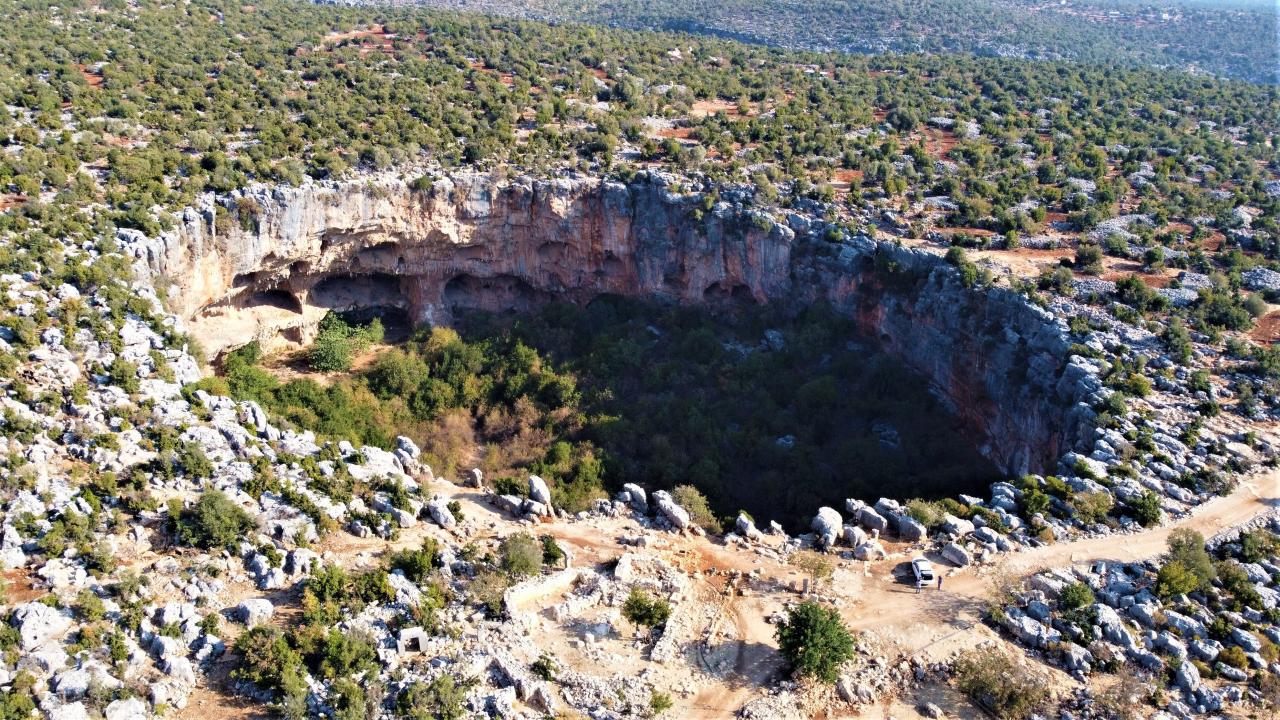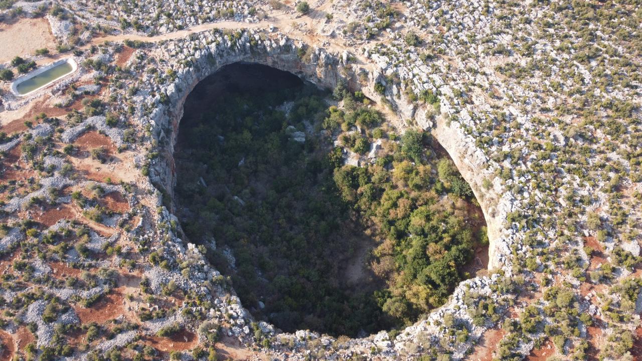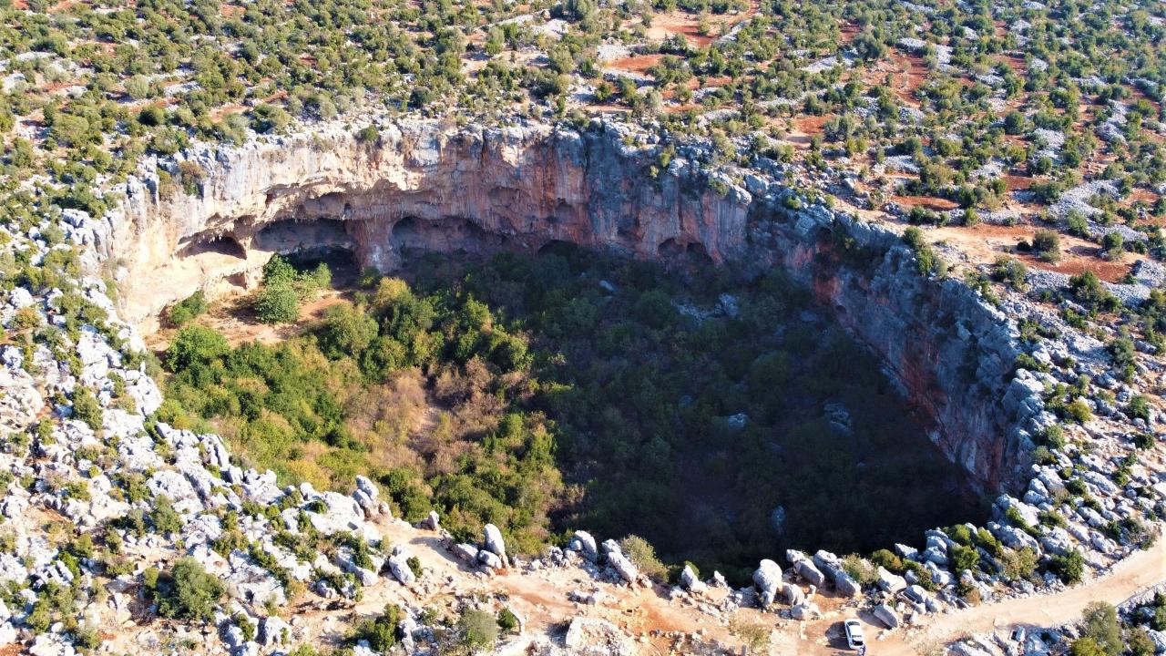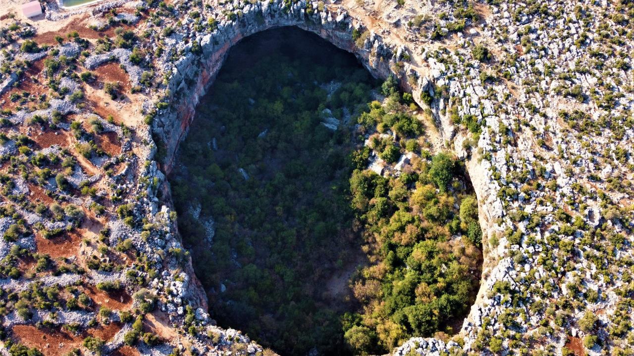 Mersin’de bulunan daha çok sosyal medyada paylaşılan ancak çok fazla kişinin yerini bilmediği doğallığı ile yüz yıllardır duran “Aşağı Dünya Obruğu” kuş bakışı ayrı bir güzel görüntüler sunuyor.