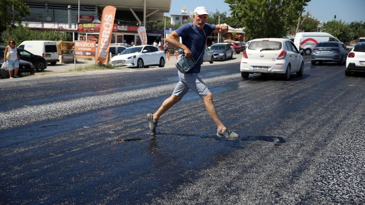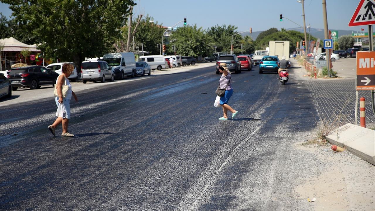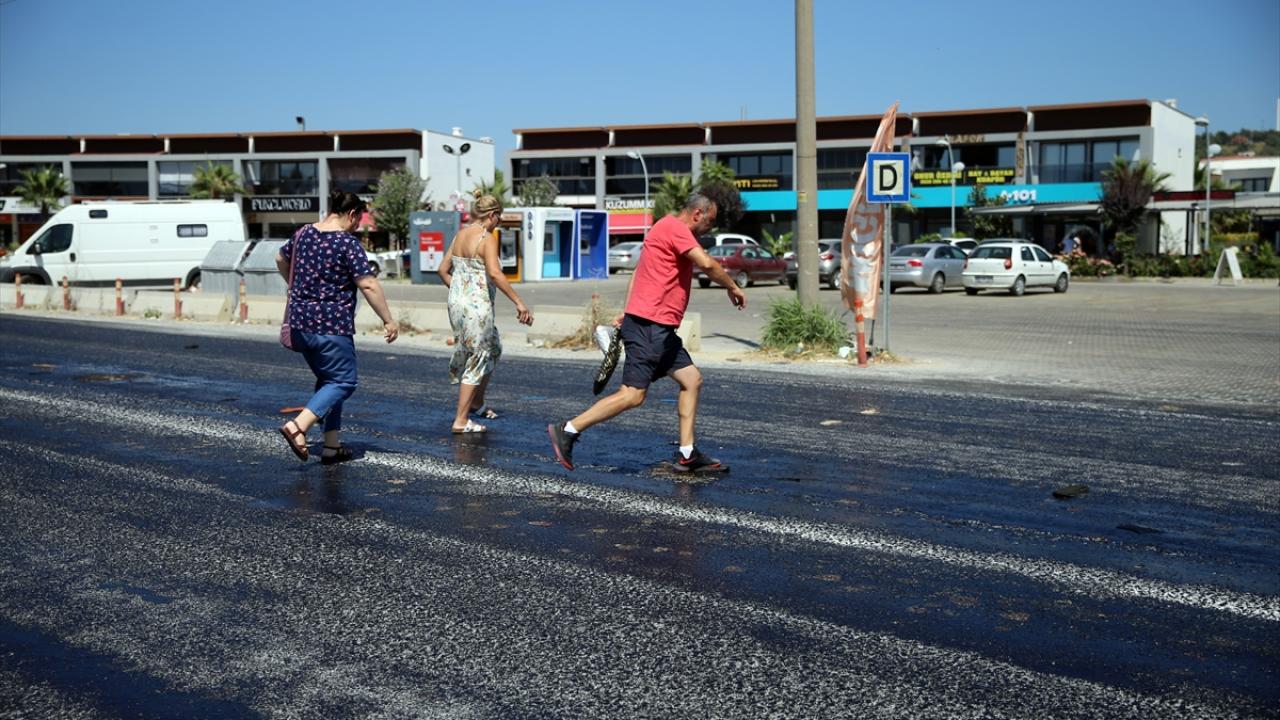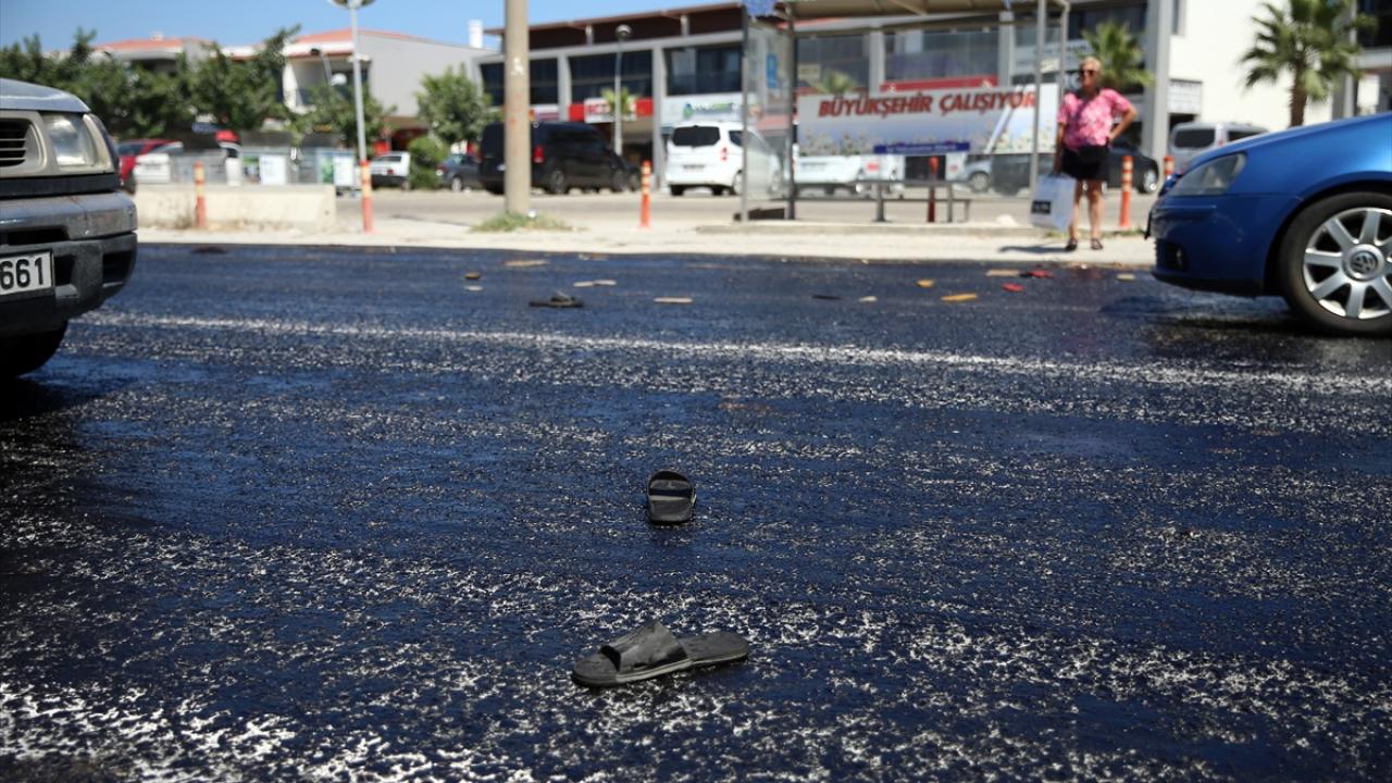 Kuşadası`nda Davutlar yolunda asfalt eridi. Eriyen asfalttan yolun karşısına geçmek isteyen vatandaşlar, zor anlar yaşadı. Bazı vatandaşların terliği, eriyen asfalta yapıştı.