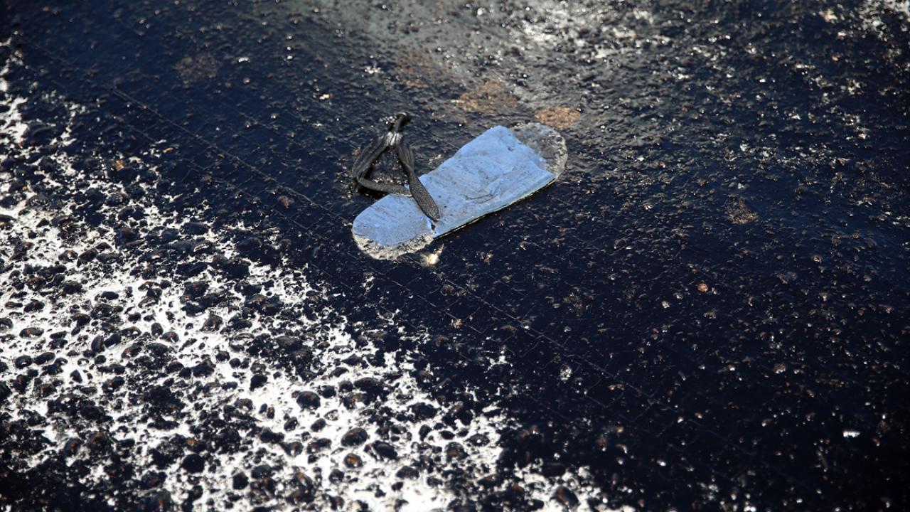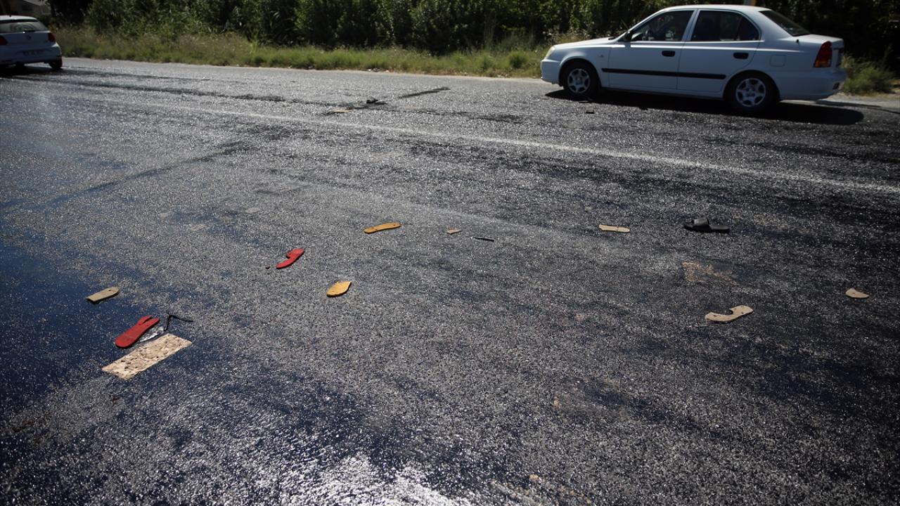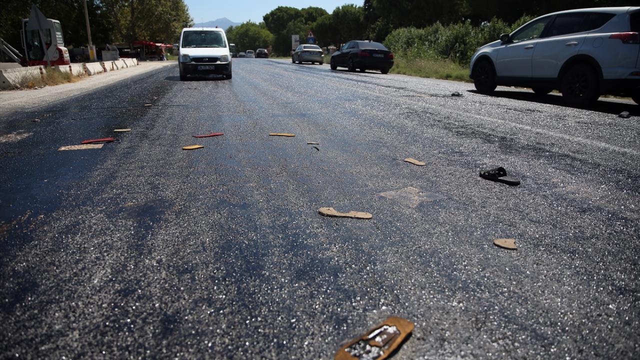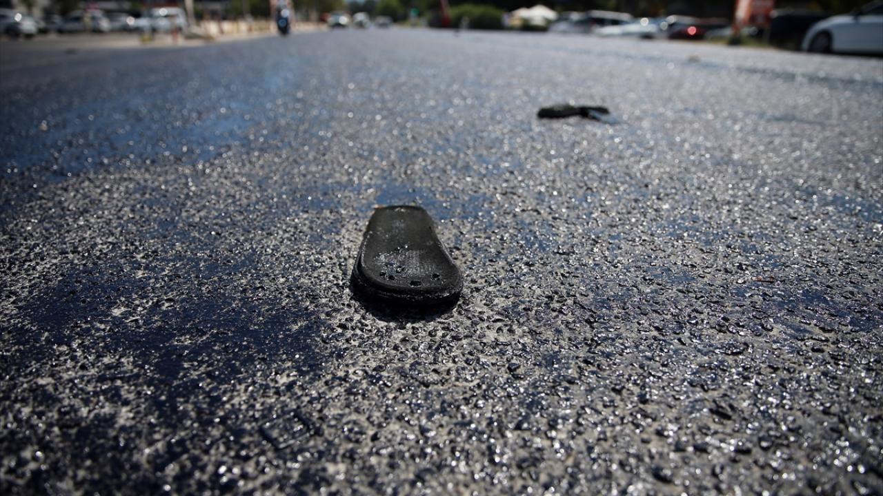 Kuşadası`nda Davutlar yolunda asfalt eridi. Eriyen asfalttan yolun karşısına geçmek isteyen vatandaşlar, zor anlar yaşadı. Bazı vatandaşların terliği, eriyen asfalta yapıştı.