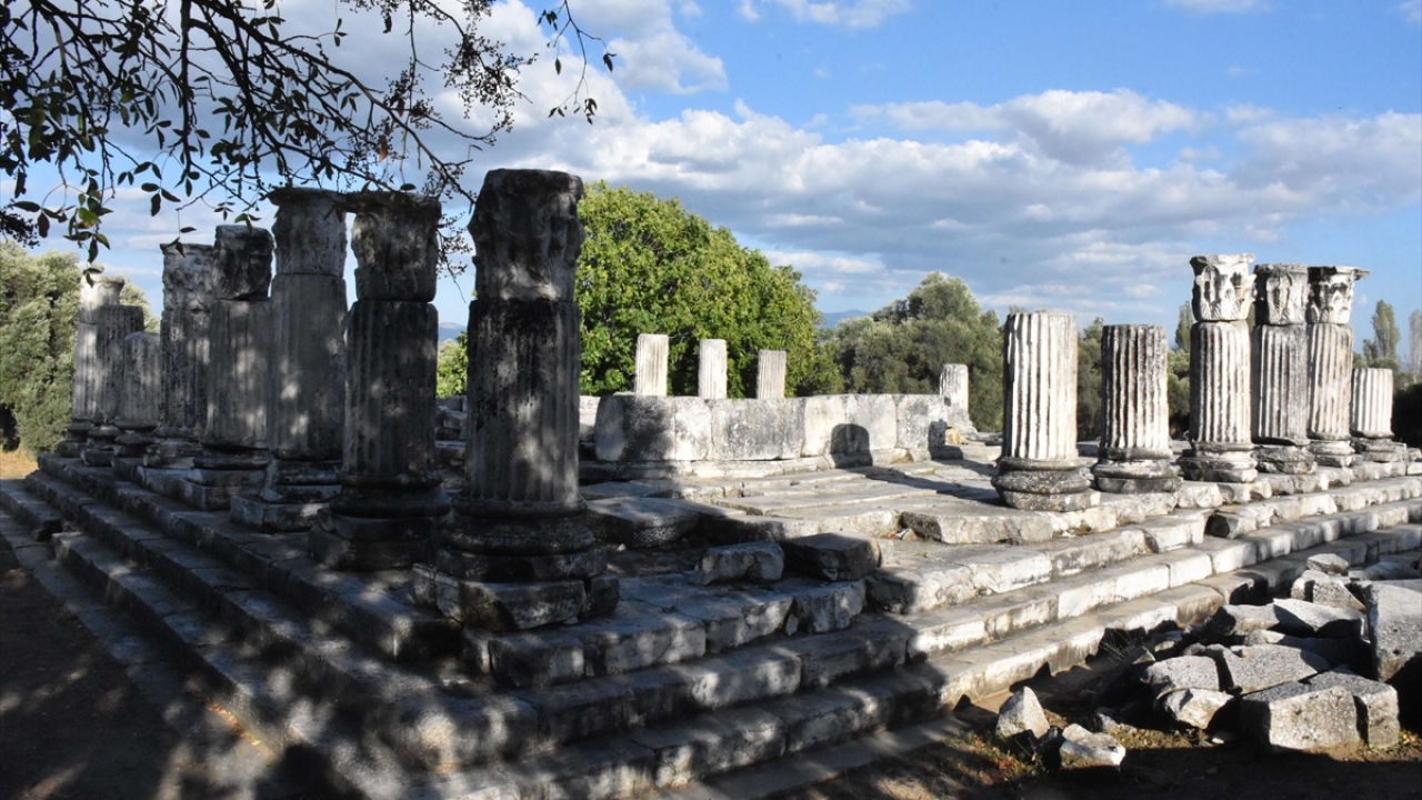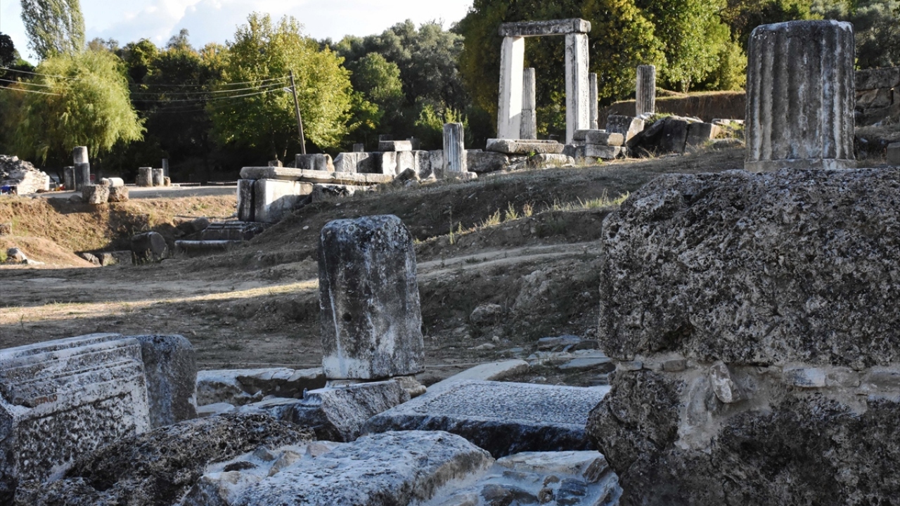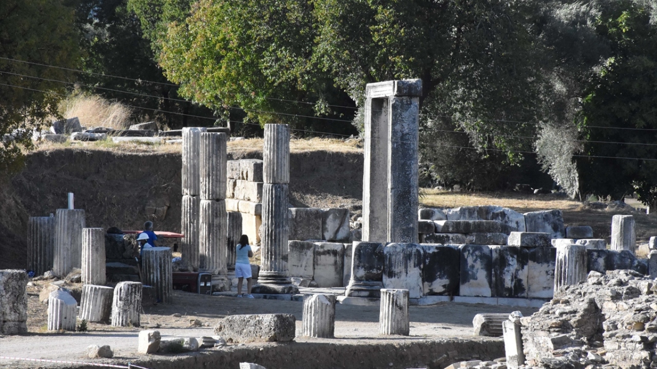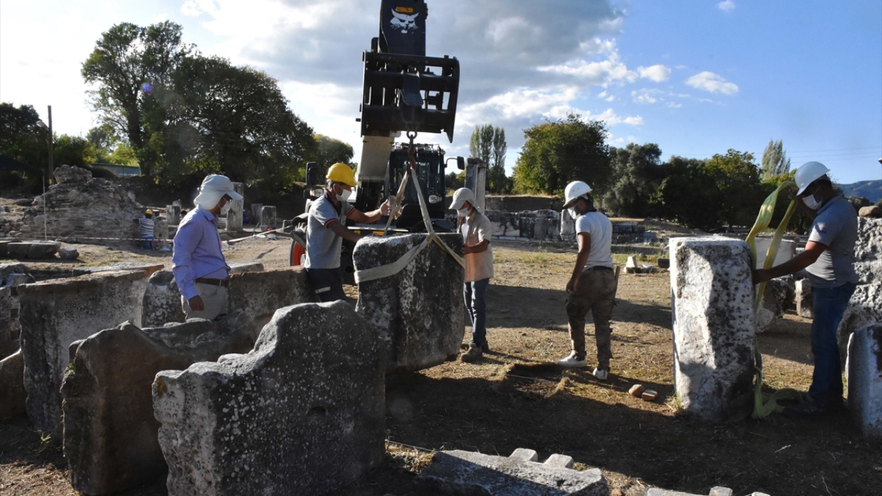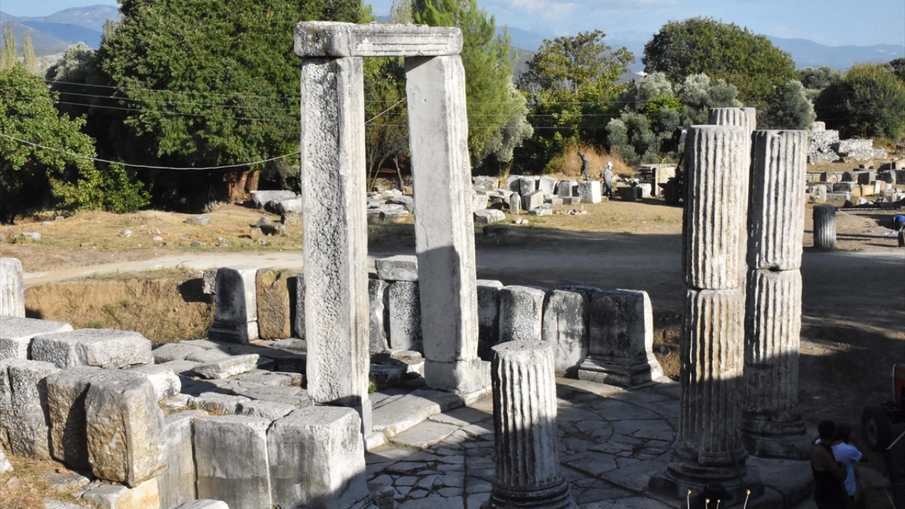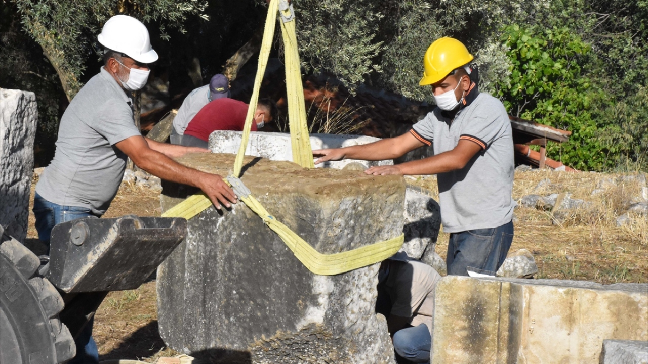 Muğla'nın Yatağan ilçesinde bulunan ve Pagan inanışının merkezi kabul edilen 3 bin yıllık Lagina Hekate Kutsal Alanı'nda yürütülen çalışmalarda, antik dönemde törenlerde kullanılan tören kapısının mimari blokları düzenleniyor.