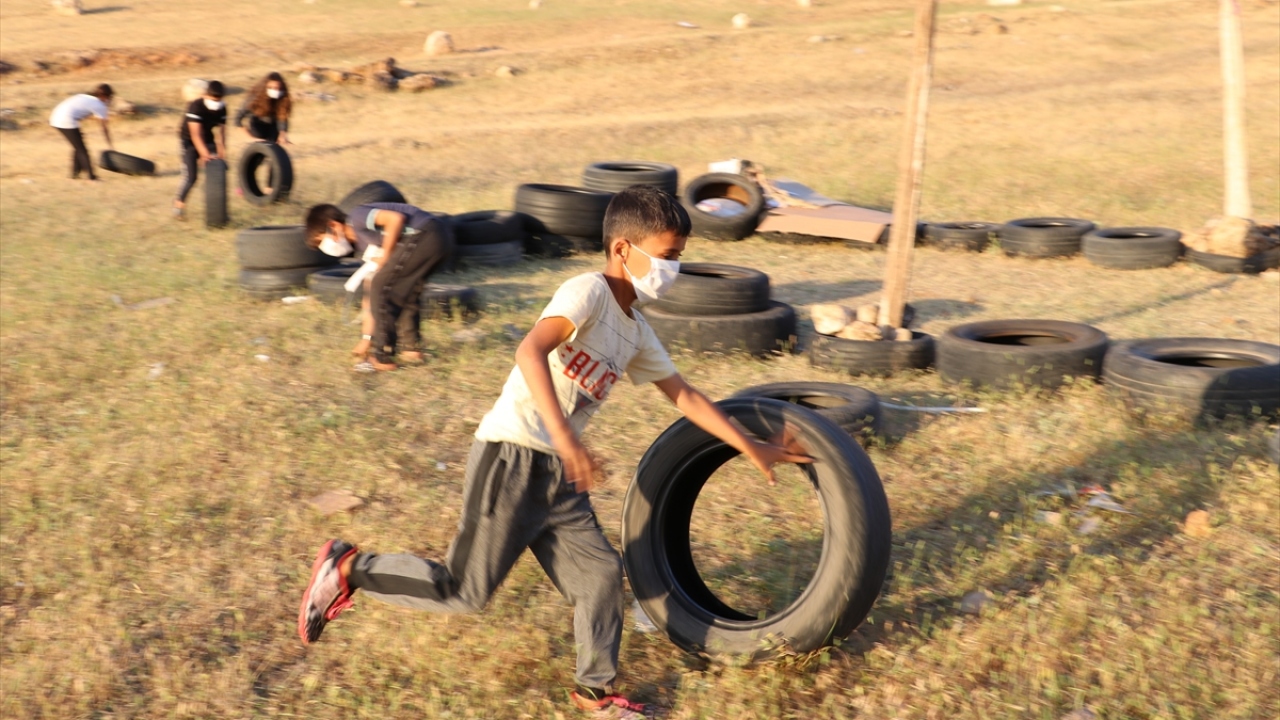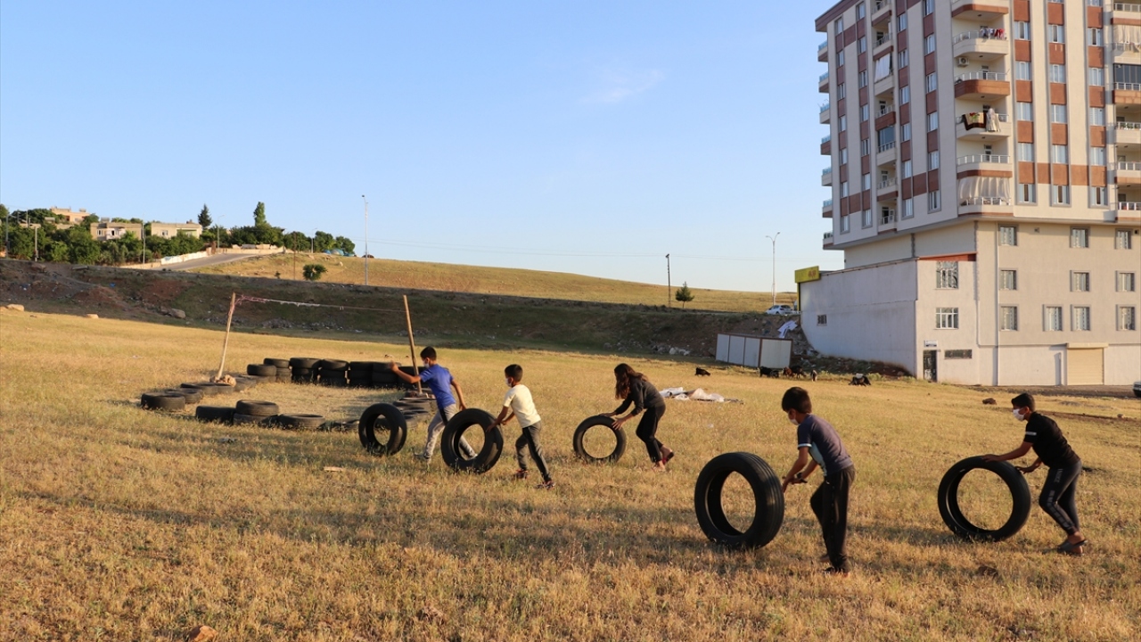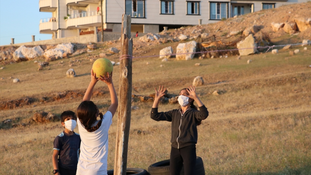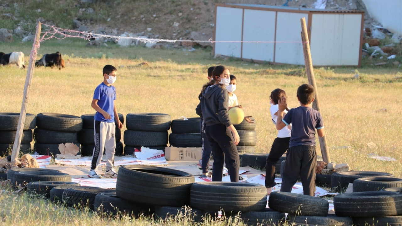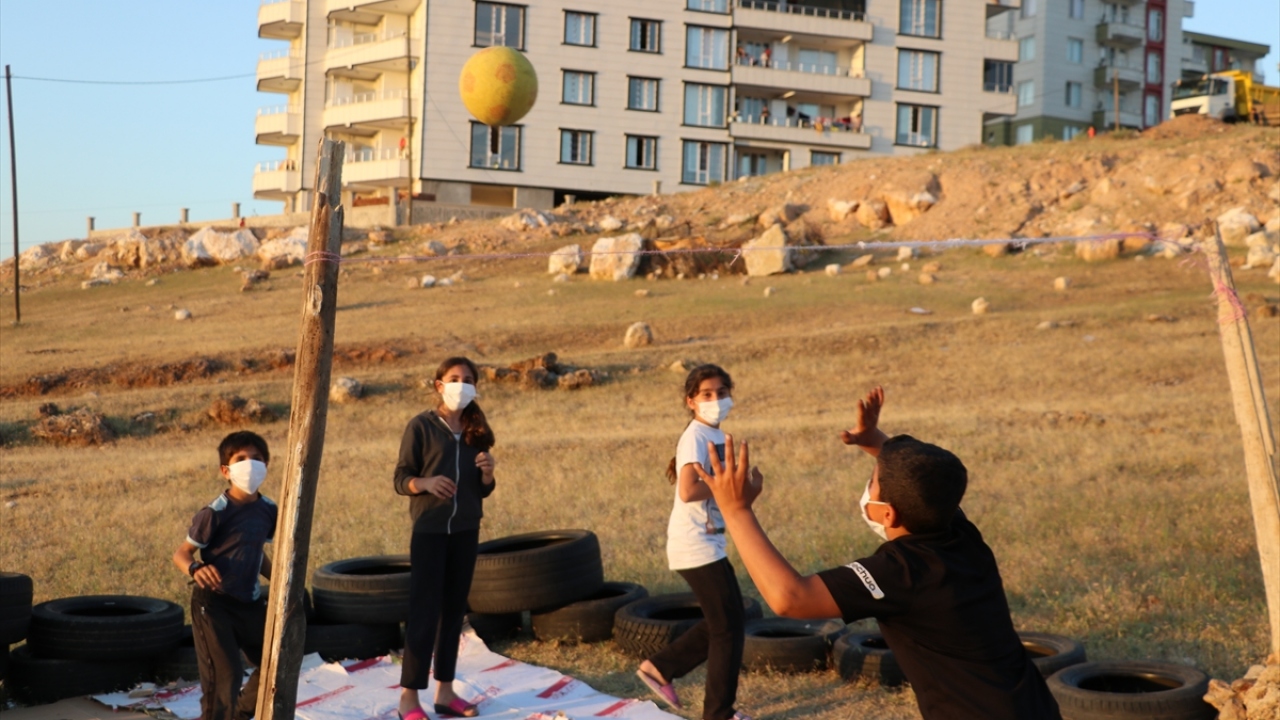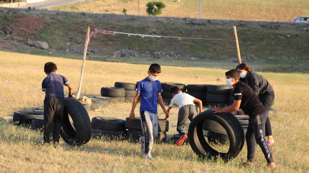 Siirt'te bir grup çocuk, kendi imkanlarıyla araç lastiklerinden yaptıkları voleybol sahasında, yeni tip koronavirüs (Covid-19) tedbirleri kapsamında oyun oynayarak stres atıyor.