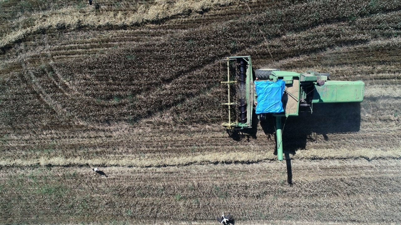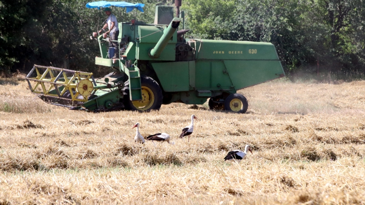İlkbaharda Kırklareli'ne göç eden leylekler, buğday hasadının sürdüğü tarlalarda biçerdöverlerin peşinden giderek ürünlerin arasındaki çekirge ve böceklerle beslenmeye çalışıyor.