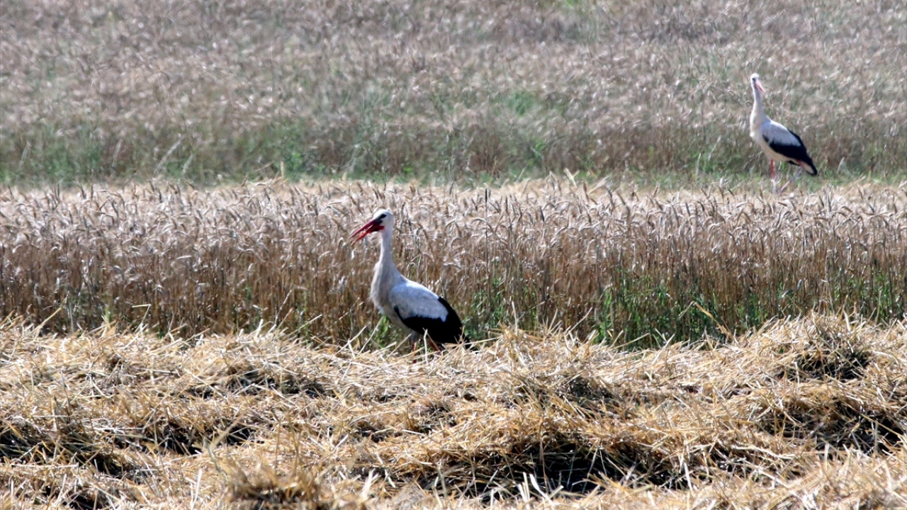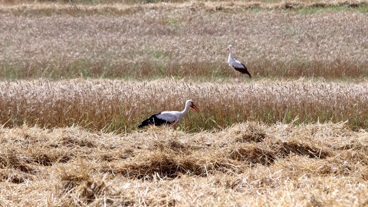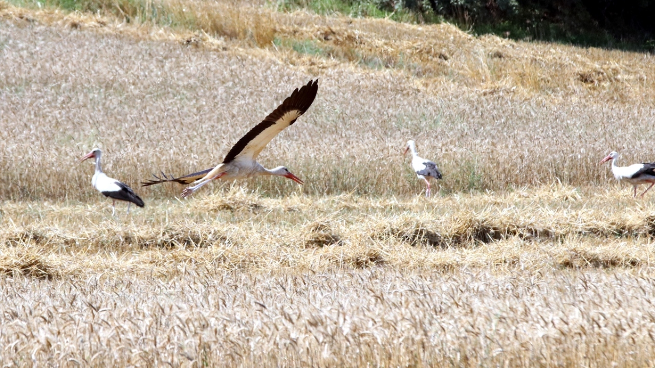 Biçerdöverin peşinden ilerleyen leylekler, ekinlerin arasındaki çekirge ve böceklerle besleniyor.