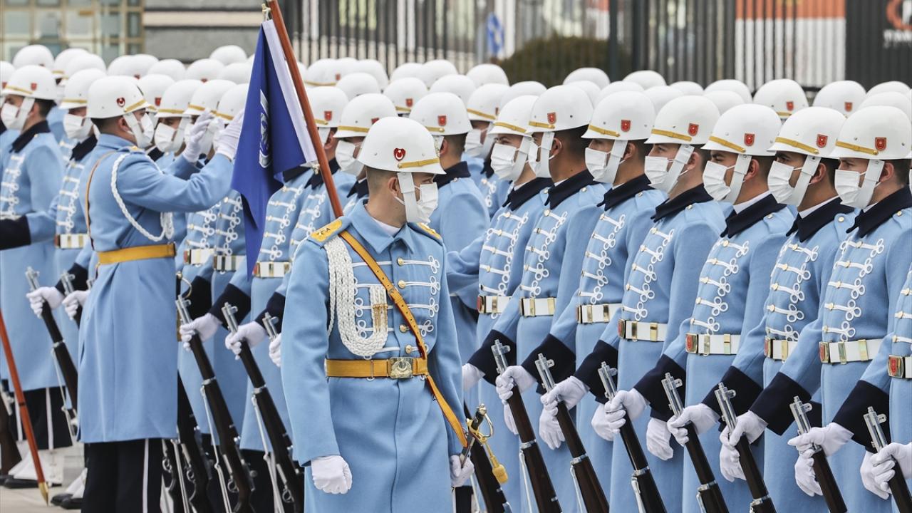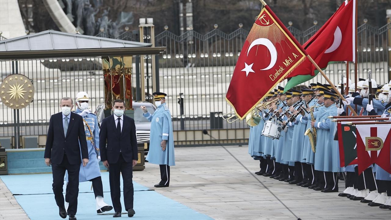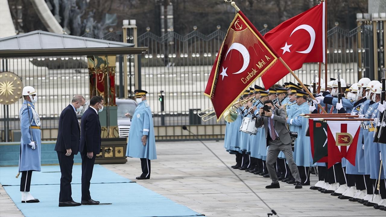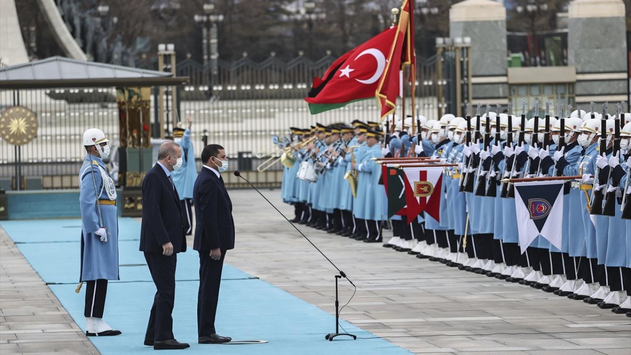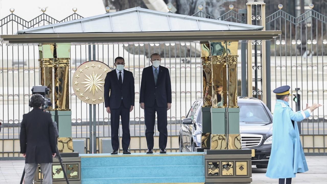 Erdoğan ve Dibeybe`nin tören alanındaki yerlerini almalarının ardından, iki ülke milli marşları çalındı, 21 pare top atışı yapıldı.